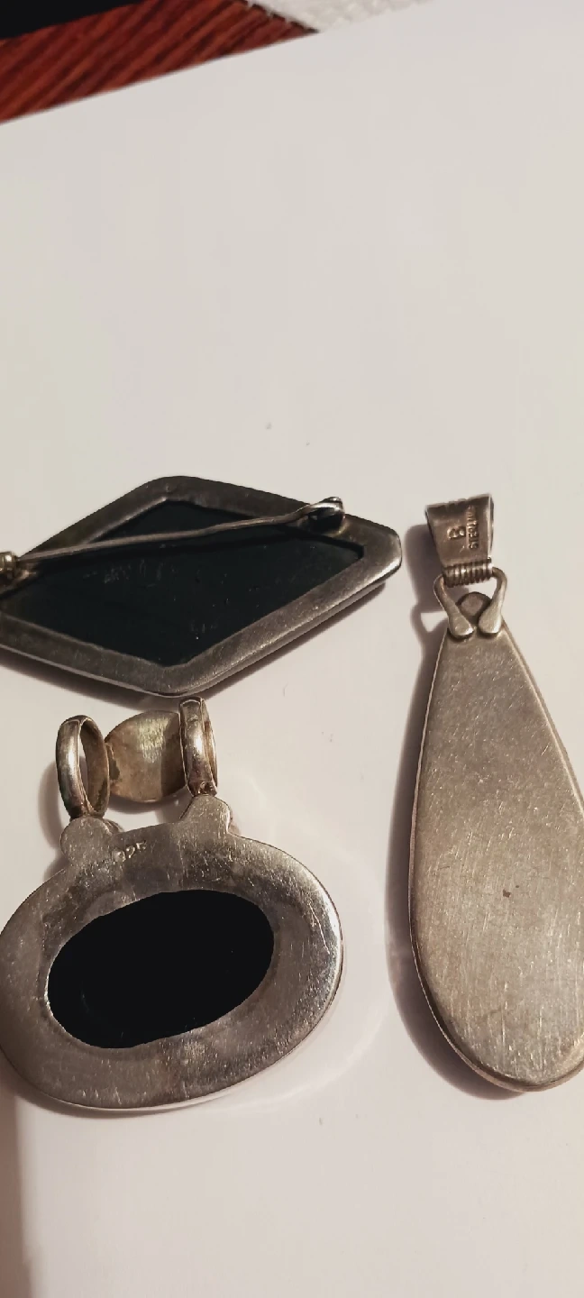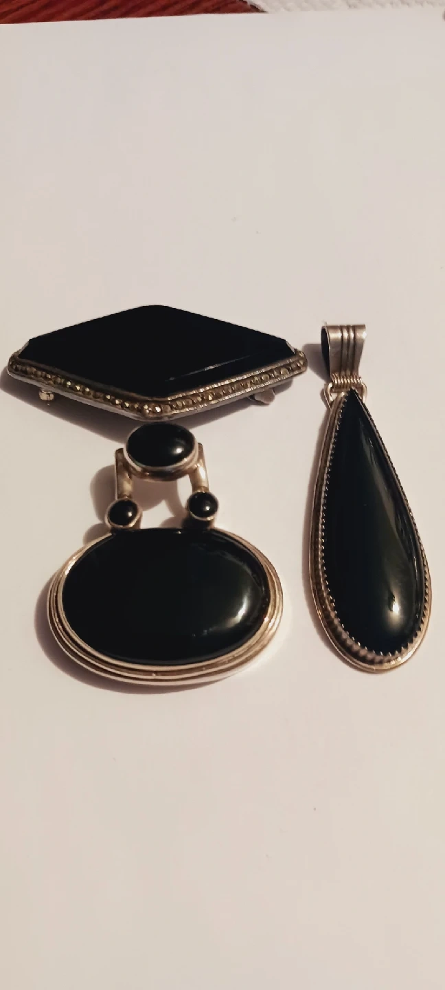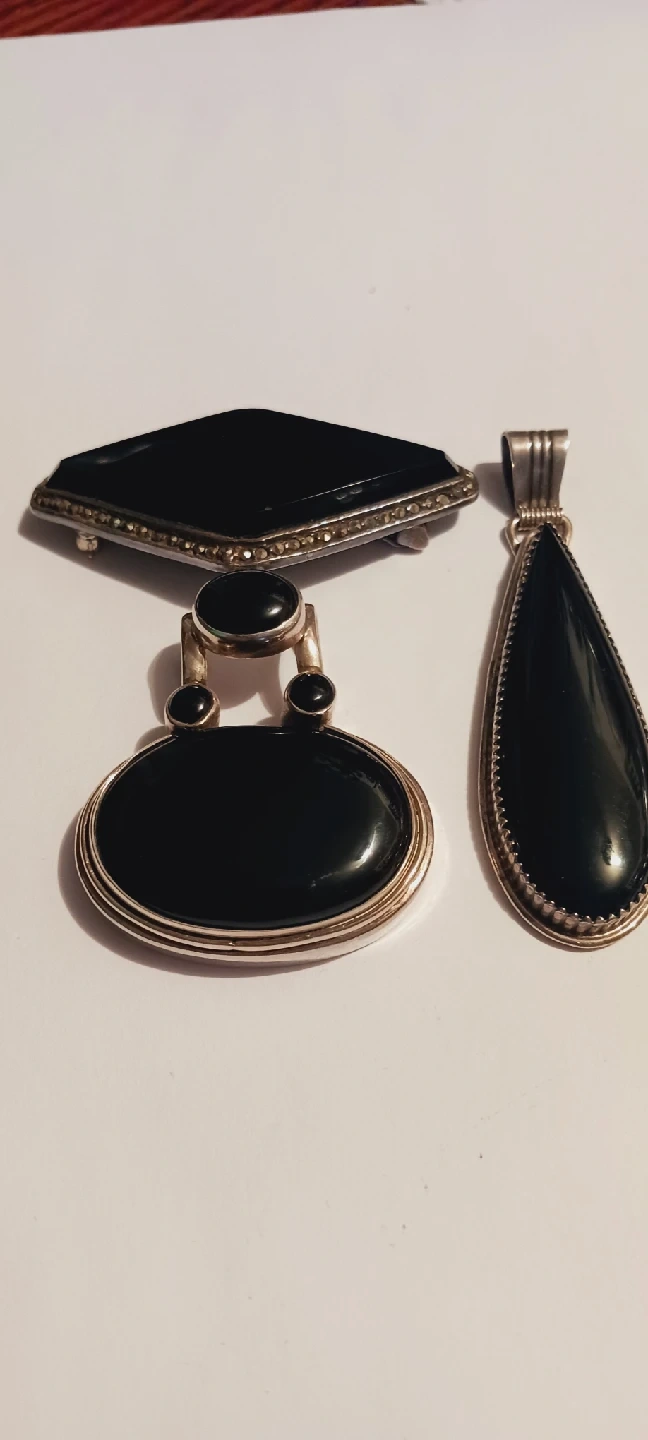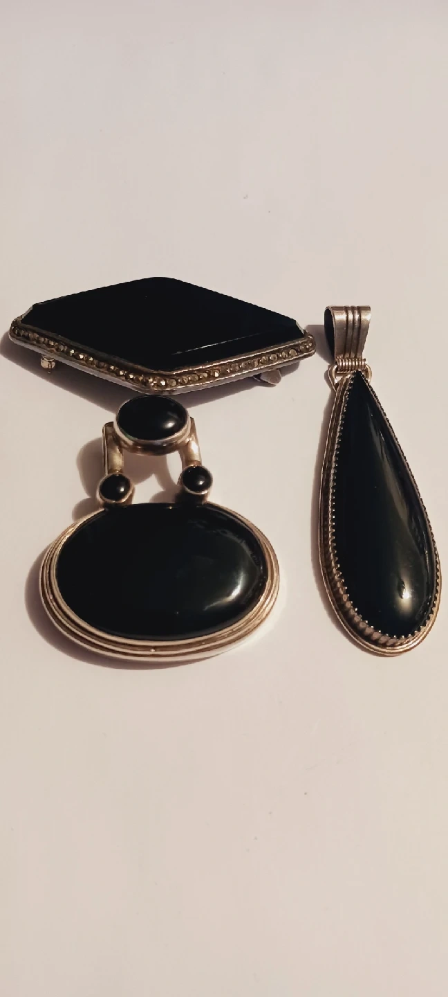 1000+LOT OF 3 GORGEOUS VINTAGE SOLID STERLING SILVER 925 STAMPED GENUINE BLACK ONYX GEMSTONES TWO PENDANTS AND ONE BROOCH .Selling a set of vintage jewelry featuring onyx and sterling silver. The set includes a brooch and two pendants. The pendants are 2"×2" , 3"×1". and the brooch is 2"×1.5". They are all in excellent condition. ALL stamped 925. ALL MY PRICES ARE NEGOTIABLE !!!