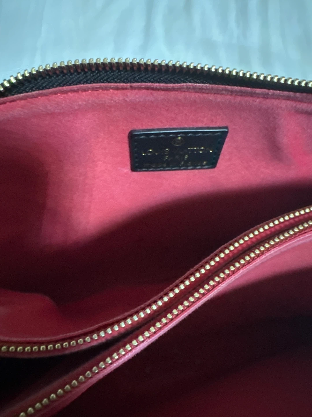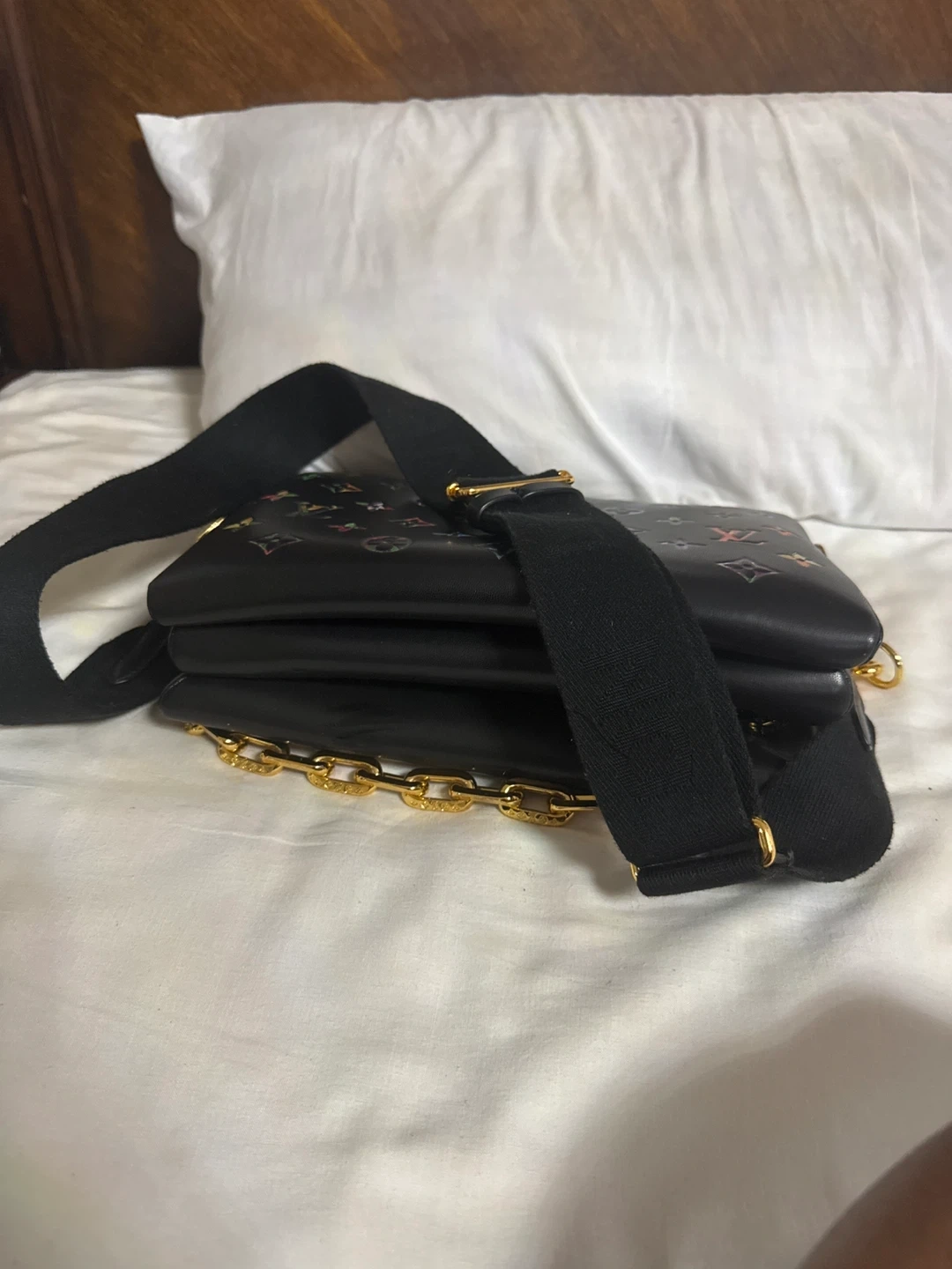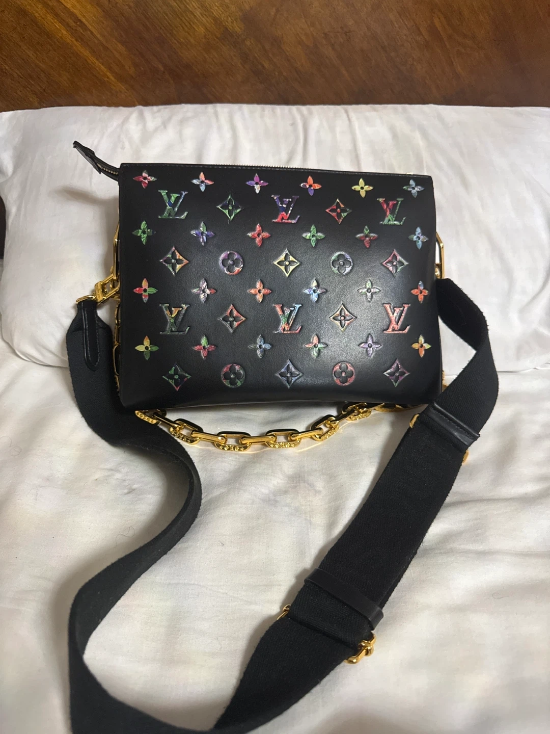 Selling a stylish Louis Vuitton crossbody bag in black leather! It features a unique design with colorful LV logos and flower patterns. The bag has a black strap and a gold chain accent. The interior is lined with a vibrant pink fabric. It's in great condition and ready for a new home