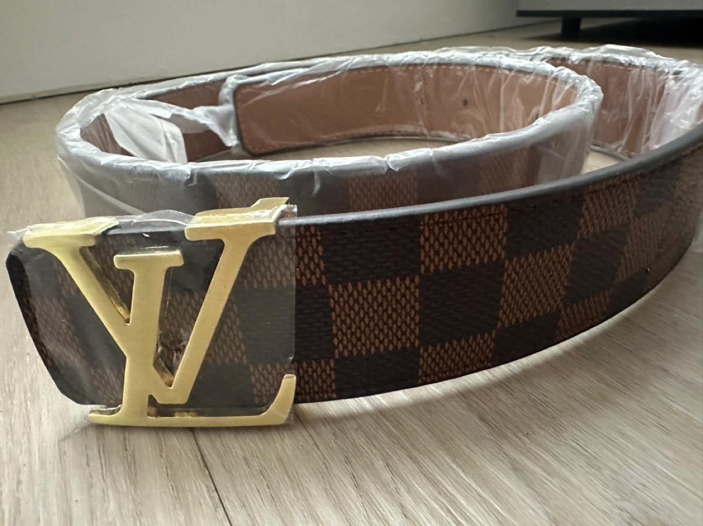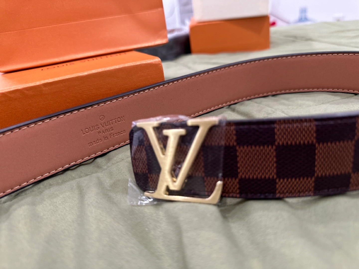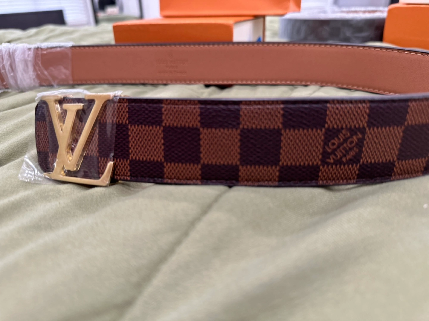 10Brown and tan checkered belt with a gold buckle. Made in France.