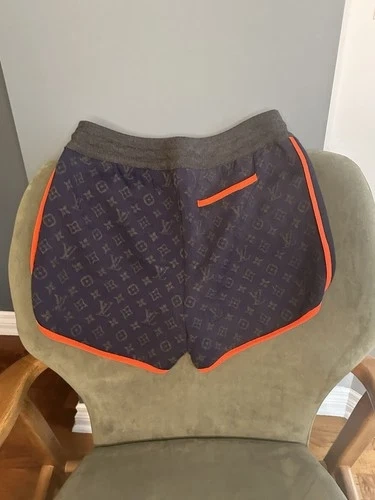71Navy color Orange details Grey Louis Vuitton monogram on back Two front pockets Size Medium & Condition NEW Measurements: Waist - 15 inches Inseam - 2 inches Leg Opening - 10 inches Front Rise - 11 inches Thigh - 10 inches Composition: 30% Polyamide 30% Wool 19% Cashmere 17% Silk 3% Viscose 1% Elastane Est. Retail$1320
