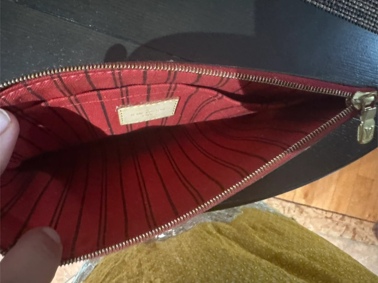 10Selling a Louis Vuitton Neverfull MM tote bag. It's in good condition and features the classic LV monogram pattern. The interior is a vibrant red color. Comes with a matching pouch!