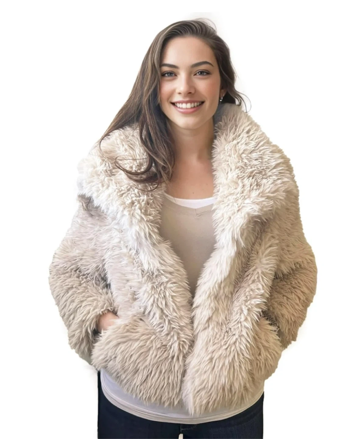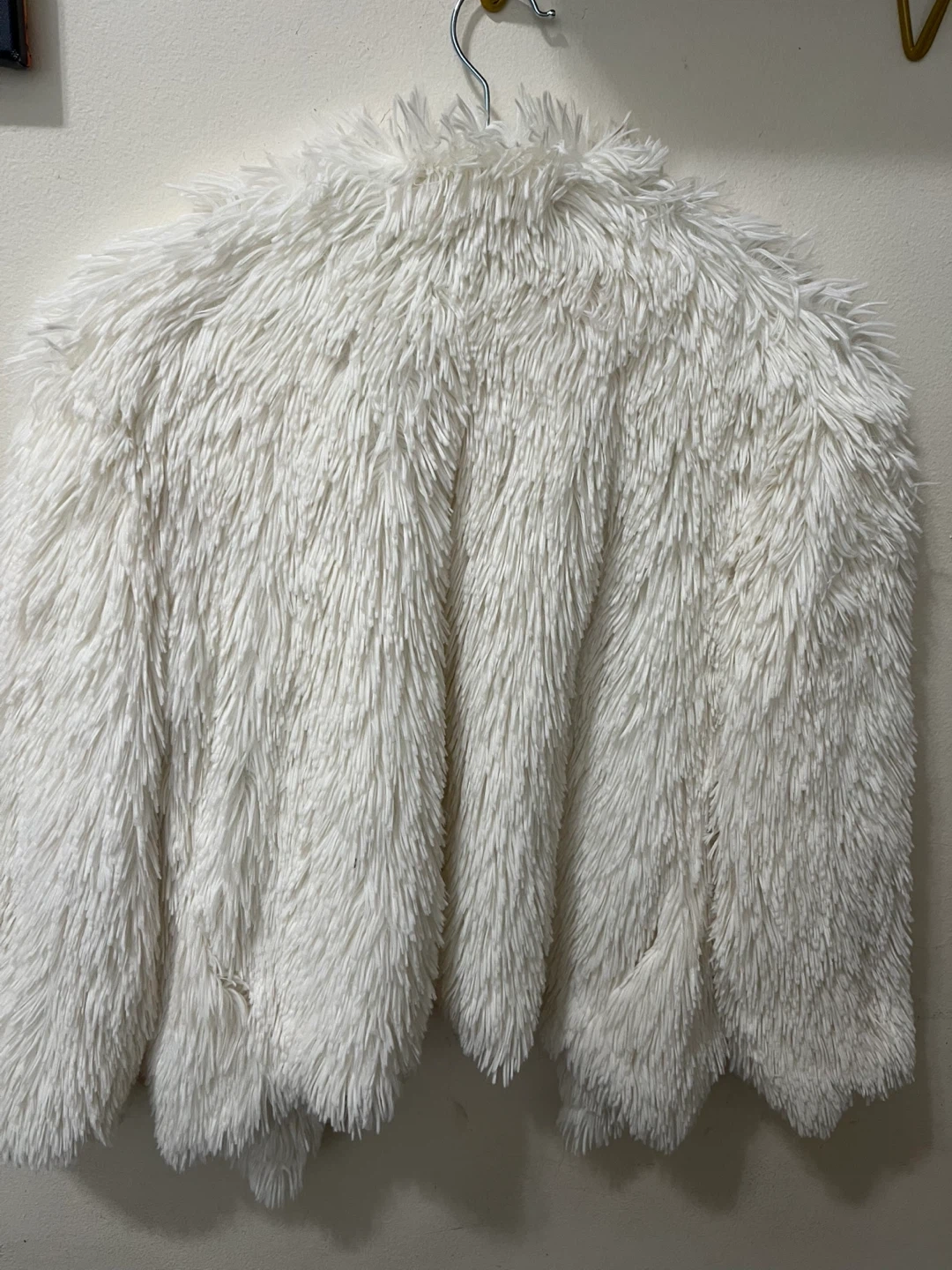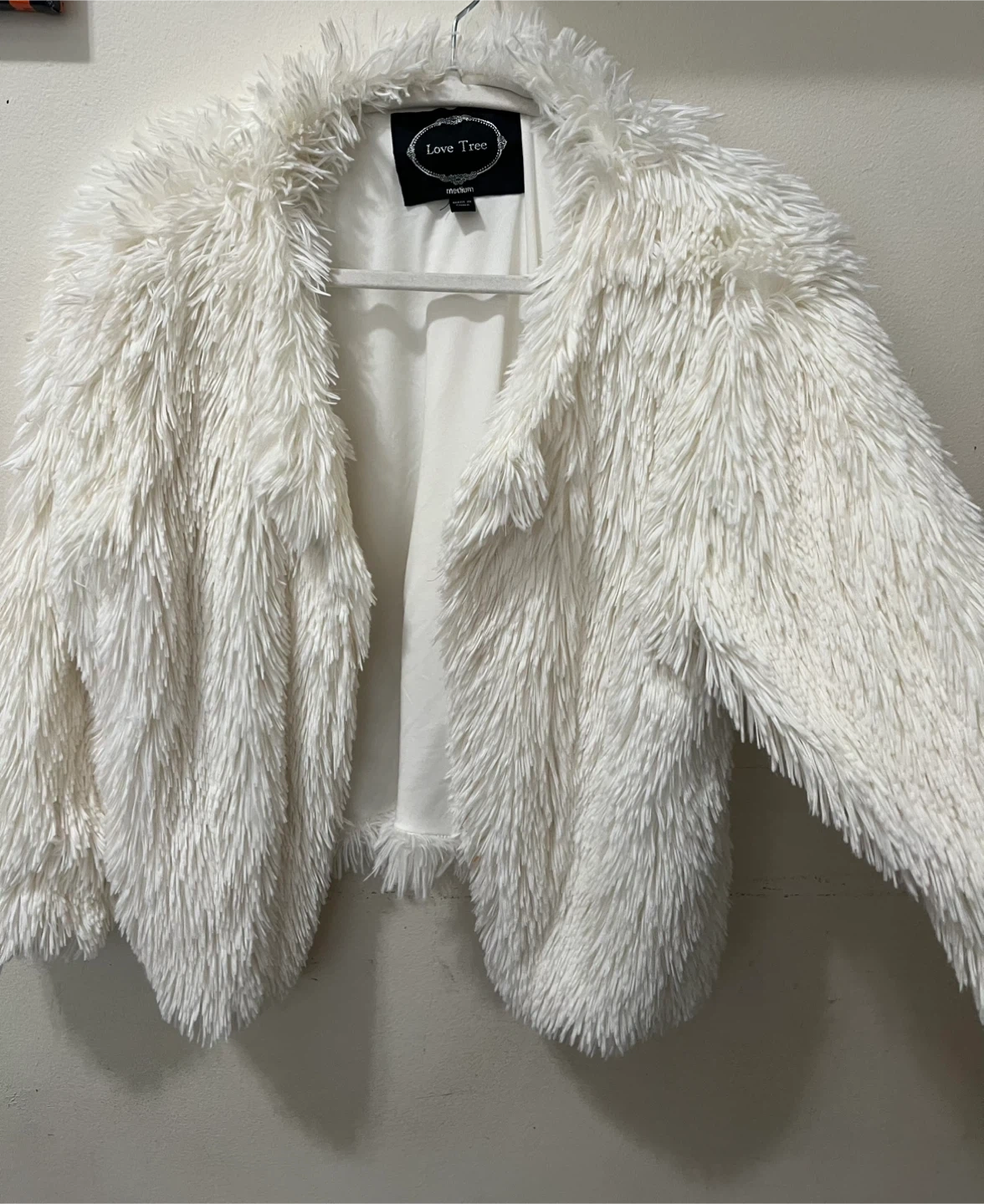 60Here's a cozy white faux fur jacket from Love Tree! It's a size medium and in great condition. Perfect for adding a touch of warmth and style to any outfit