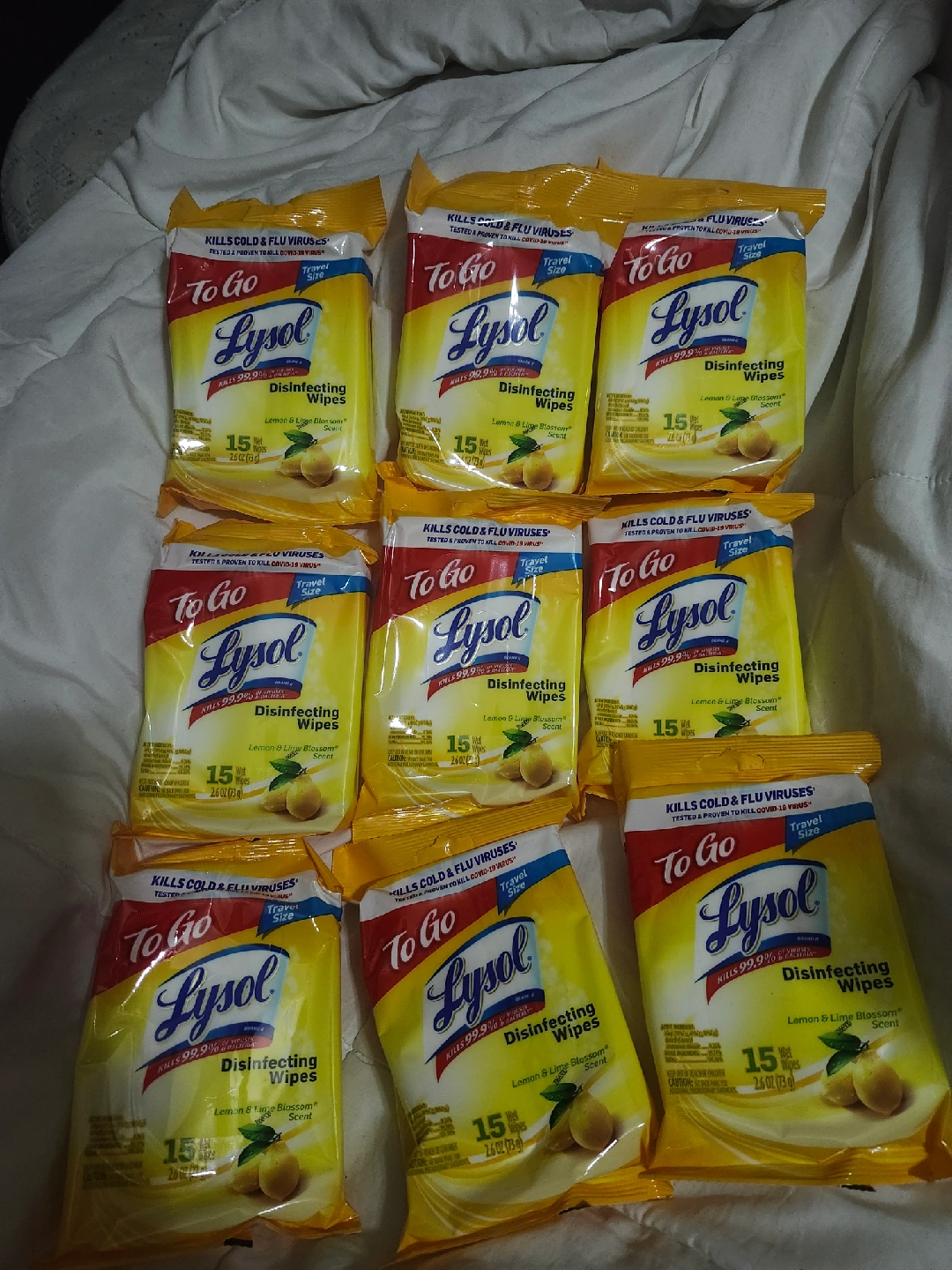625I have 9 travel-sized packs of Lysol To Go Disinfecting Wipes. They have a refreshing Lemon & Lime Blossom scent and are perfect for on-the-go use. Each pack contains 15 wipes and kills 99.9% of viruses and bacteria. Great for travel!