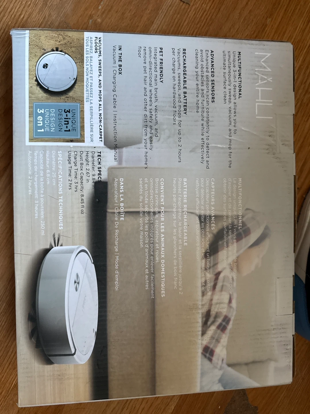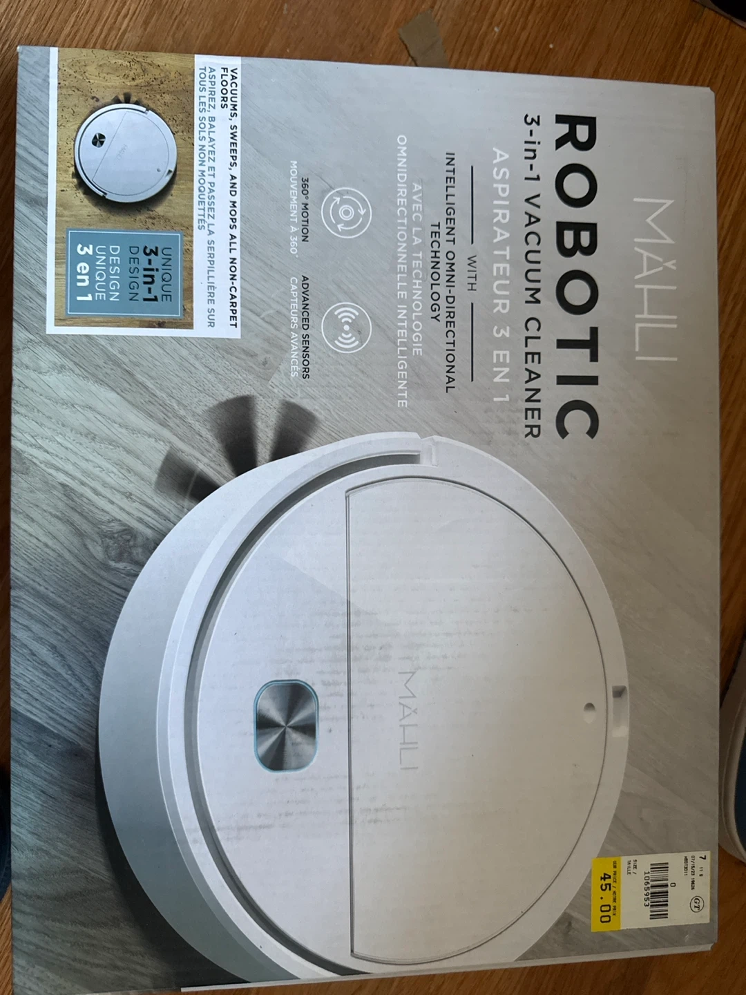 I'm selling a brand new MäHLI 3-in-1 robotic vacuum cleaner! This unique design allows you to simultaneously sweep, vacuum, and mop for the ultimate surface clean. It features: - Advanced sensors to constantly detect and avoid obstacles and furniture while effectively cleaning your entire home - Rechargeable battery that vacuums, sweeps, and mops for up to 2 hours per charge in hardwood floors - Pet friendly: integrated main brush, vacuum, and omni-directional wheels safely and easily remove pet hair and other dirt from your home's floor Includes vacuum, charging cable, and instruction manual
