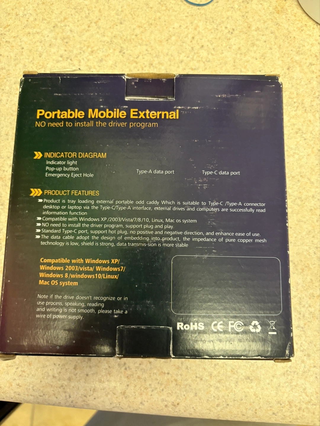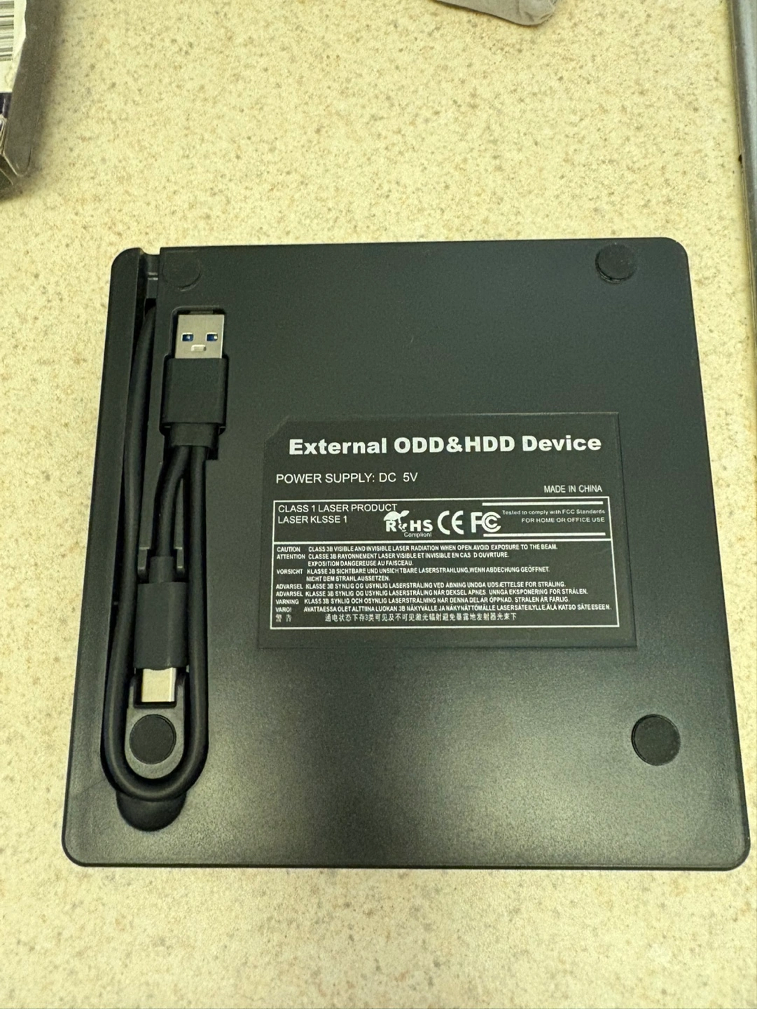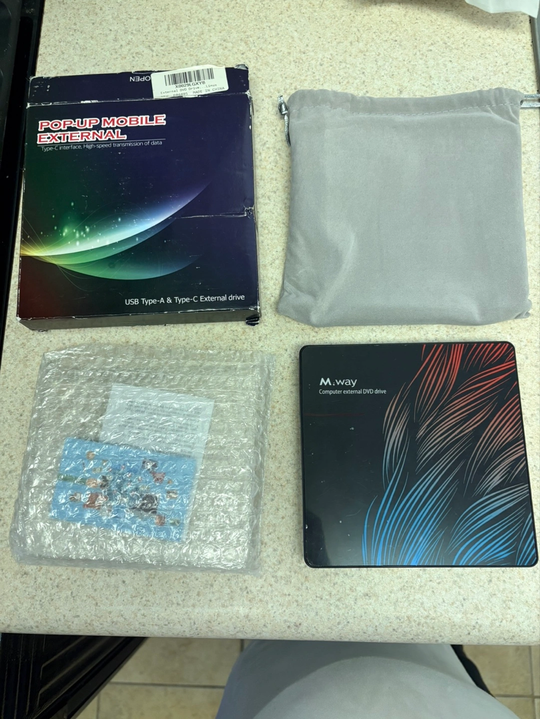 A portable mobile external DVD drive. It comes with a USB Type-A and Type-C external drive, as well as its original box and some accessories. You'll be able to enjoy your favorite media after you plug this in.