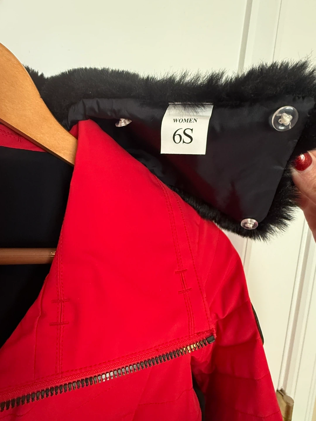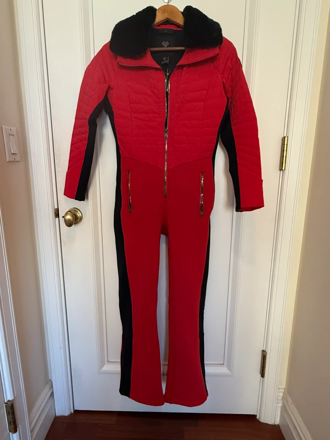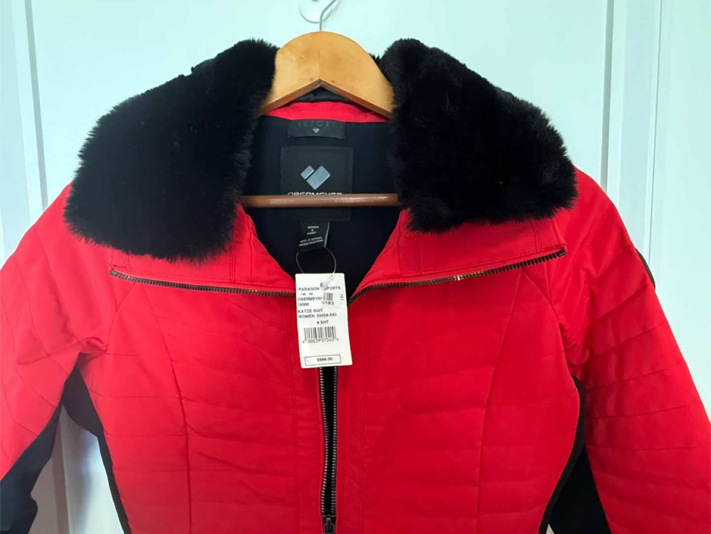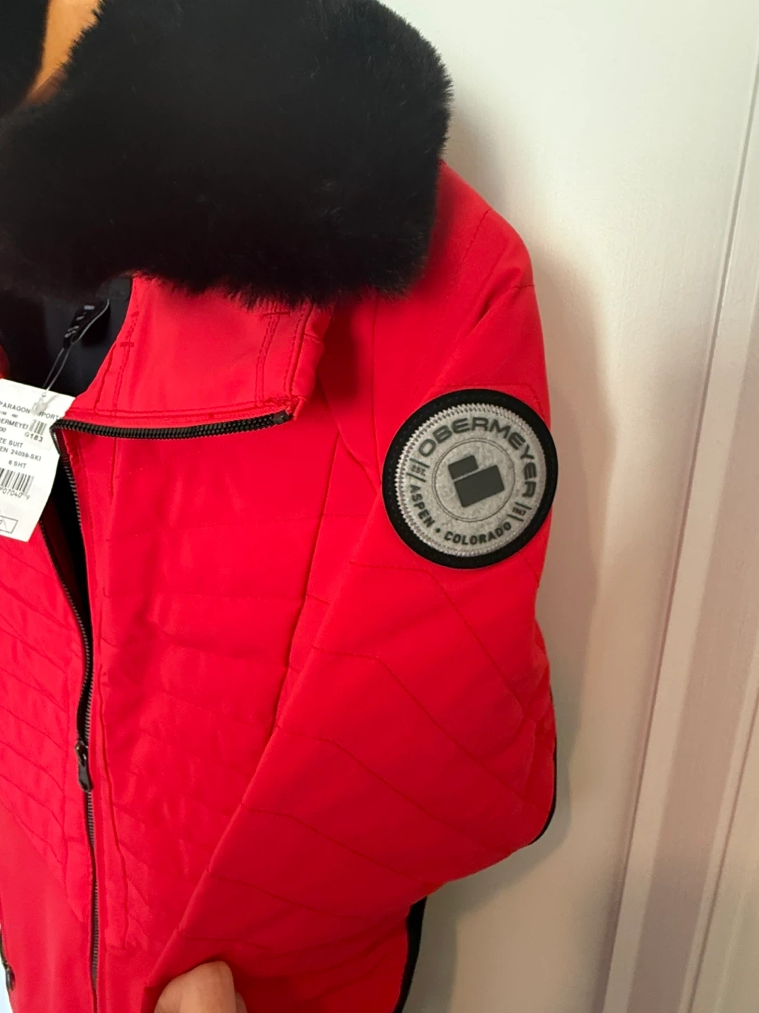 Obermeyer women's ski suit in a vibrant red and black color scheme! This stylish and functional suit is perfect for hitting the slopes. It's a size 6S (I usually wear US 2 or 4 so perfect fit). The suit features a faux fur collar for added warmth and a sleek design. Originally bought for $699!