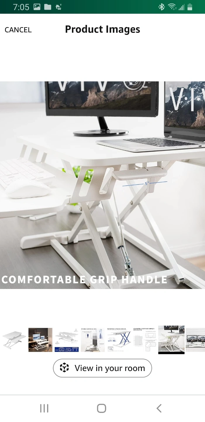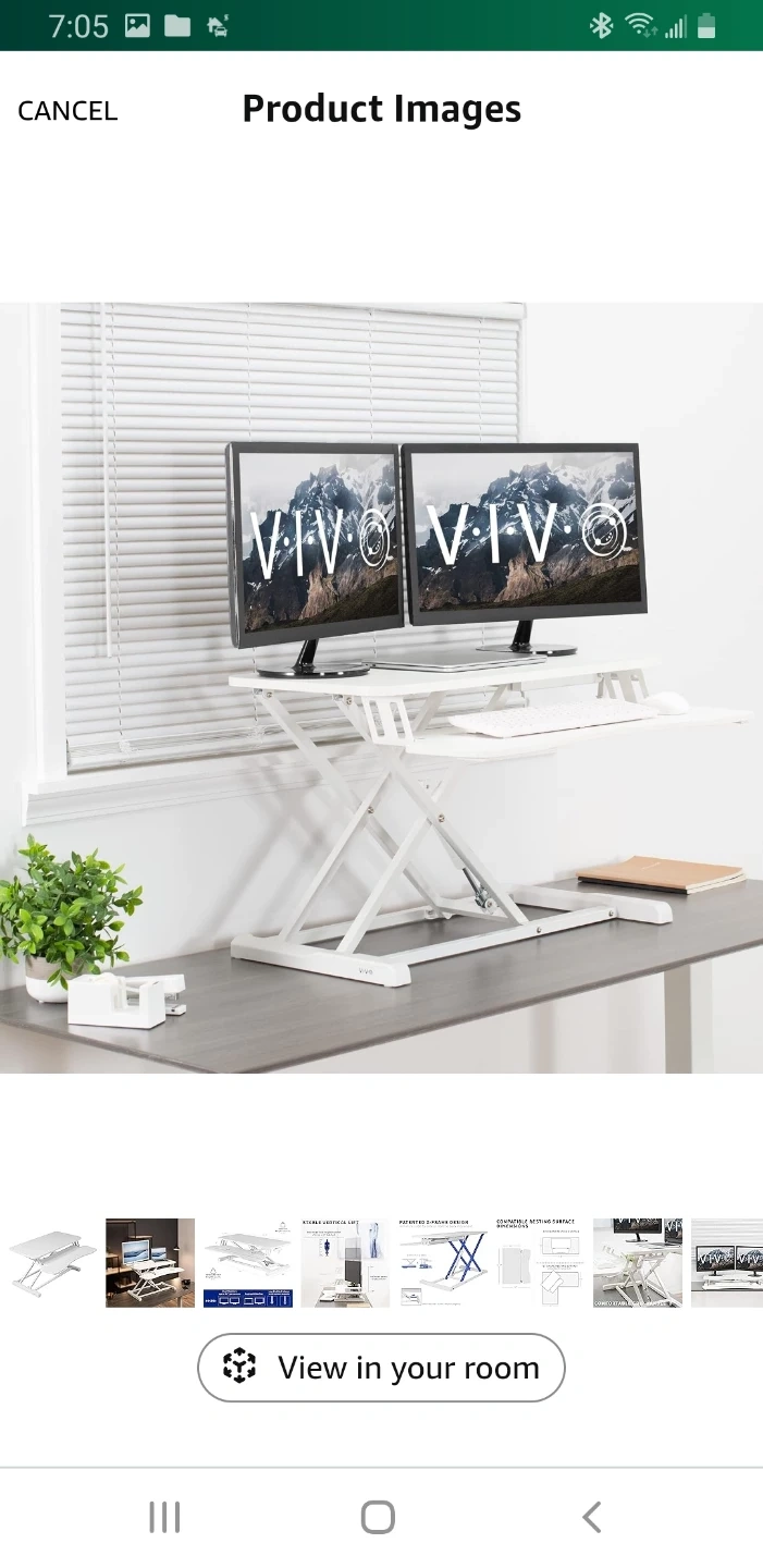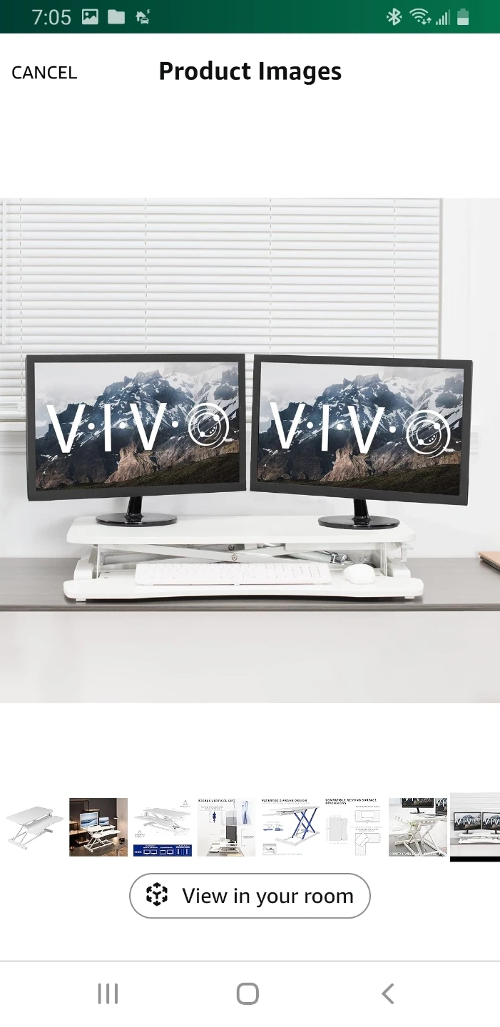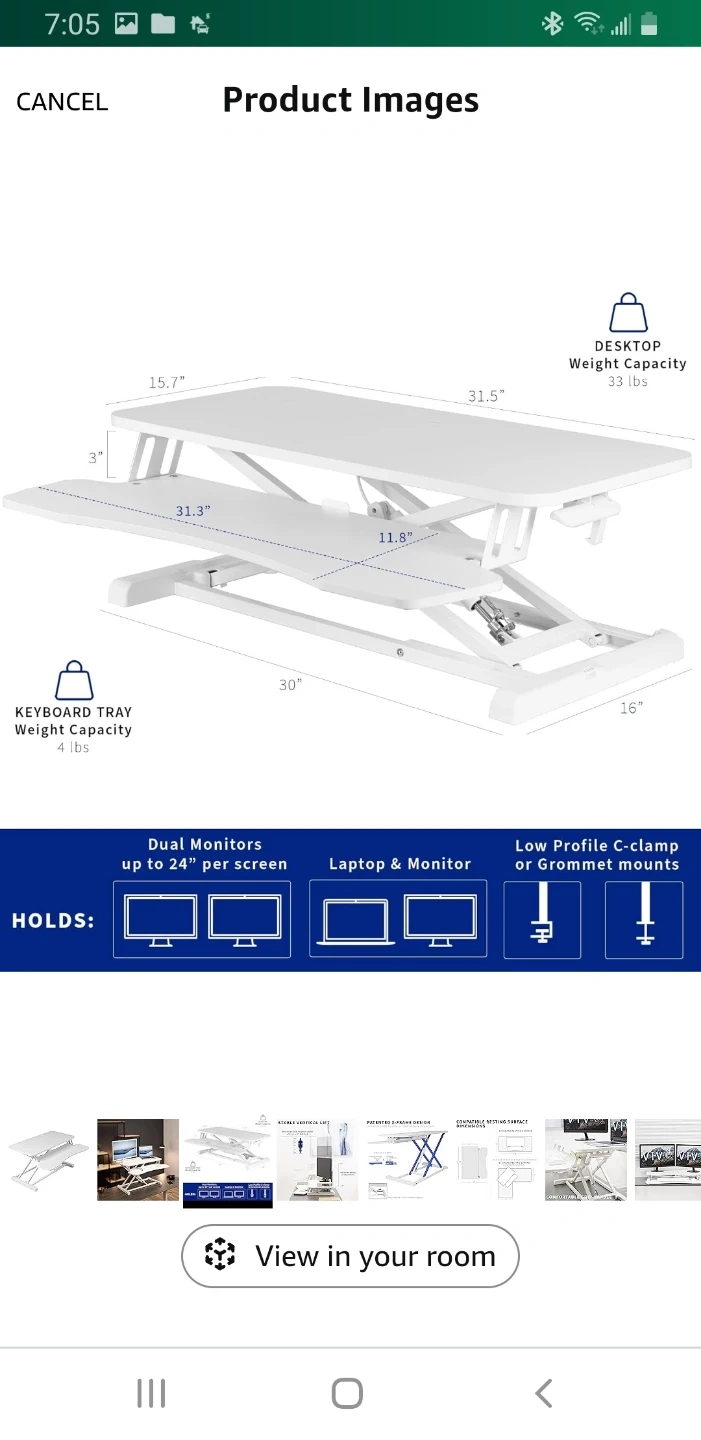 This VIVO standing desk converter is white and offers a comfortable grip handle. It supports dual monitors up to 24" per screen and has a desktop weight capacity of 33 lbs. The keyboard tray holds 4 lbs.
