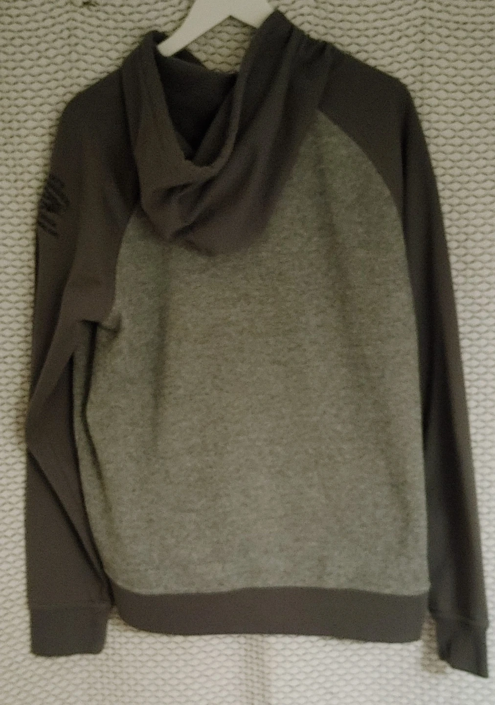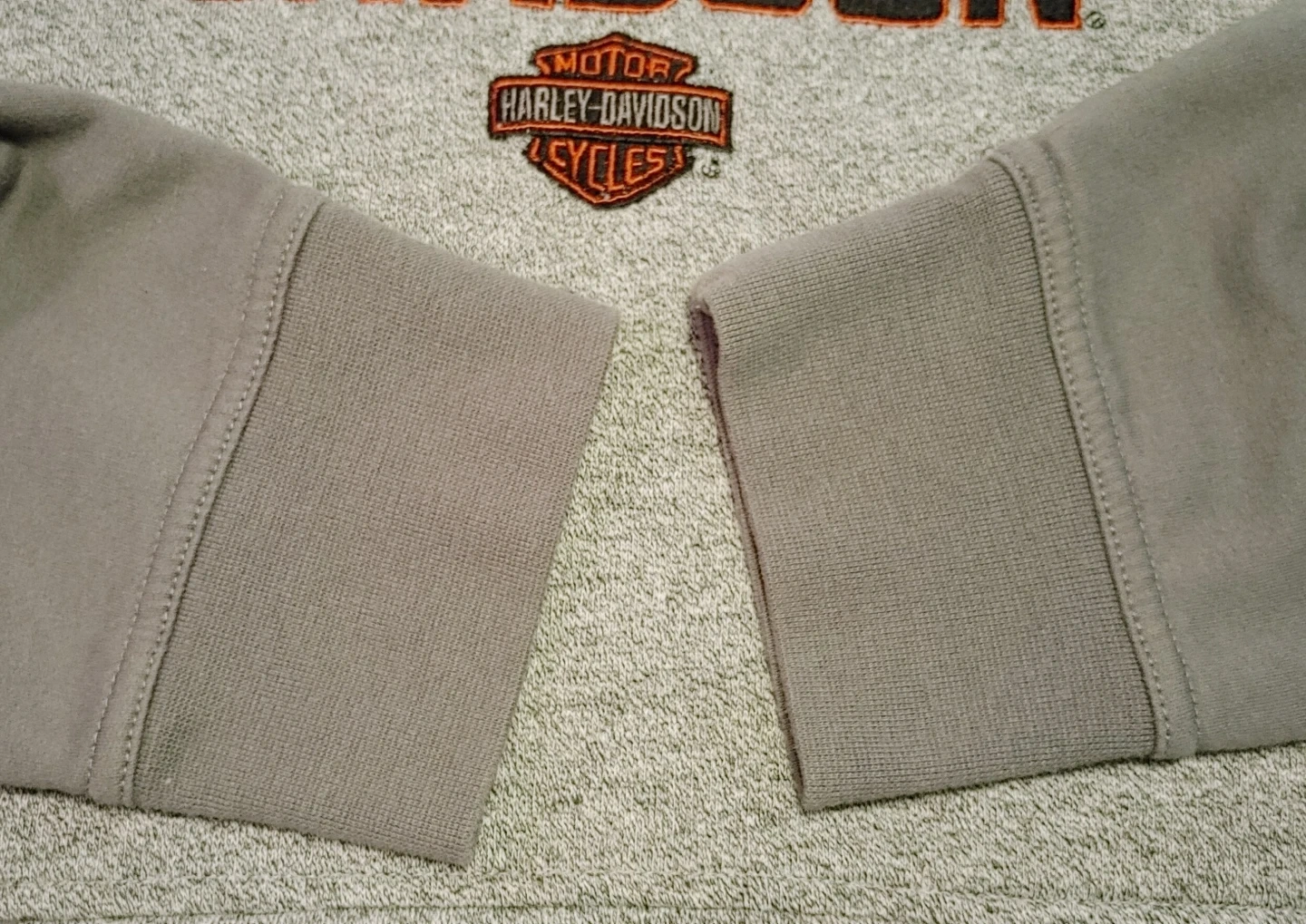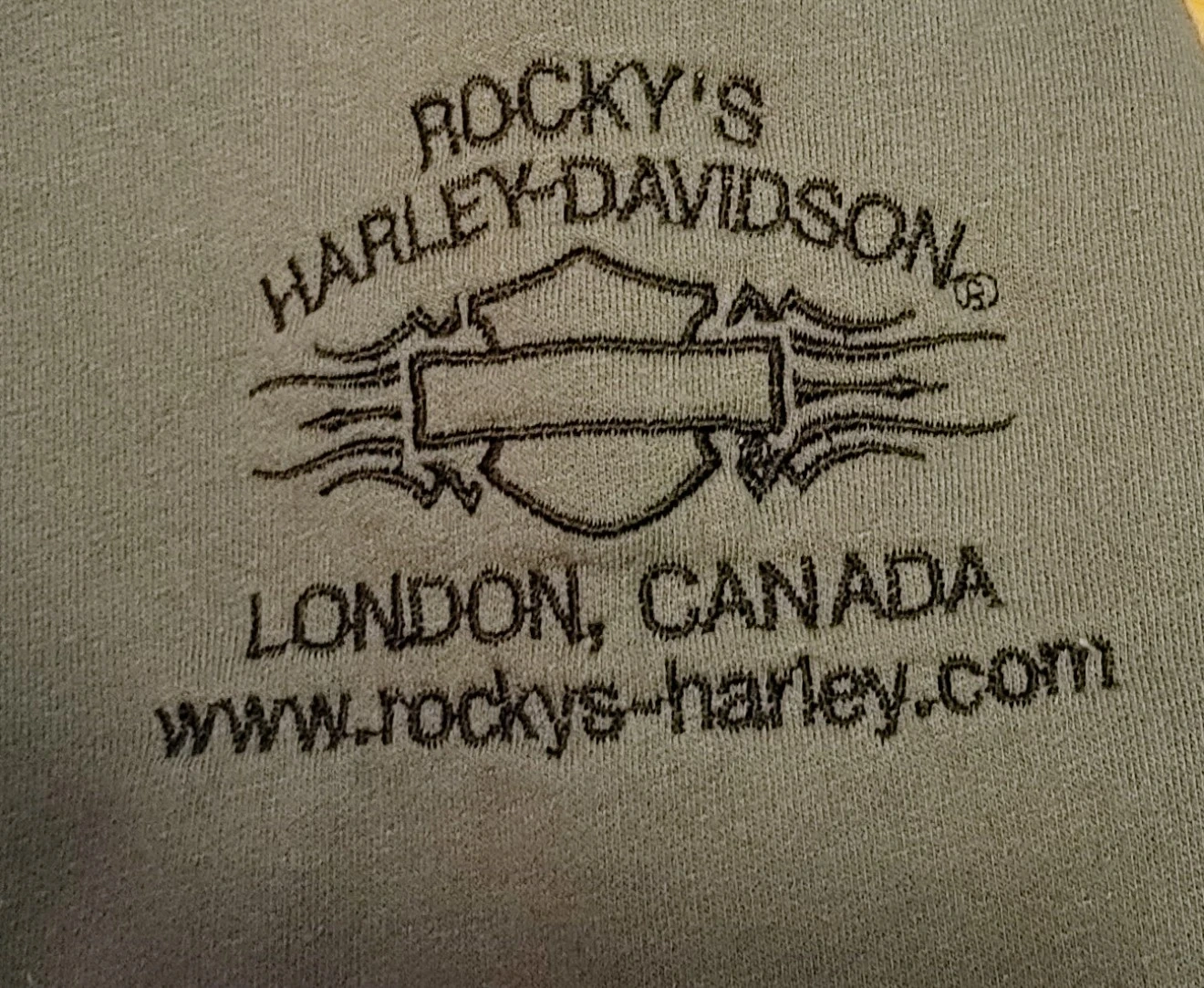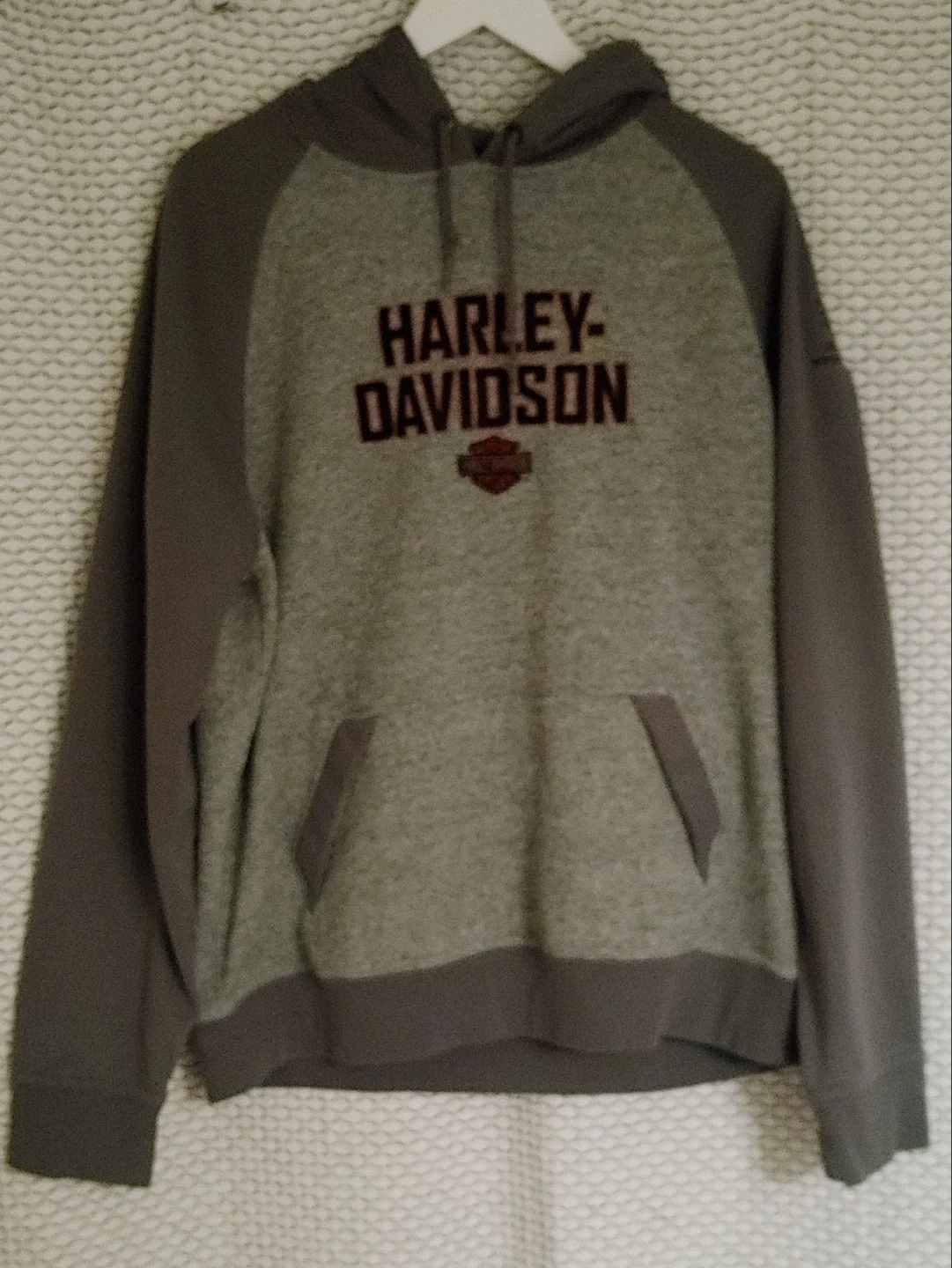 Grey and dark grey raglan sleeve hoodie with Harley-Davidson logo graphic on the front. From Rocky's Harley Davidson in London. Pullover style with a front hand kangaroo pocket. Very good condition. No rips, stains or fraying. Smoke free home pick up Mt Brydges cash only.