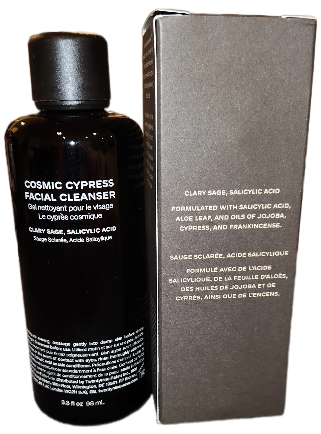 Cosmic Cypress facial cleanser gel. Formulated with salicylic acid, aloe leaf, and oils of jojoba, cypress, and frankincense. 3.3 fl oz (98 mL) bottle.