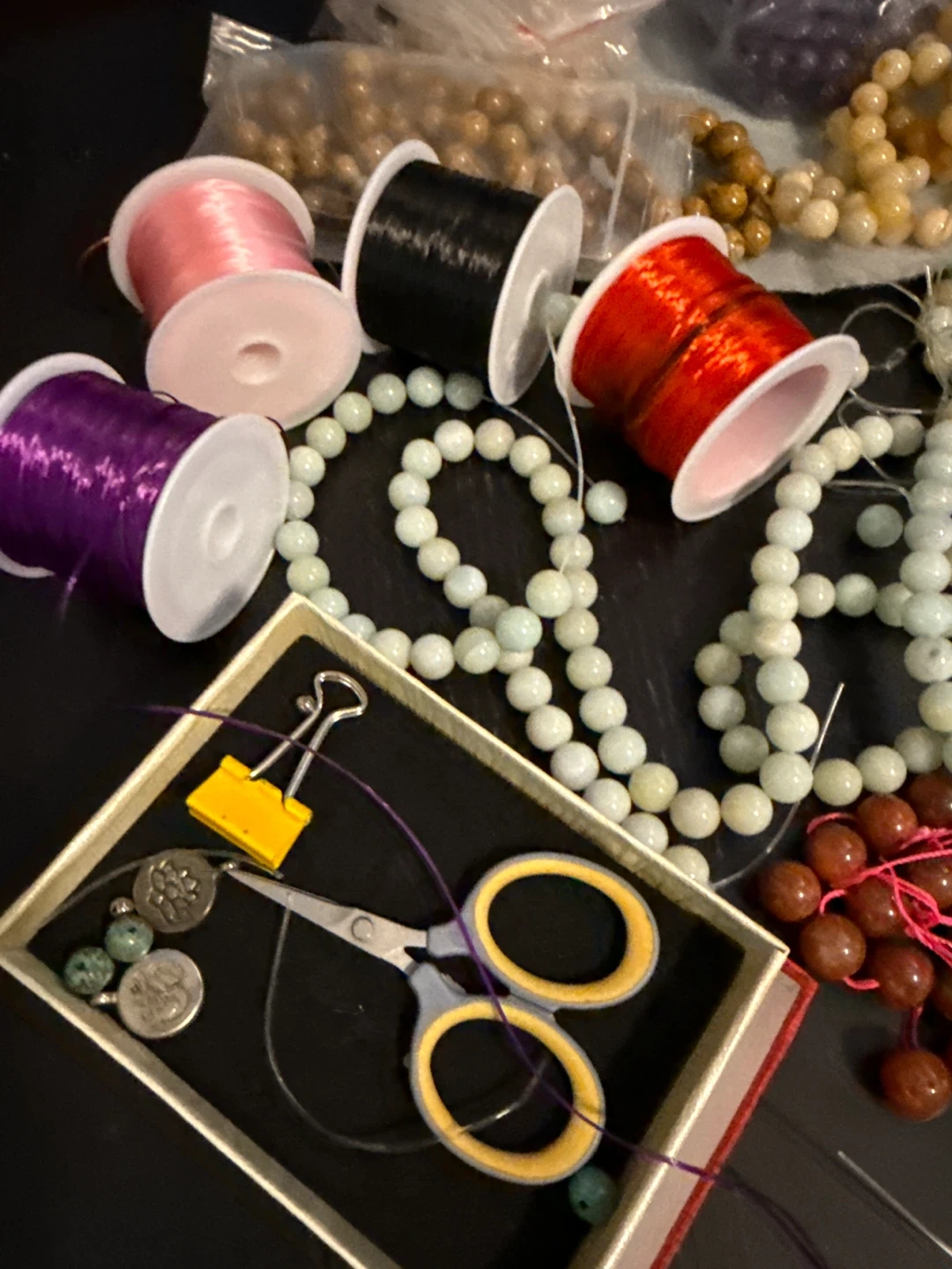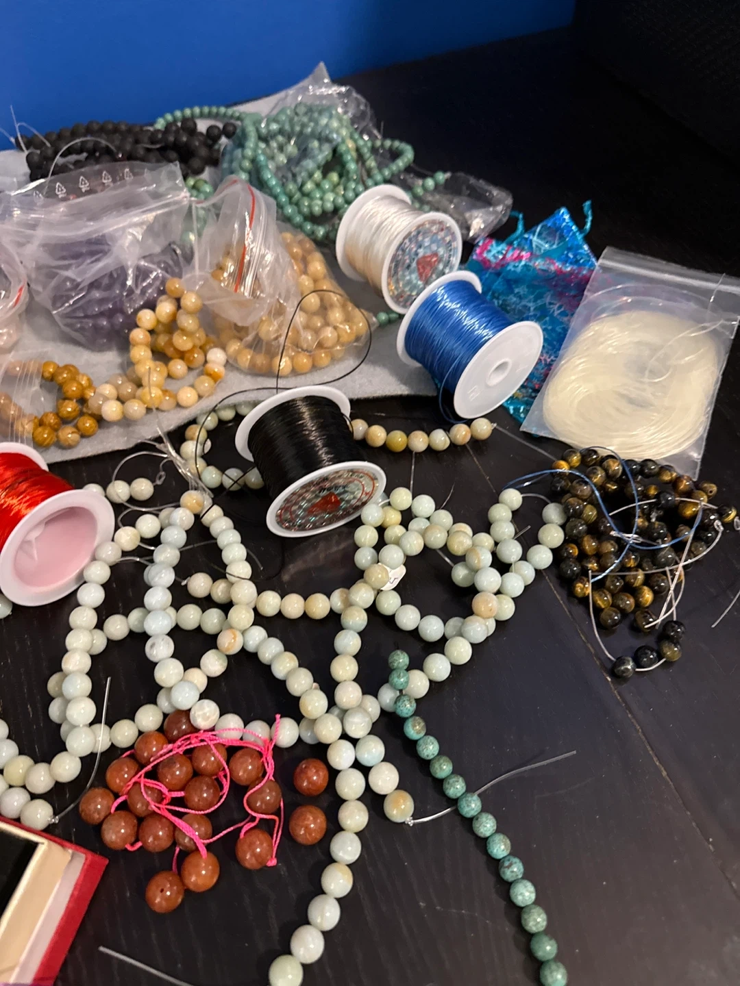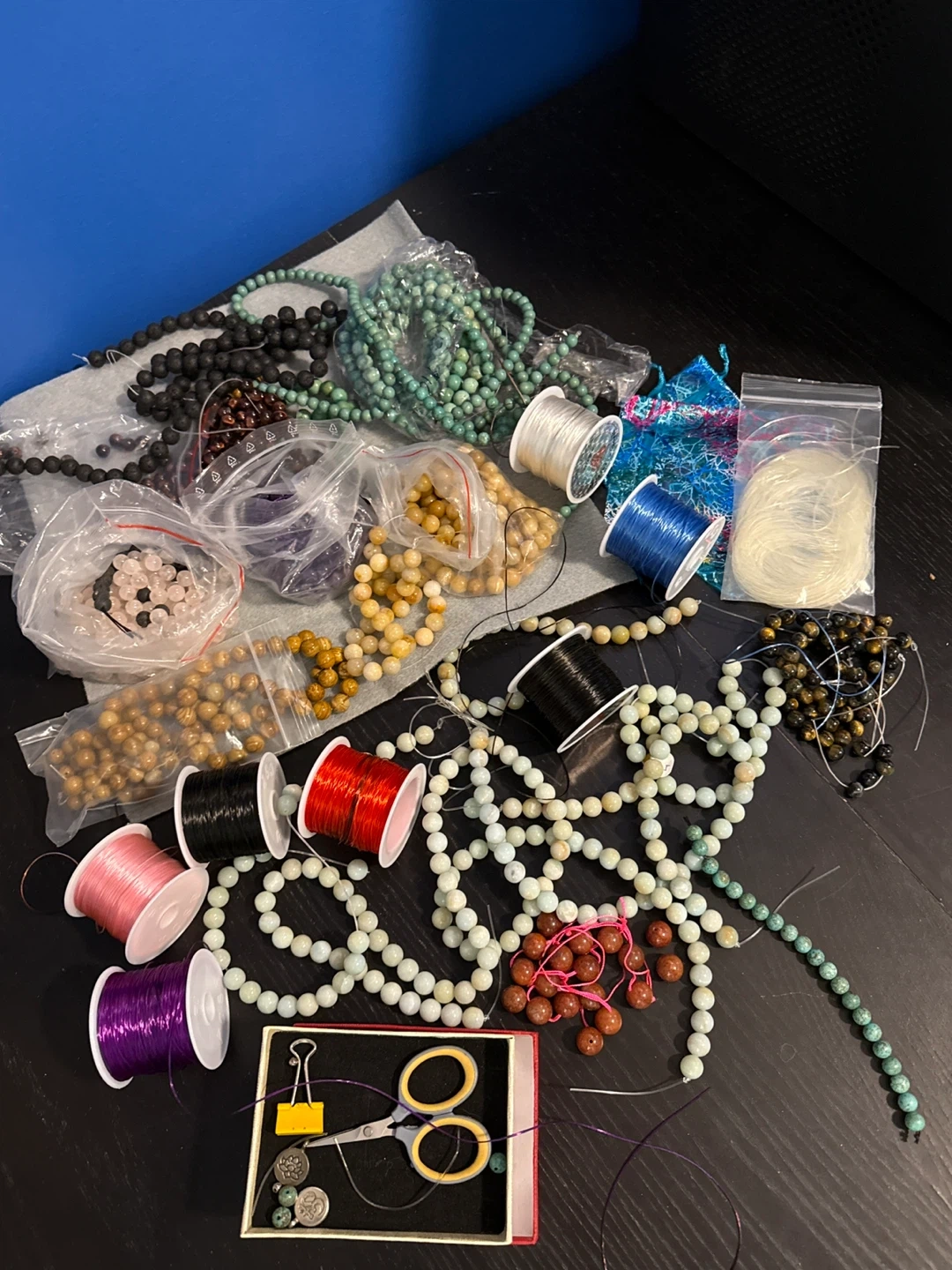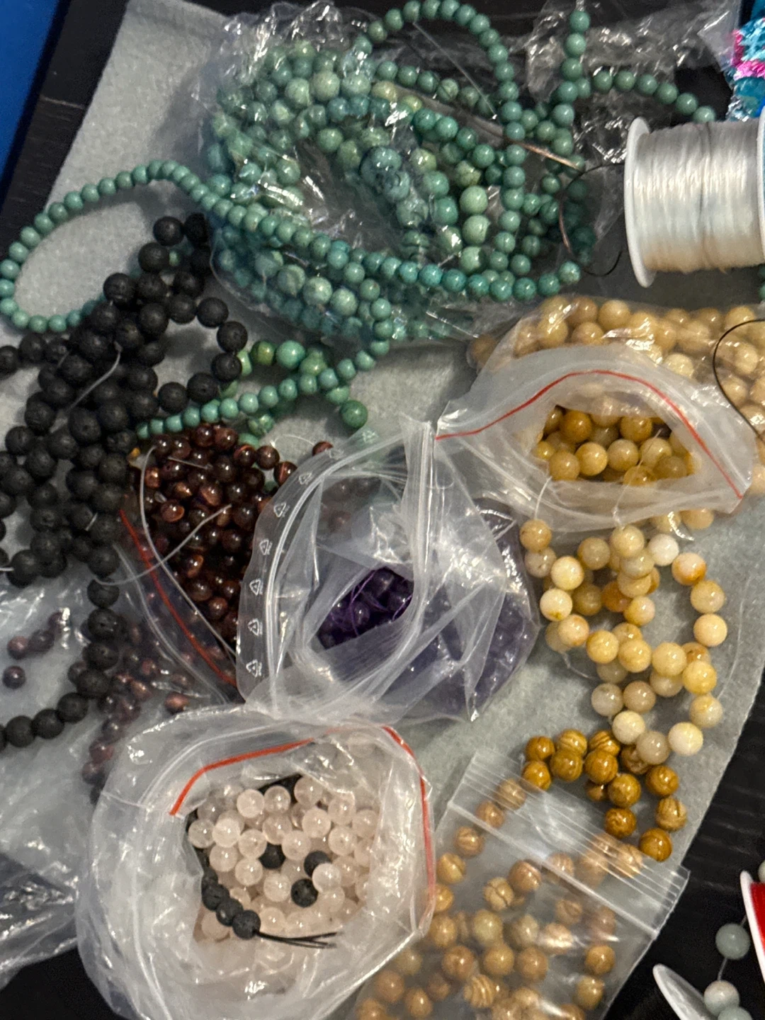 This lot includes various gemstone beads in different colours and types, along with spools of beading thread. You'll find items like jade, amethyst, rose quartz, lava stones, and tiger's eye. Tools like scissors and clips are also included for crafting. These are perfect for making your own bracelets, necklaces, and other jewellery pieces!