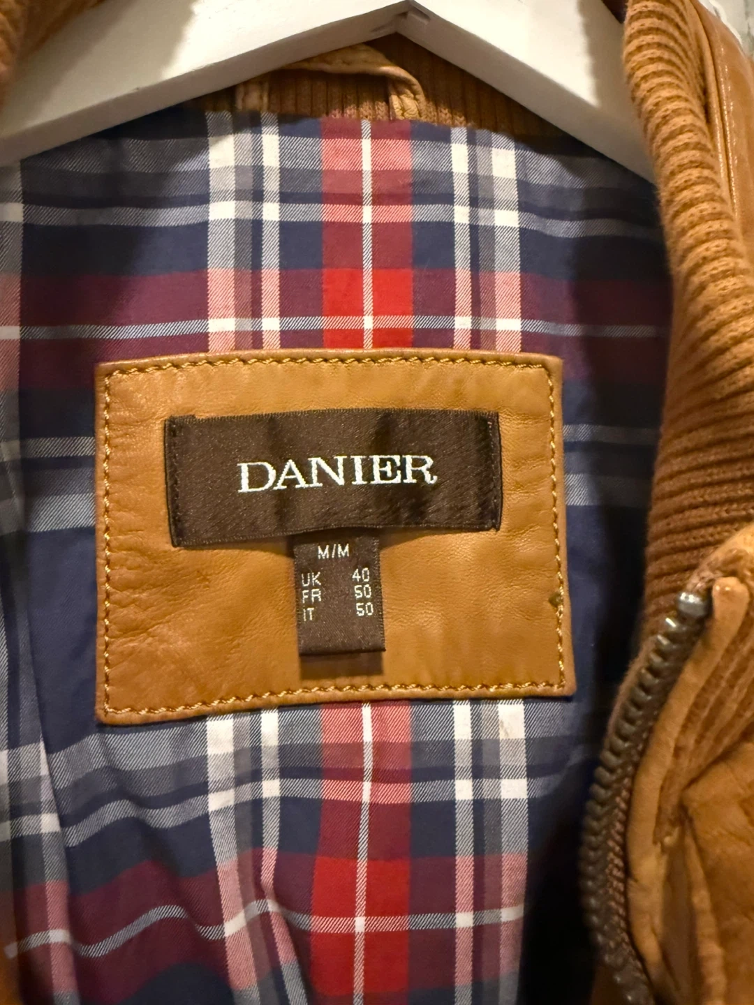 Danier leather bomber jacket in a nice tan brown colour. It's a size M/M with a plaid lining. Two zip pockets on the chest and two hand pockets at the waist.