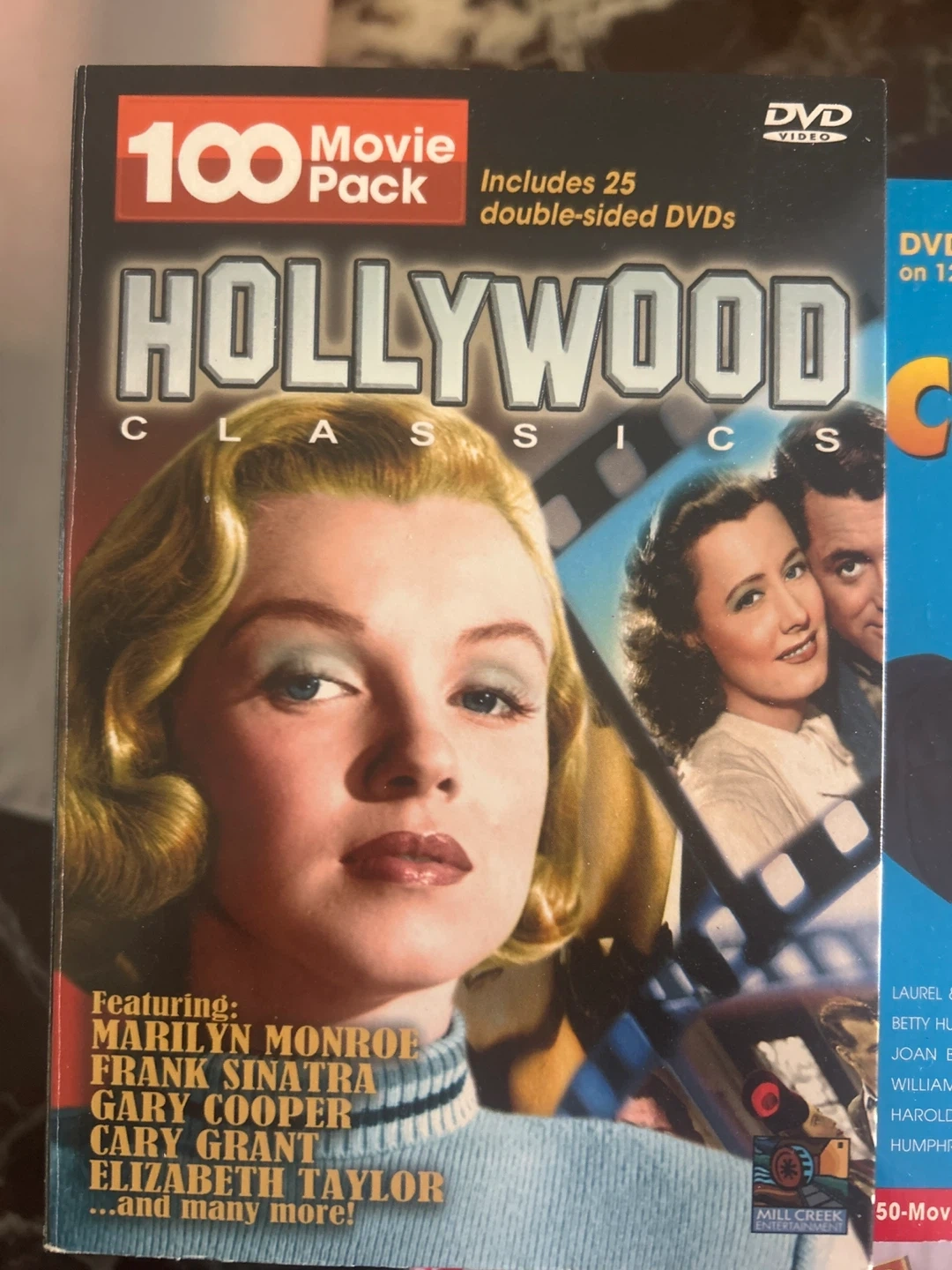 This DVD set includes 100 movies, with 25 double-sided DVDs. It features classic Hollywood films starring actors like Marilyn Monroe, Frank Sinatra, Gary Cooper, Cary Grant, and Elizabeth Taylor. Mill Creek Entertainment produced this collection.