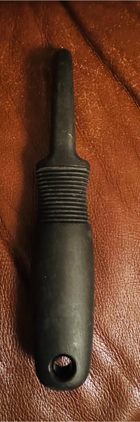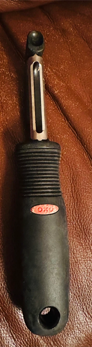 This is an OXO Good Grips swivel peeler. It has a black, non-slip handle for a comfortable grip. The stainless steel blade is sharp and durable for easy peeling.