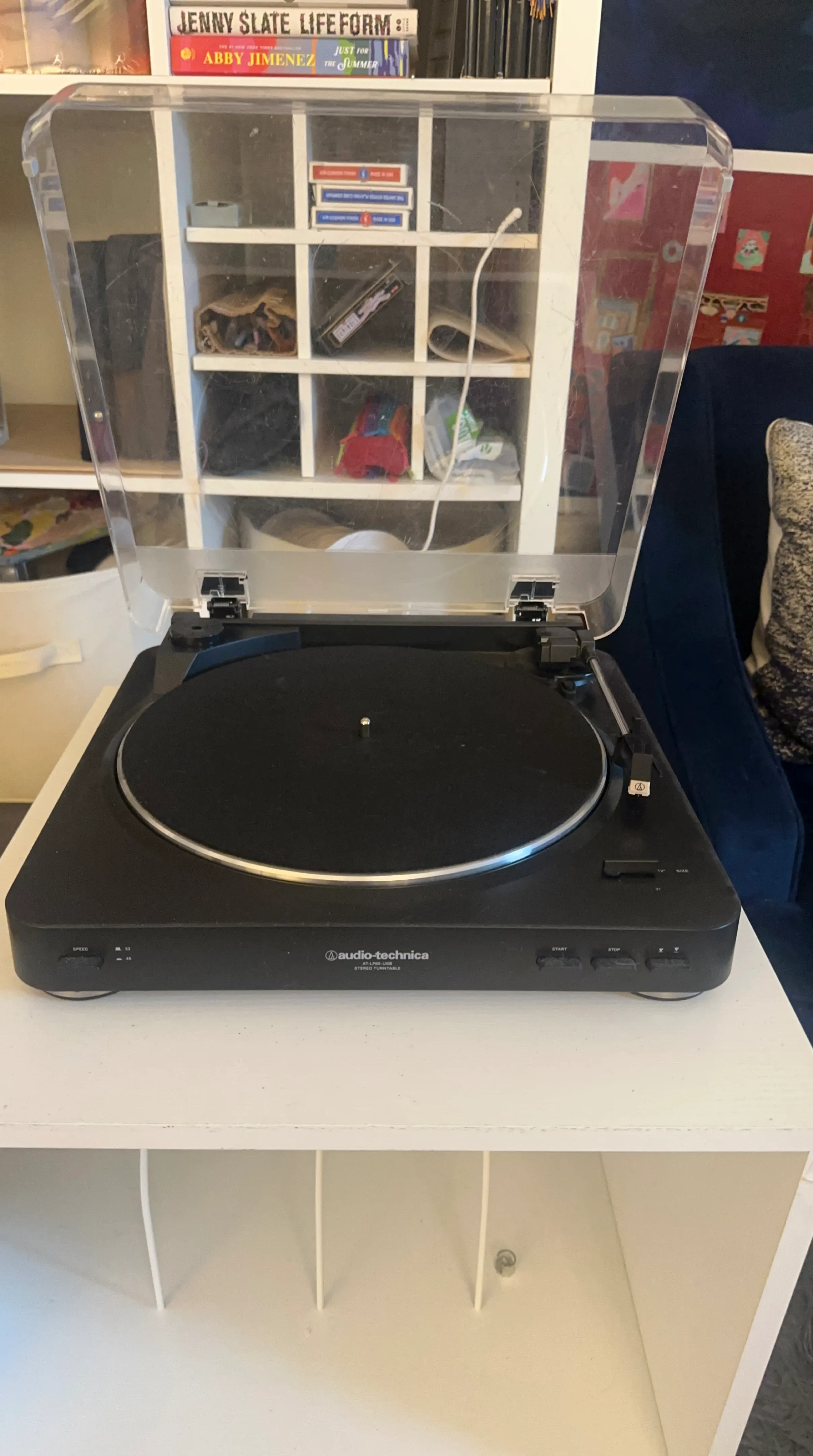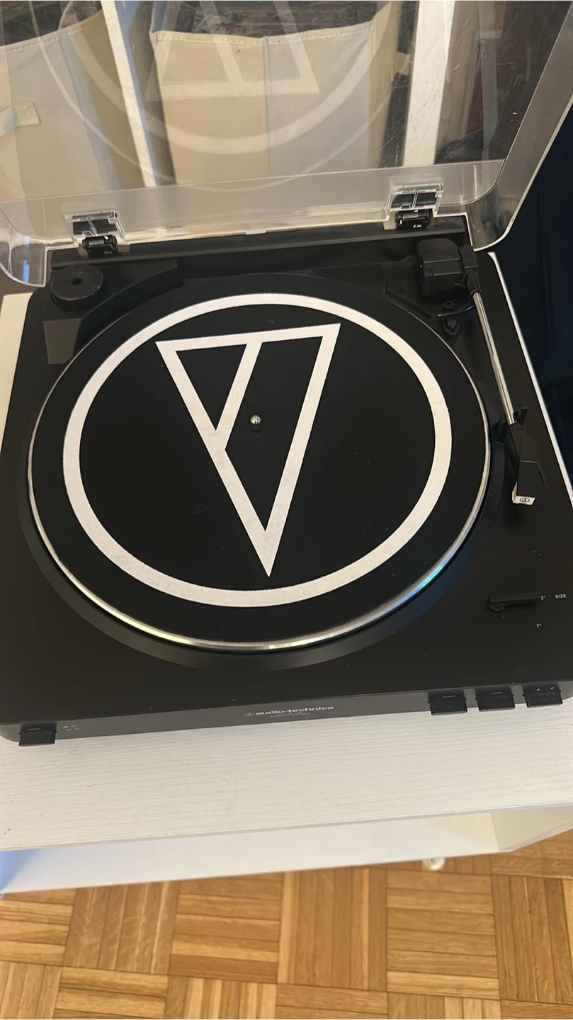 Selling an Audio-Technica AT-LP60-USB stereo turntable. It comes with a clear plastic cover to protect it from dust. Perfect for listening to your favorite vinyl records!