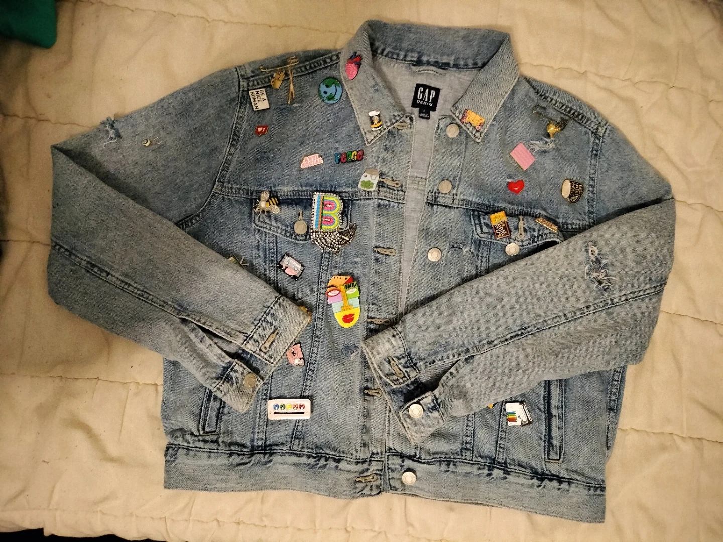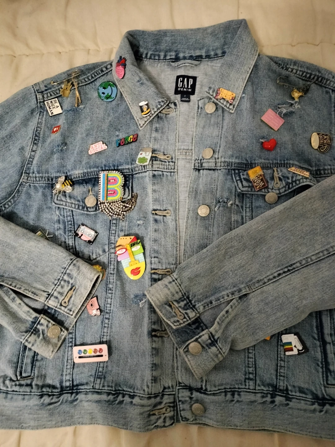 This is a classic blue denim jacket from GAP. It's adorned with a variety of fun patches, adding a unique touch. Perfect for anyone looking to express their style!