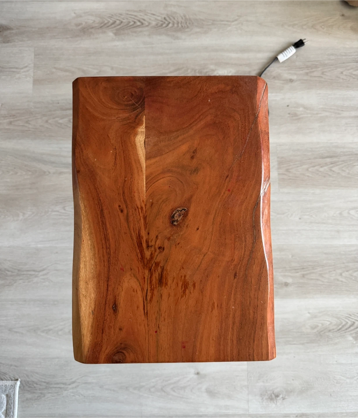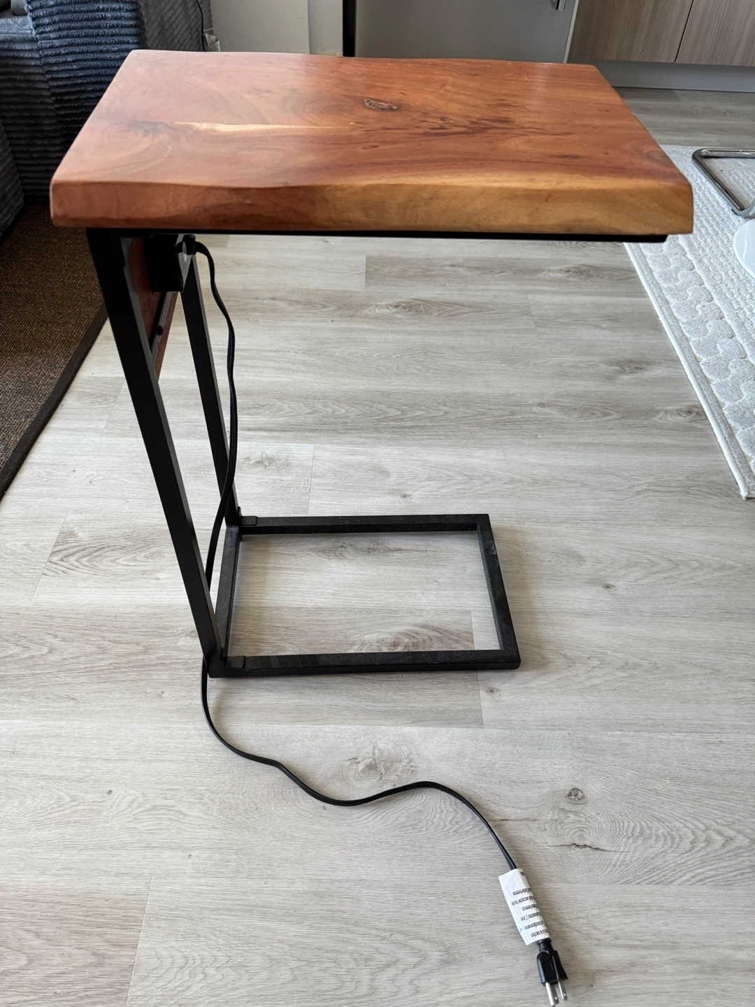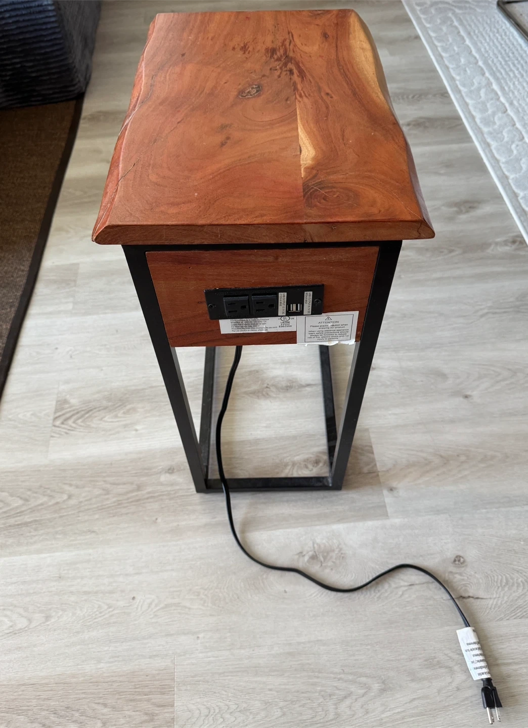 This end table features a natural live edge wood top with a black metal frame. It's equipped with a built-in power strip for convenient charging. It's useful for keeping devices powered and within reach.