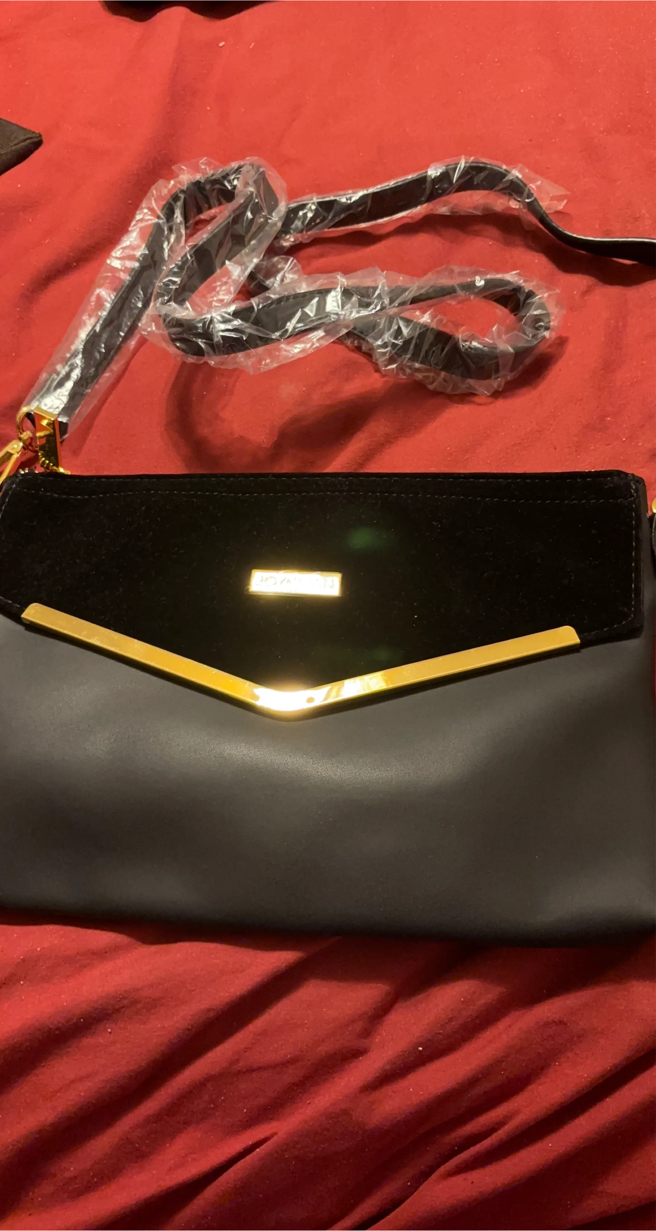 This chic clutch purse features a black velvet flap with a gold accent. It's made from a combination of velvet and faux leather. The detachable strap is still in its original plastic wrapping.