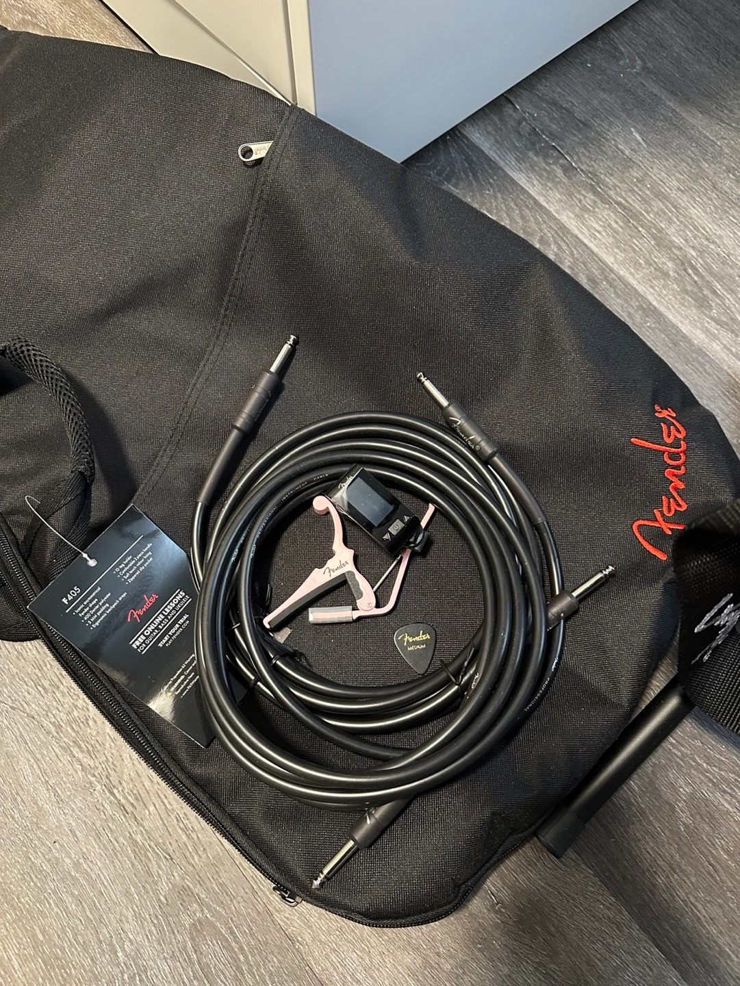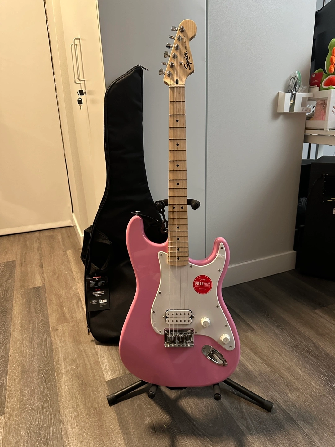 Fender pink guitar in the exact condition shown in the photos. Comes with all the accessories pictured. The guitar has no signs of use and has been well maintained.