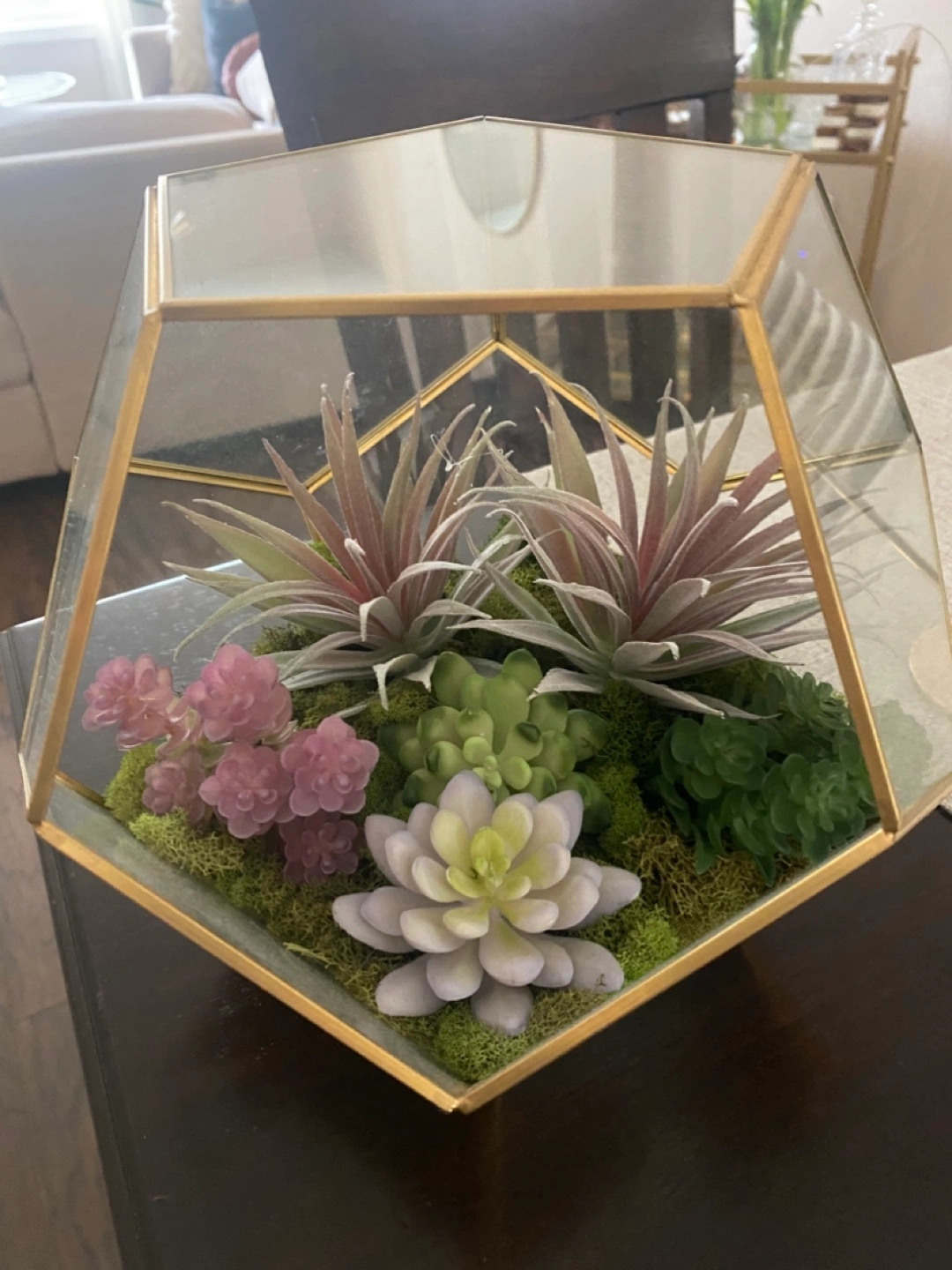Gold geometric terrarium. Contains artificial succulents and moss. Perfect centerpiece or home decor.