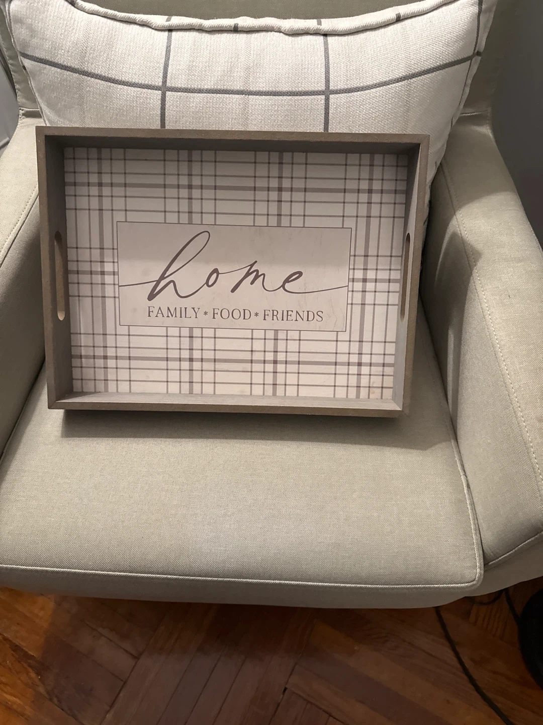 This decorative serving tray features a farmhouse-inspired plaid design with the word 'Home' and 'Family Food Friends' printed on it. It has built-in handles for easy carrying. Wood construction.