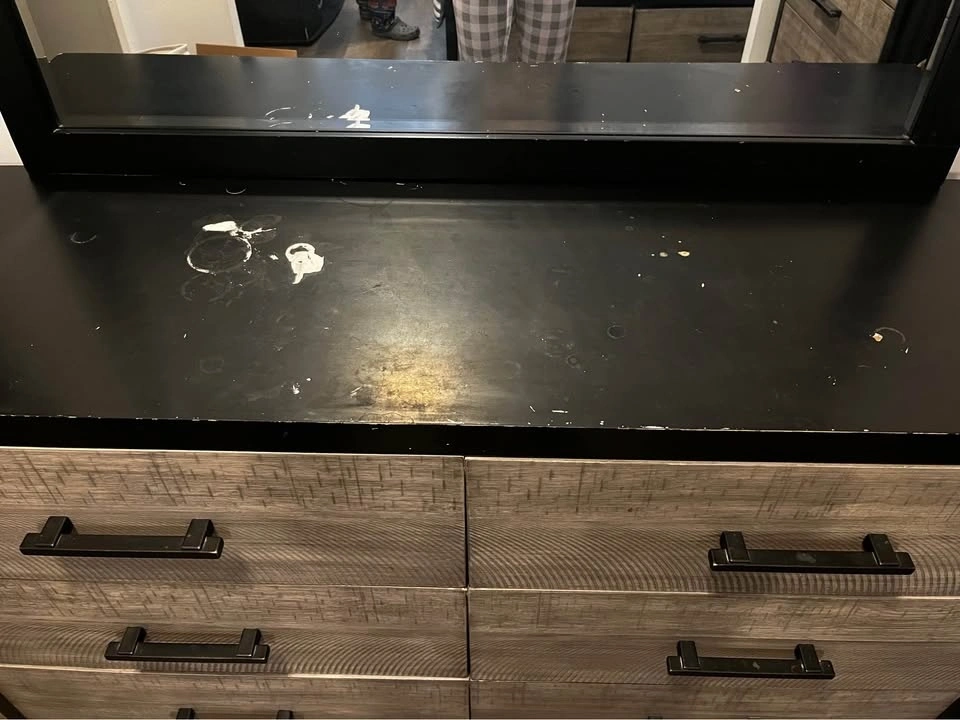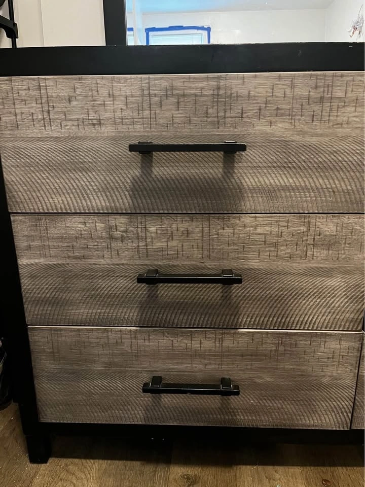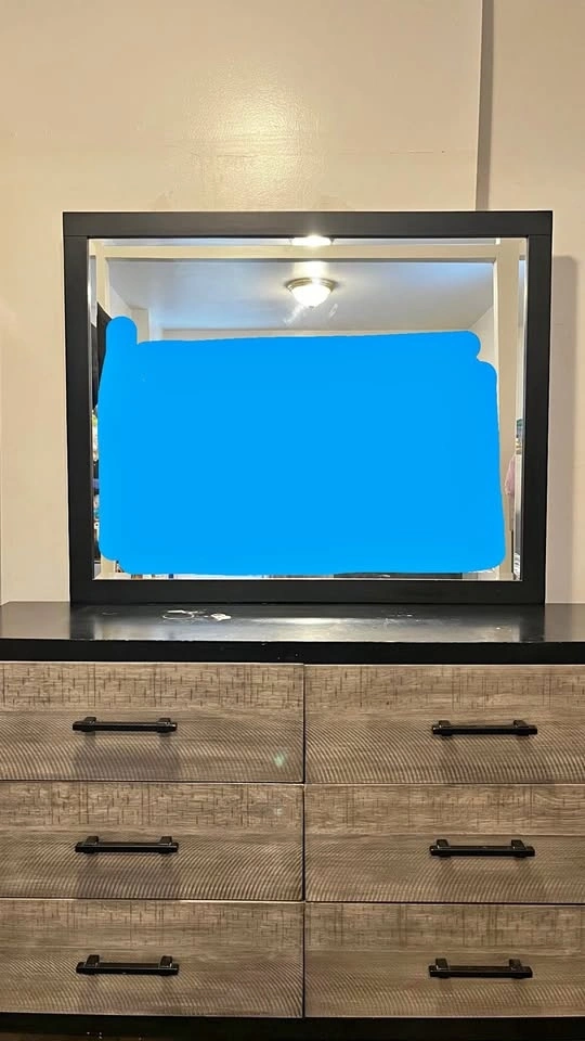 Bob's furniture, 6 large drawers with a mirror. The drawers have good space. The table's paint is peeling, but everything else is in good condition. Mirror condition 10/10. Drawer condition 9/10. Table condition 7/10.