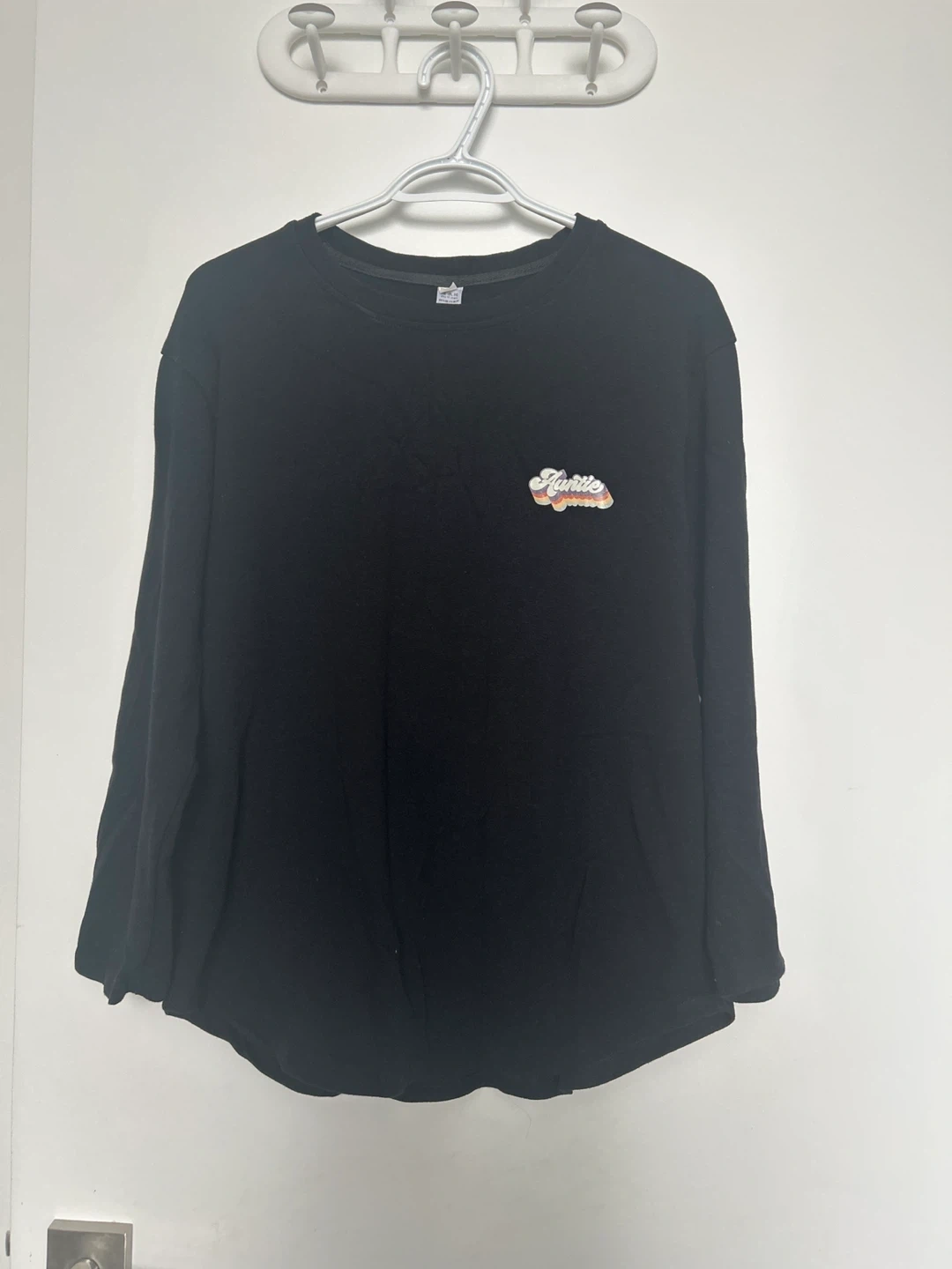 This is a black long-sleeve t-shirt with a colourful "Auntie" graphic on the chest. It's made of comfortable fabric. This shirt is great for casual wear.