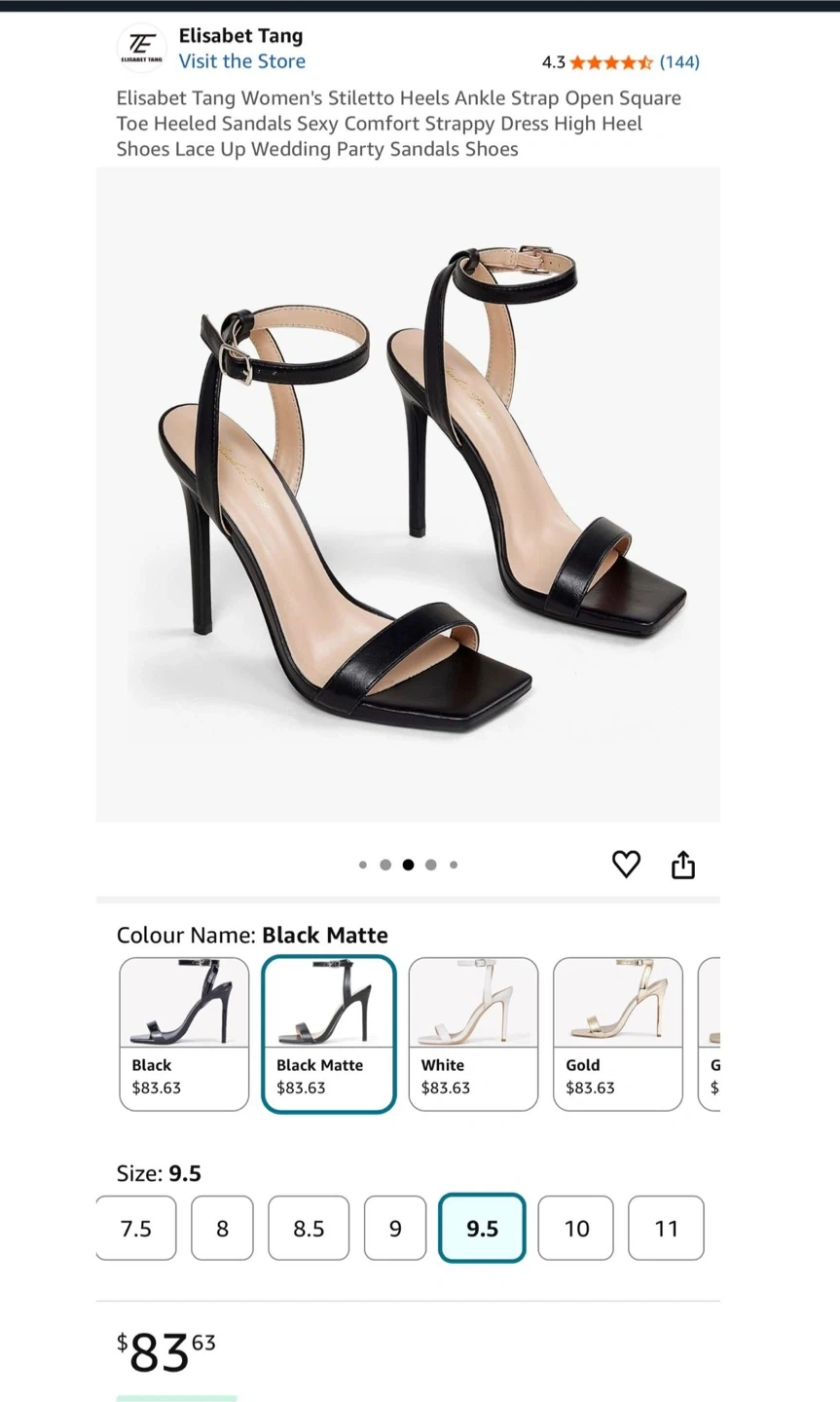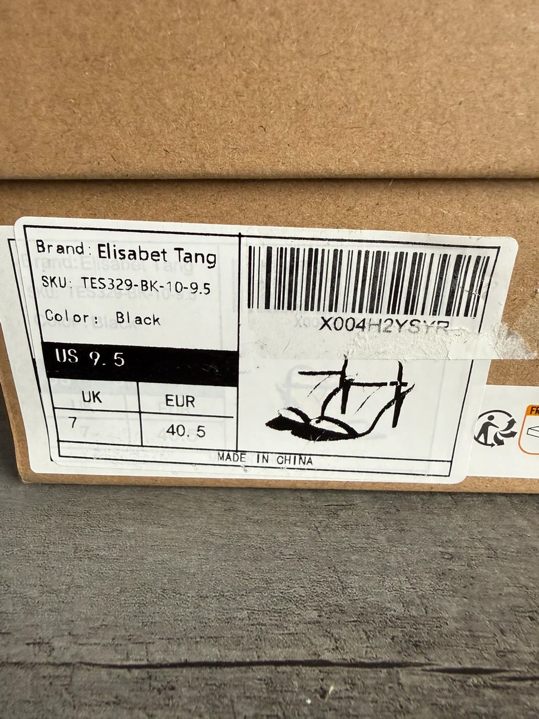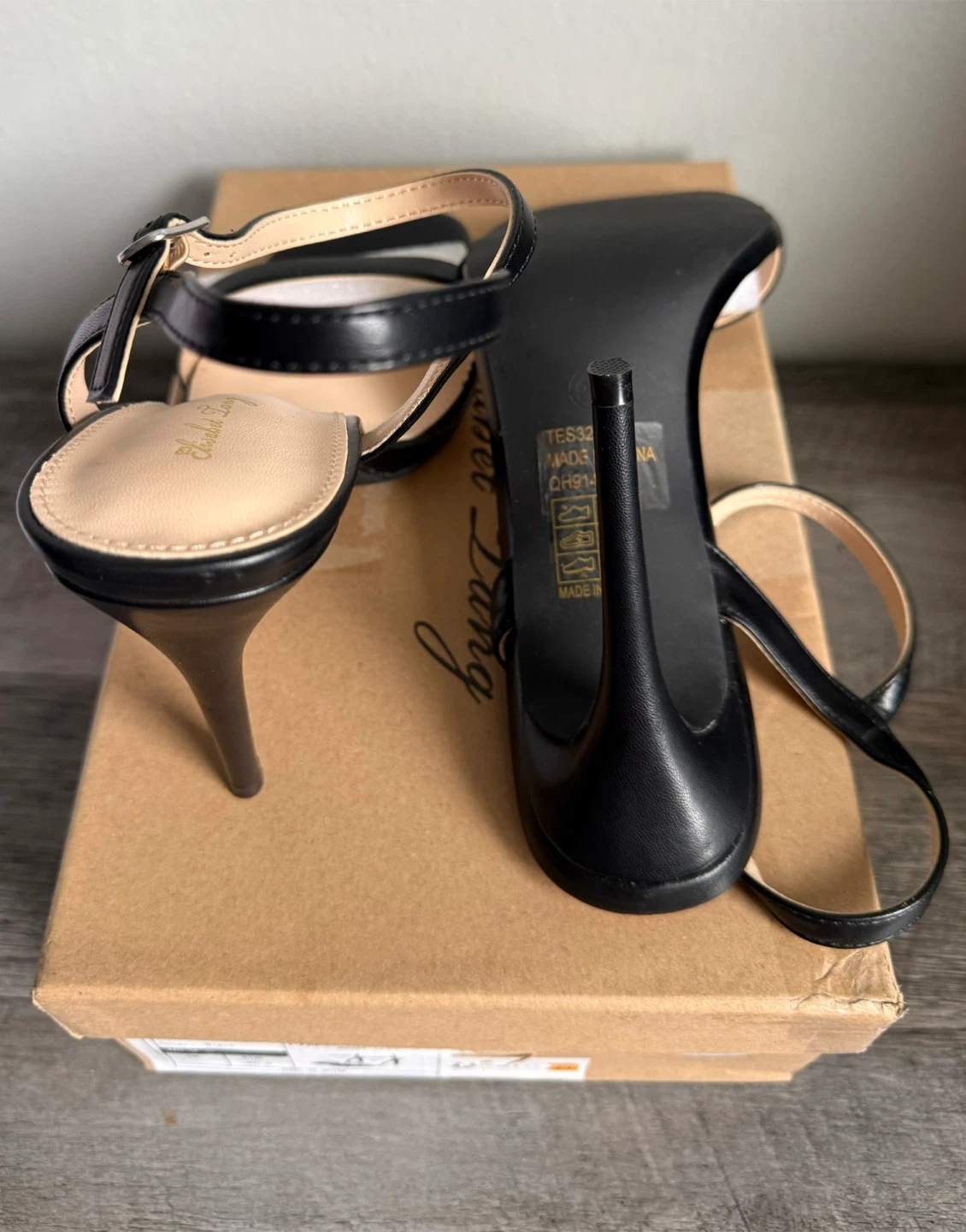 Elisabet Tang women's black matte stiletto heeled sandals with an ankle strap and open square toe. These comfortable strappy dress heels are a US size 9.5. Includes the original box and packaging. Made in China.