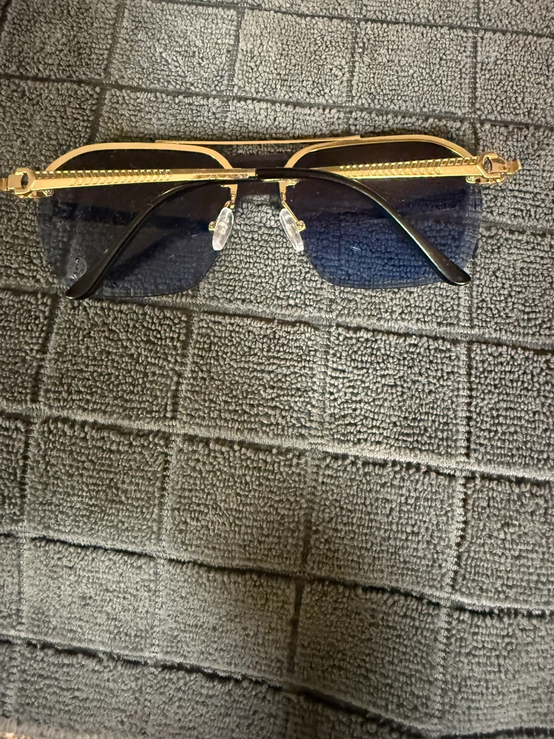 These Cartier aviator sunglasses feature rimless, blue gradient lenses. The frame is gold-toned with clear nose pads. A stylish accessory for sun protection!