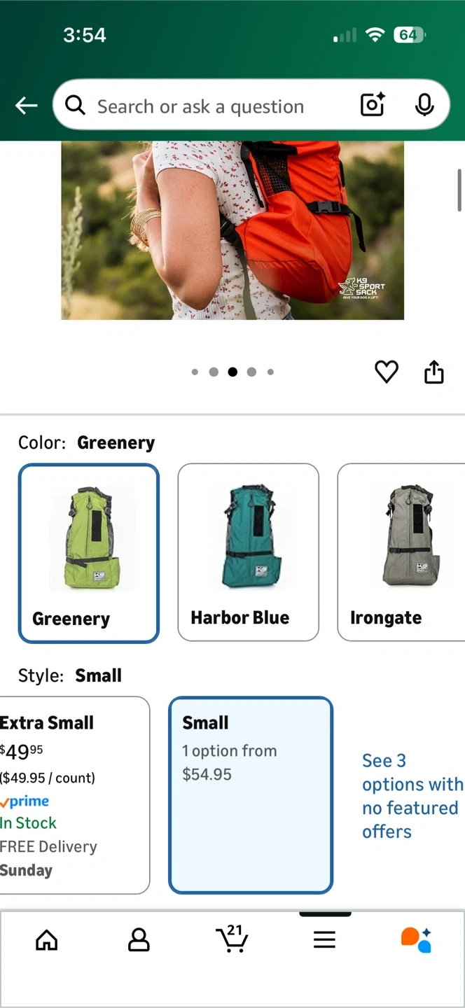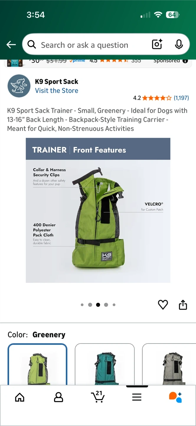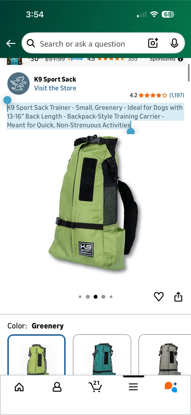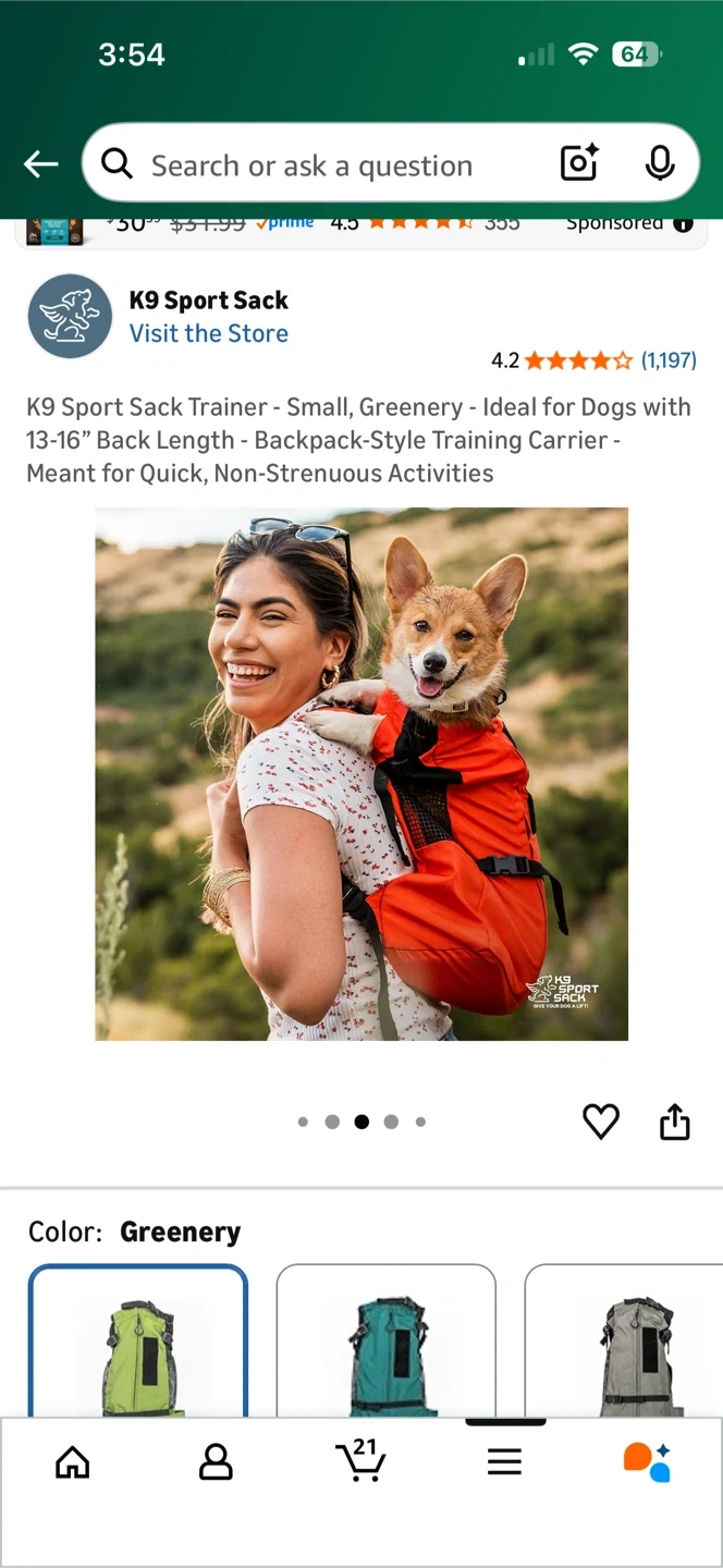 Looking to sell a K9 Sport Sack Trainer in the greenery color and small size! It's ideal for dogs with a 13-16" back length and is designed as a backpack-style training carrier for quick, non-strenuous activities. It features macro-mesh for breathability and structural integrity, and a patented angle-base for your dog's comfort