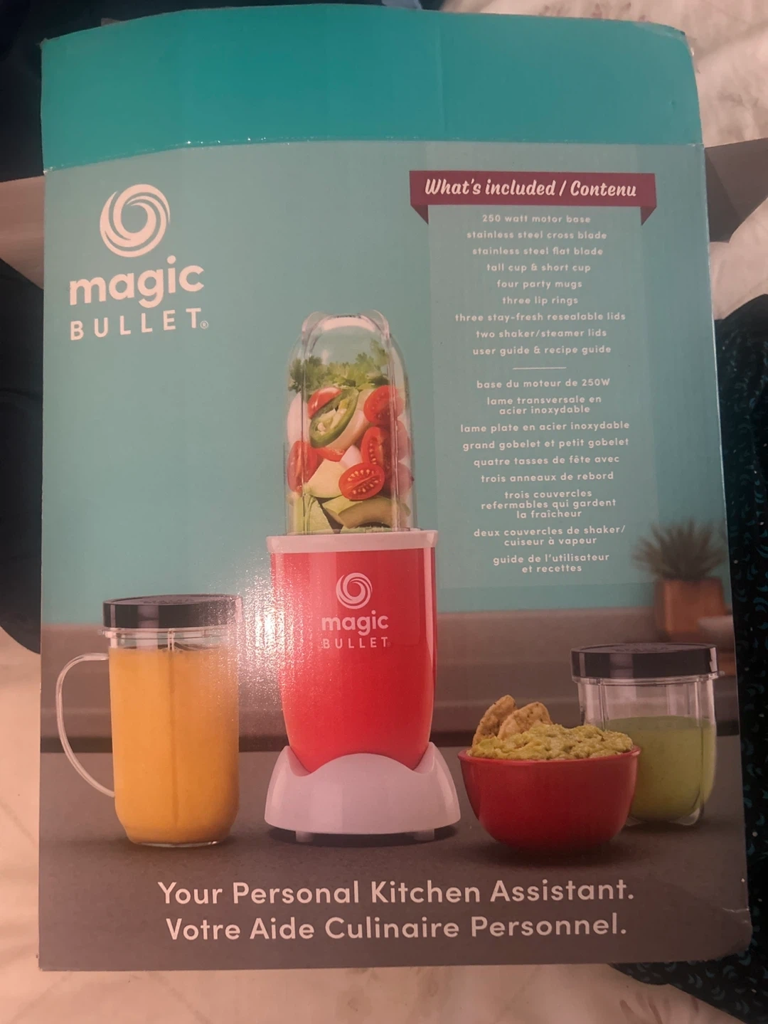 Selling a Magic Bullet blender set! It comes with a 250-watt motor base, stainless steel cross blade, and stainless steel flat blade. Also included are a tall cup and short cup, four party mugs, three lip rings, three stay-fresh resealable lids, two shaker/steamer lids, and a user guide and recipe guide. Perfect for making smoothies and more.