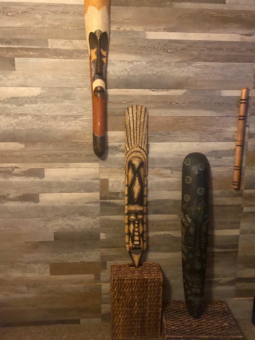 Set of three carved wooden masks. Intricate details and unique designs. Perfect for bohemian or eclectic decor. Display individually or as a set.