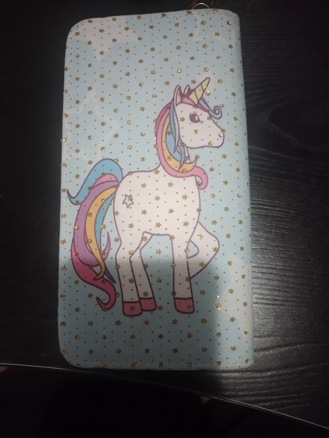Cute unicorn wallet with a light blue background and gold star details! It comes with a gold chain strap and a light purple wrist strap. Perfect for carrying your essentials in style