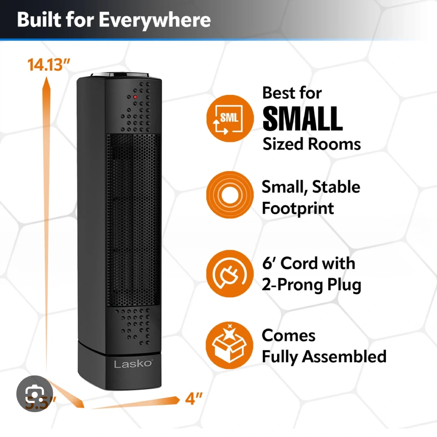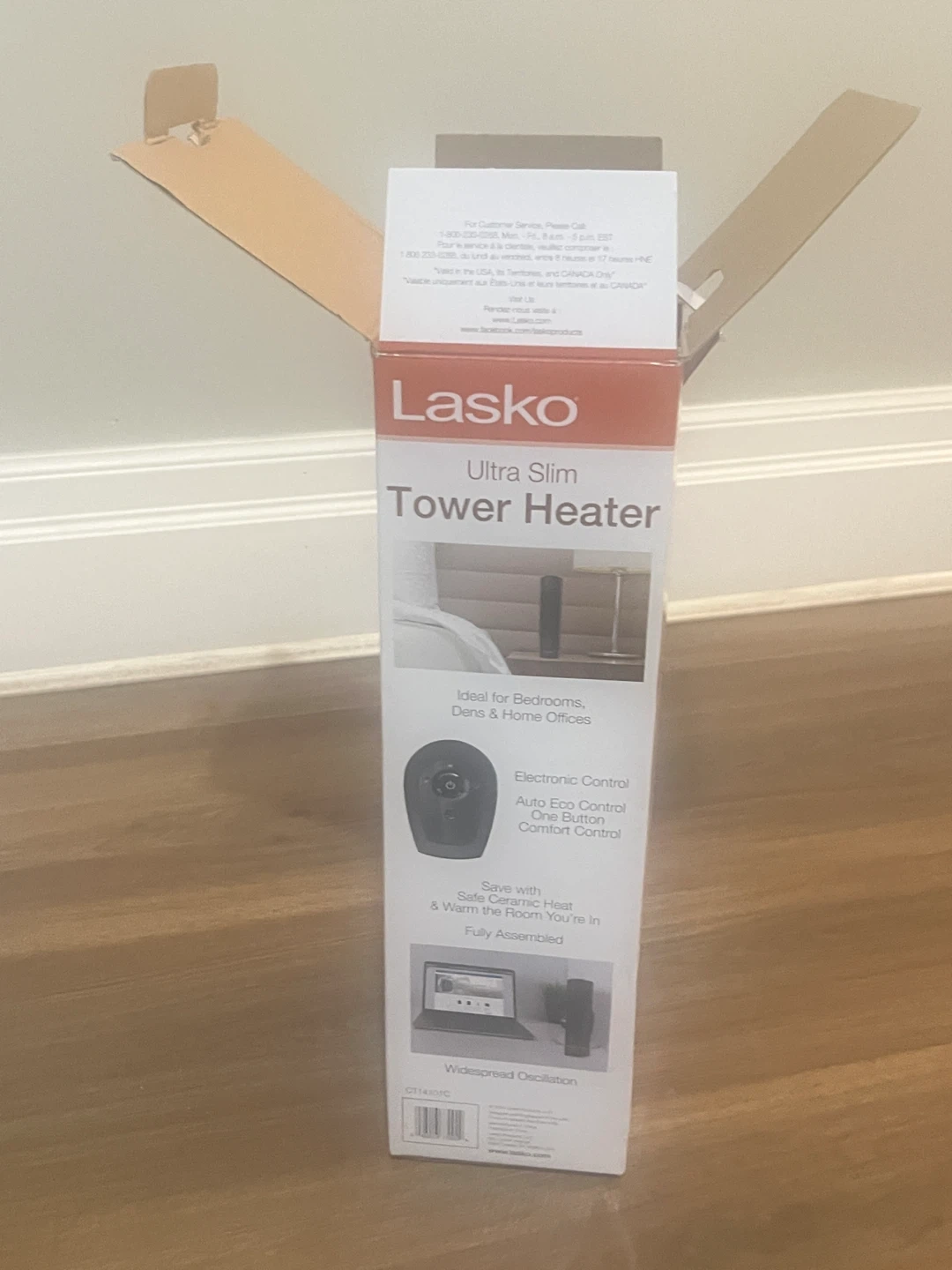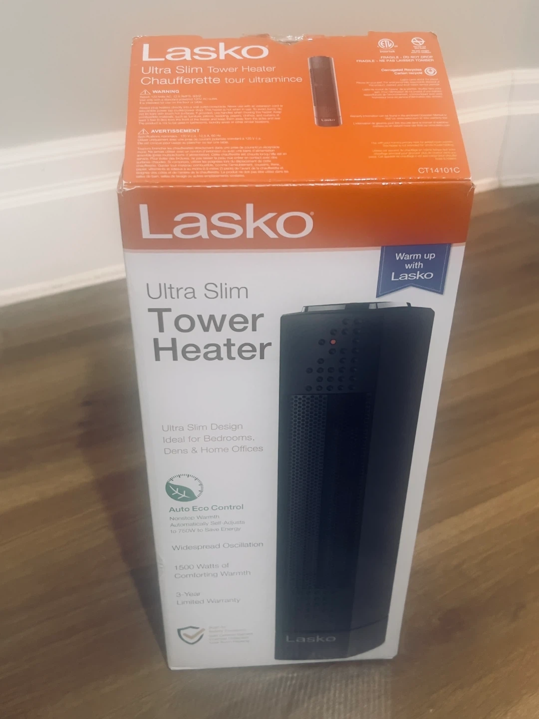 Lasko Ultra Slim Tower Heater provides 1500 watts of comforting warmth. It has electronic controls with auto eco control for energy saving. It features widespread oscillation and is ideal for bedrooms, dens, and home offices. Dimensions in pics.