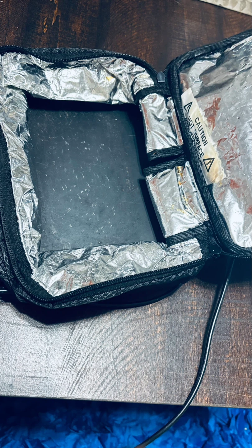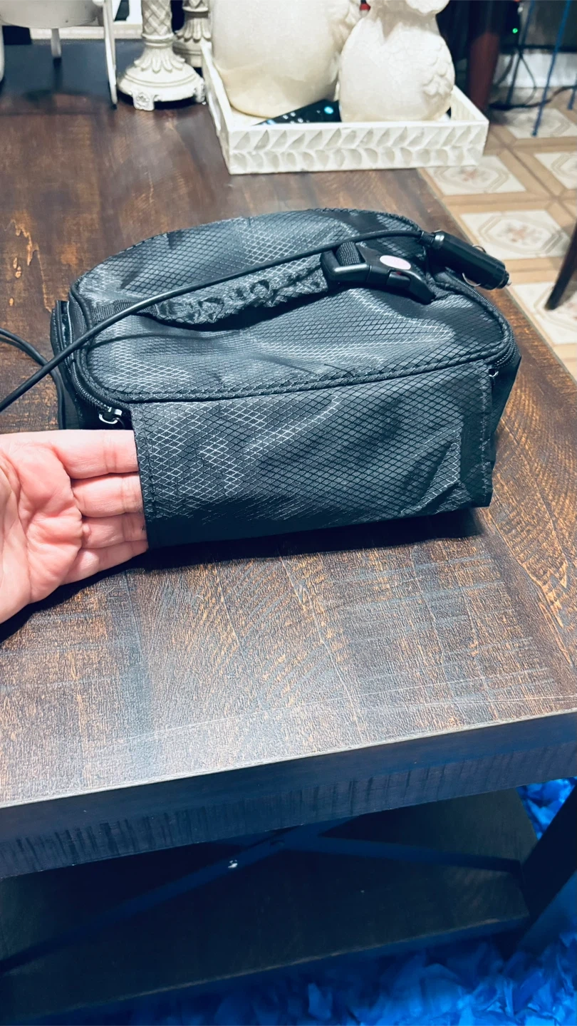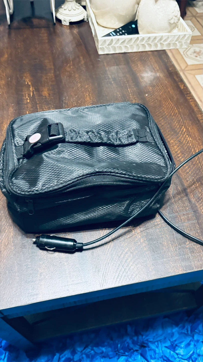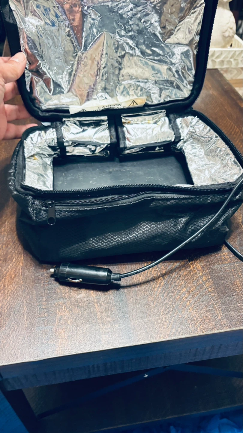 This black portable lunch box comes with a car adapter for power on the go. It's insulated and has a zippered closure. The inside has small pouches and a warning label for hot surfaces.