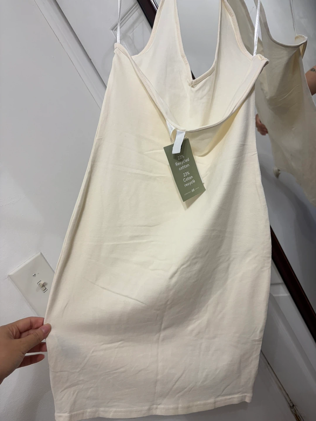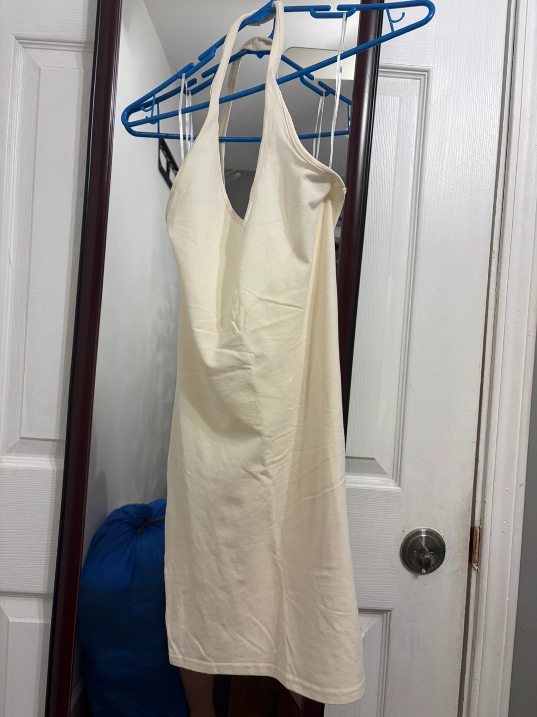 This cream halter neck mini dress is made from 23% recycled cotton. It's a US size small. Perfect for a casual day out or a night with friends! Never worn