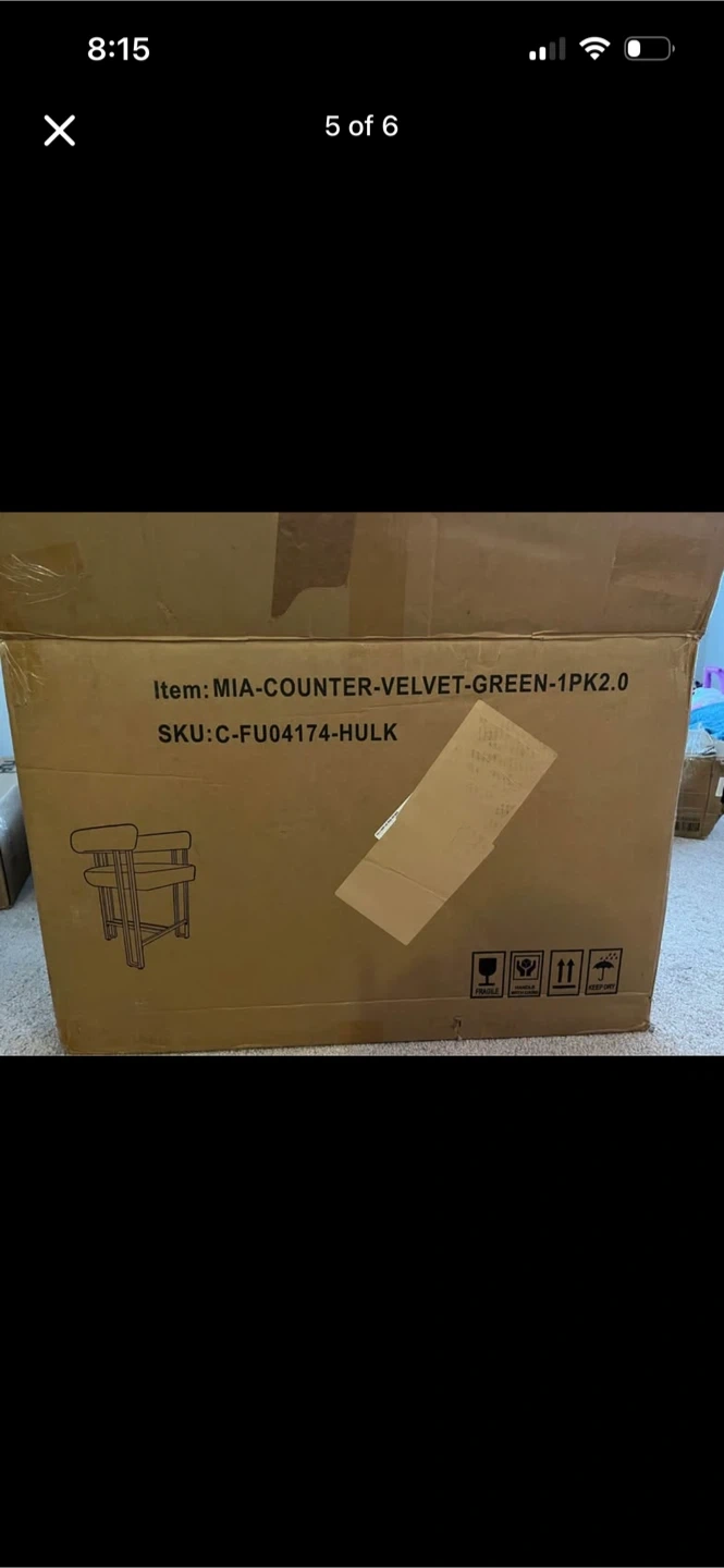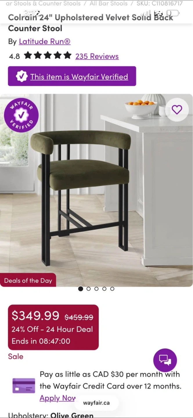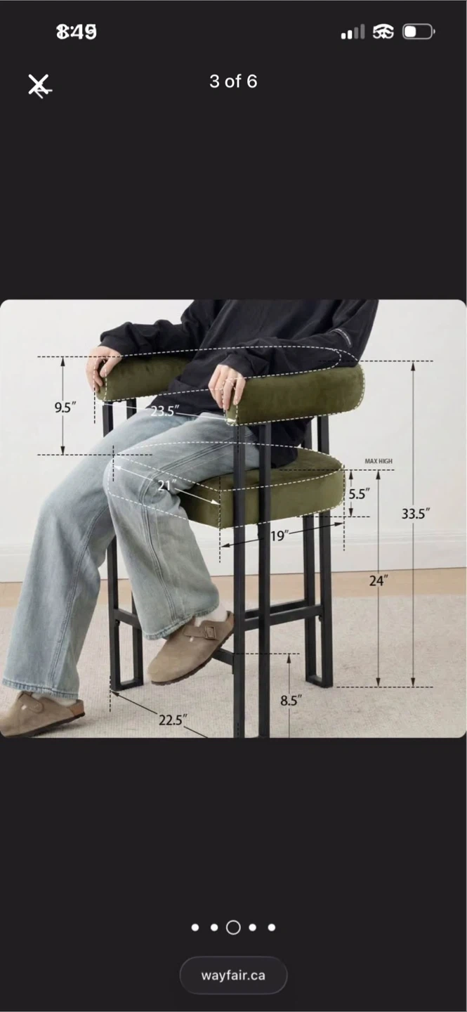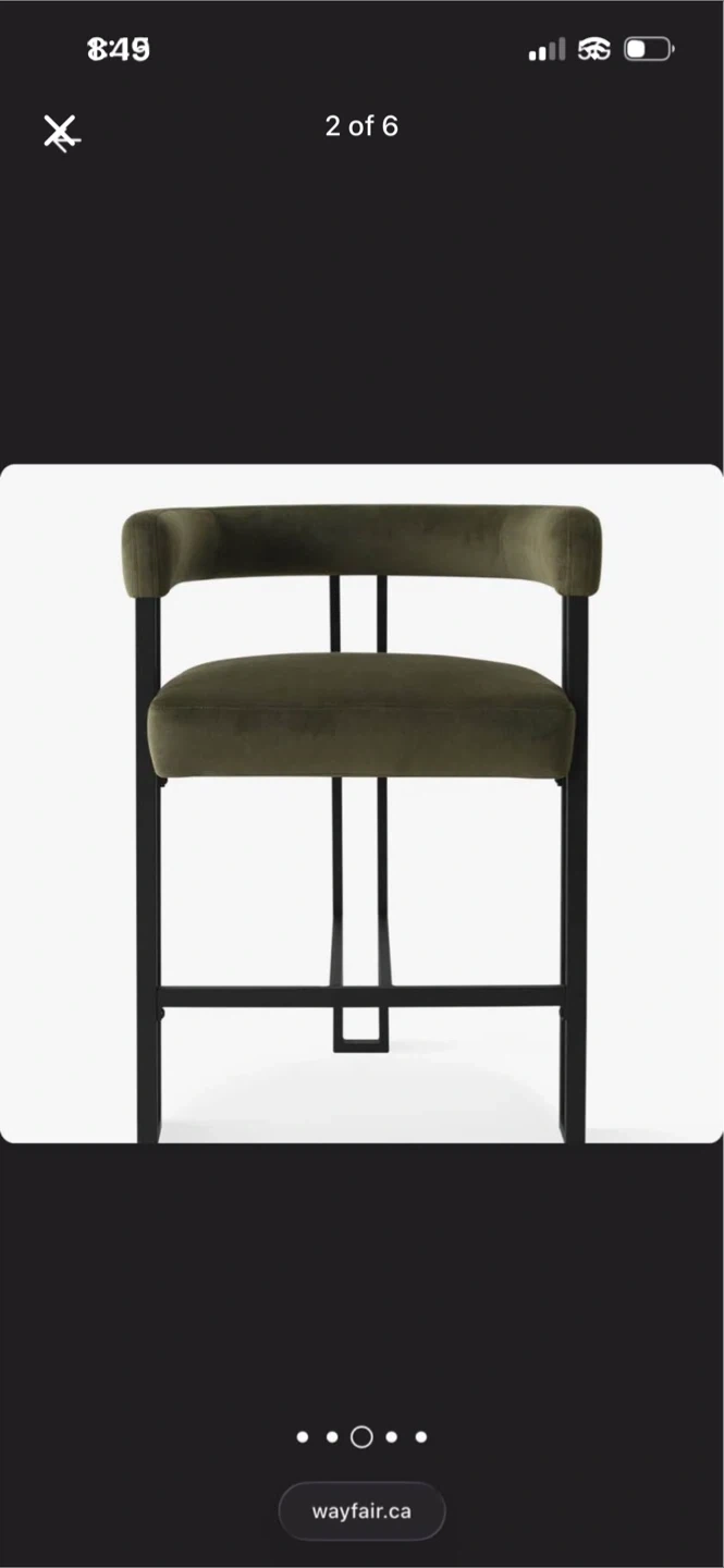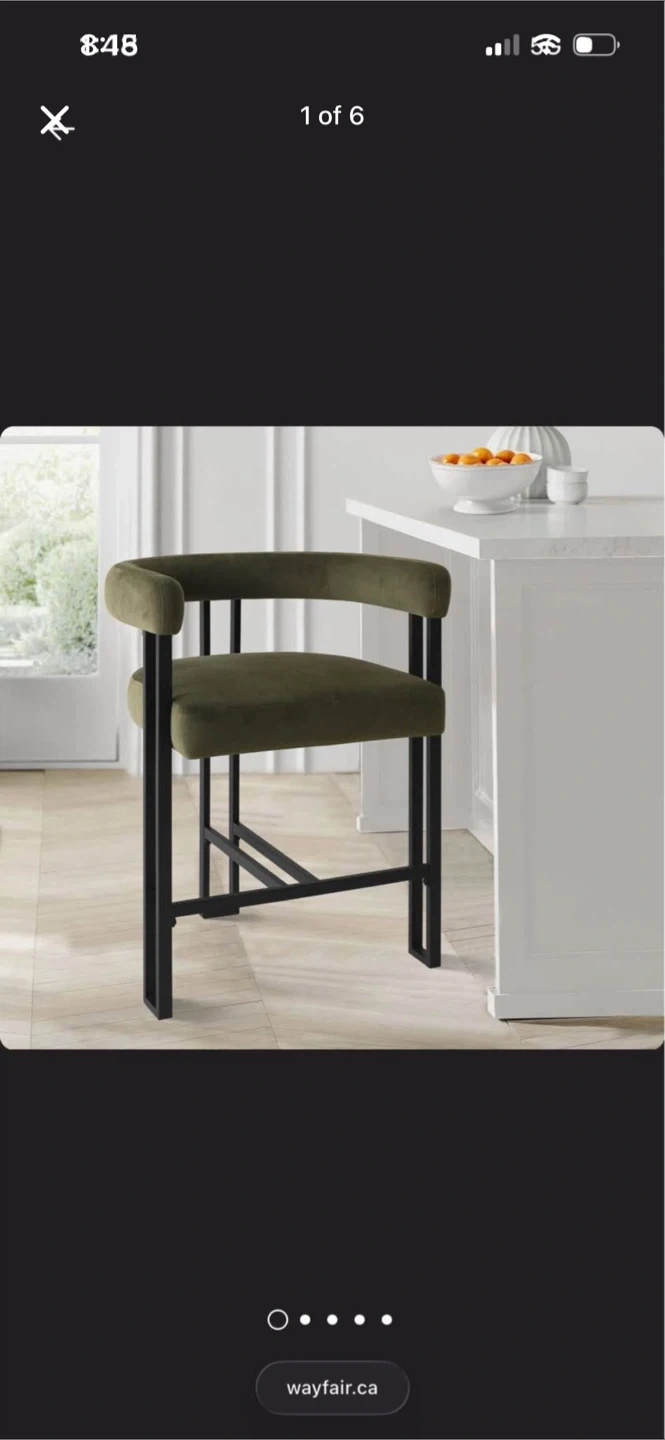 This counter stool is upholstered in velvet fabric. It has a solid back and armrests. The legs are made of black metal. It's 24 inches high, perfect for a counter.