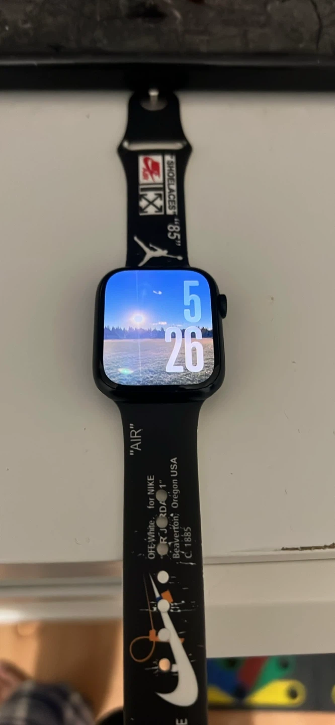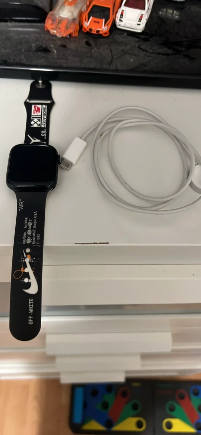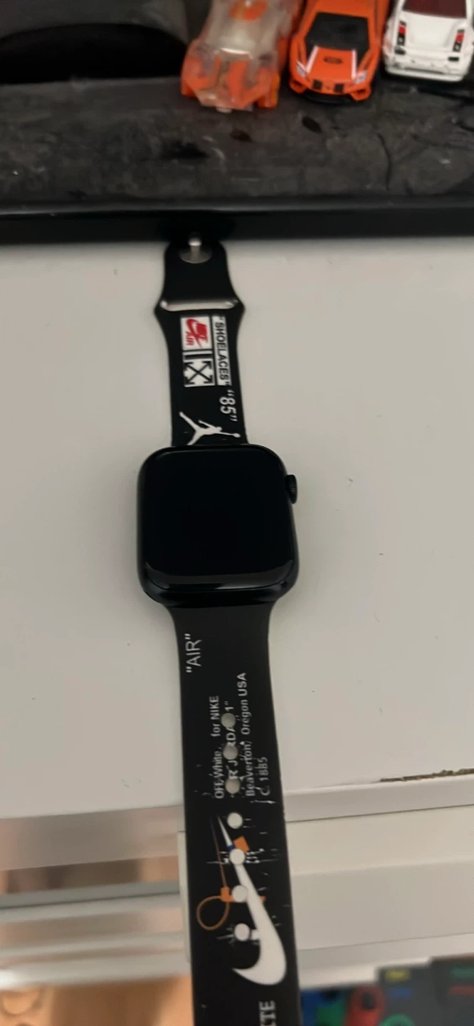 This is an series 7 Apple Watch with a custom Off-White x Nike band. It's a black model, perfect for tracking your fitness and staying connected. The band features "AIR" and "OFF-WHITE" branding with Nike graphics. It comes with a charging cable.