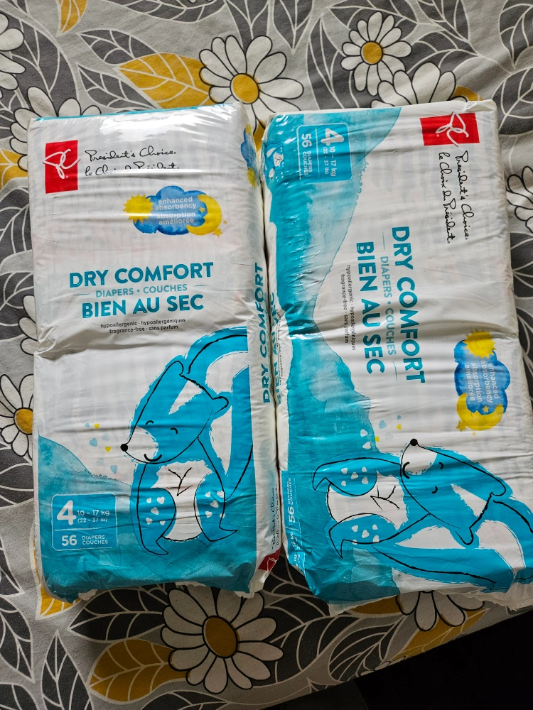 Two packs of President's Choice Dry Comfort Diapers size 4, 56 diapers per pack. Hypoallergenic, fragrance-free.