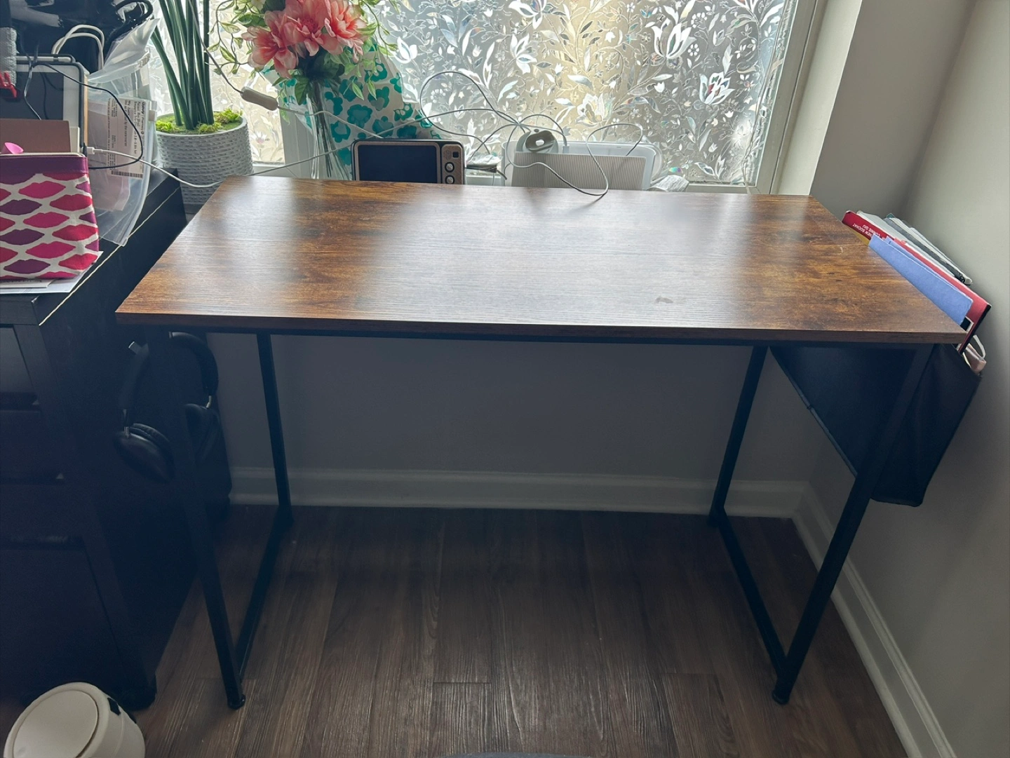 Selling a rustic brown desk! It features a convenient storage pocket on the side, perfect for keeping your workspace tidy.