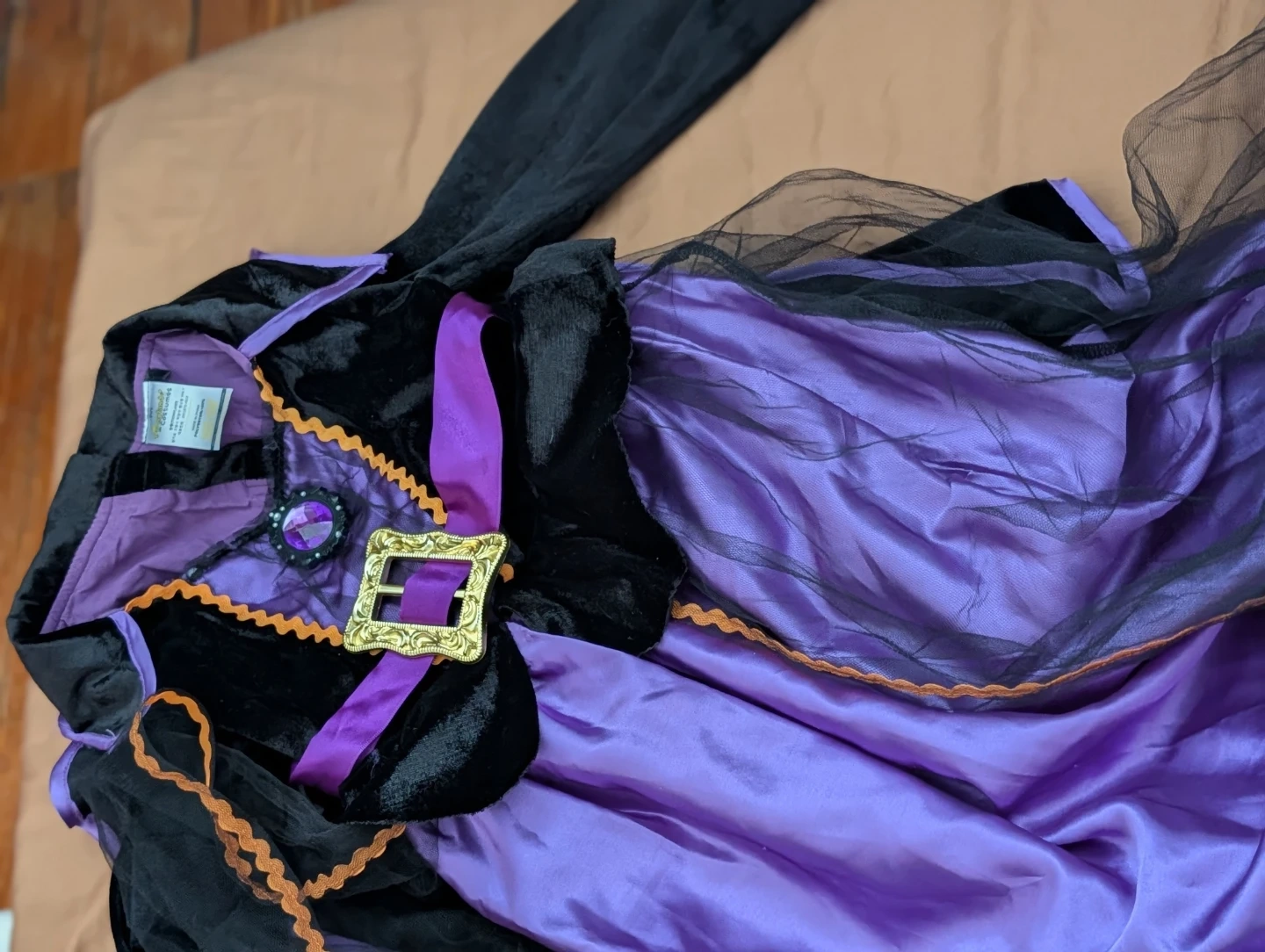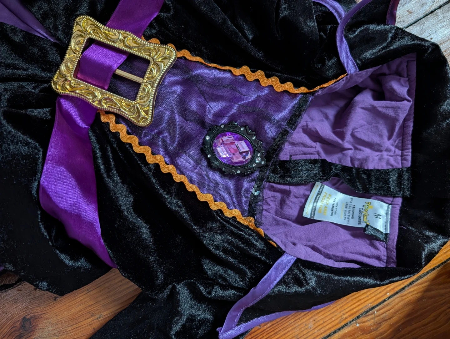 This child's witch costume dress is purple and black with a satin skirt. It features a purple sash with a gold buckle and a jewel detail on the bodice. Size medium.