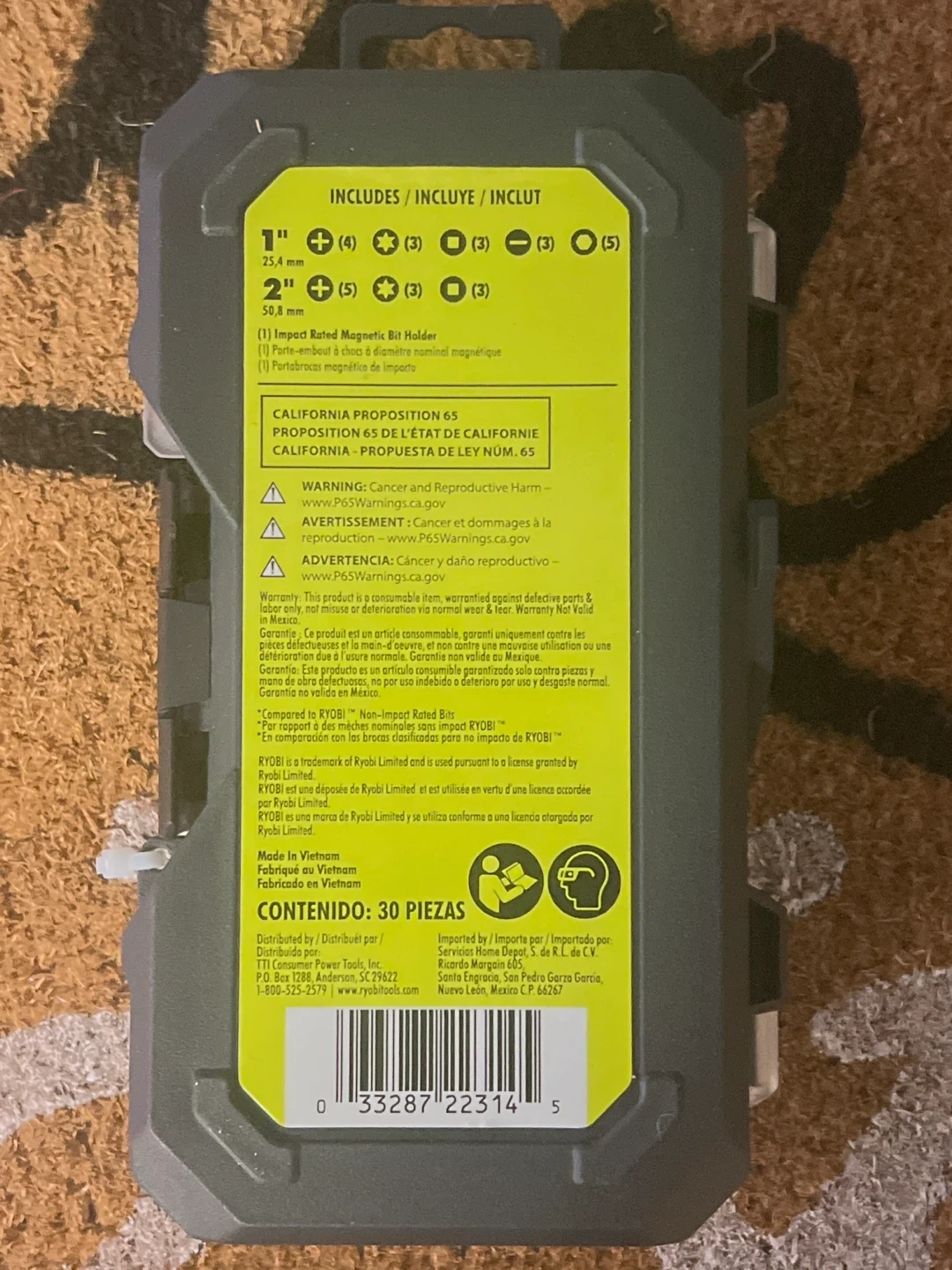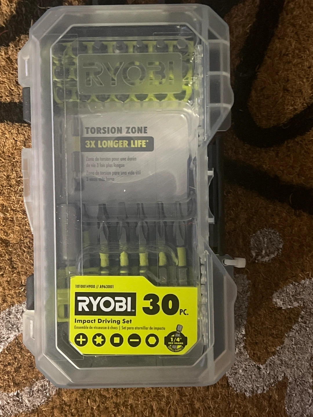 This Ryobi impact driving bit set includes 30 pieces. It features a torsion zone for 3x longer life. Bits are made in Vietnam.