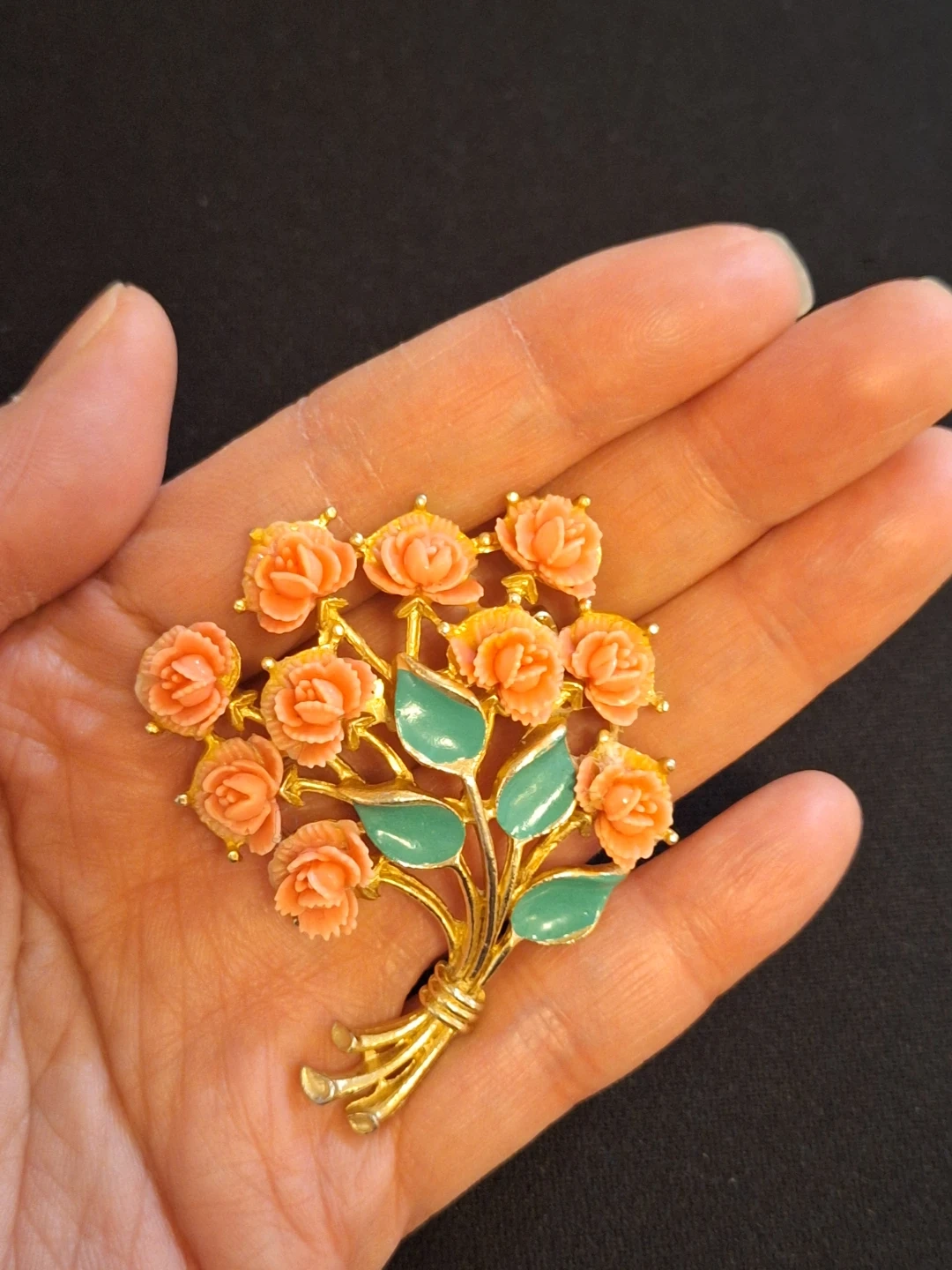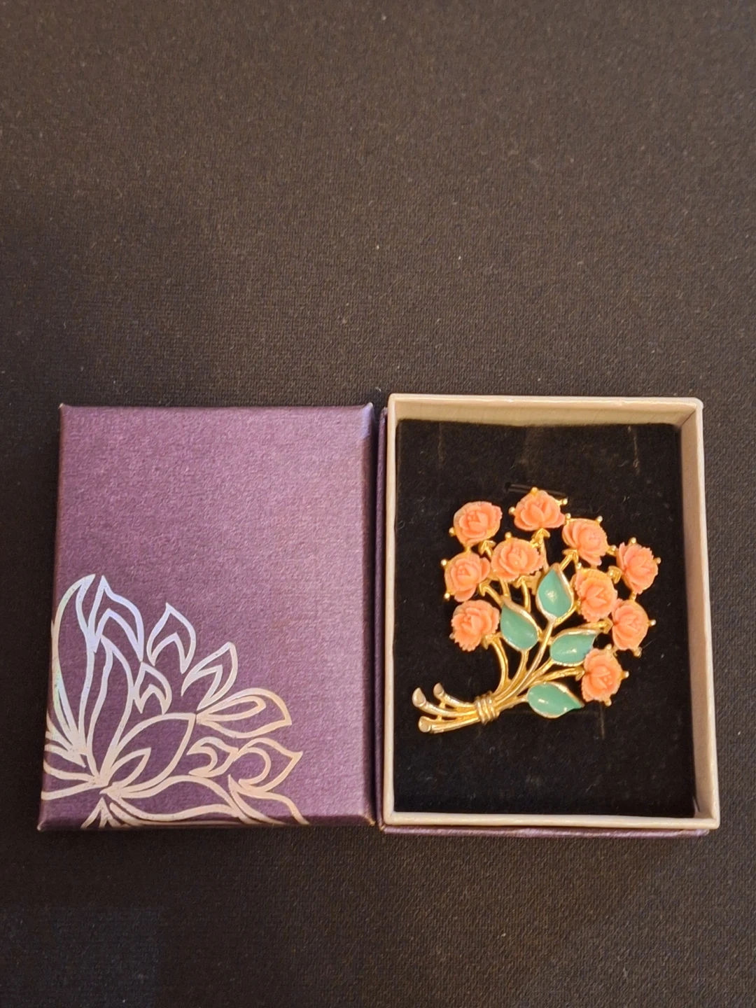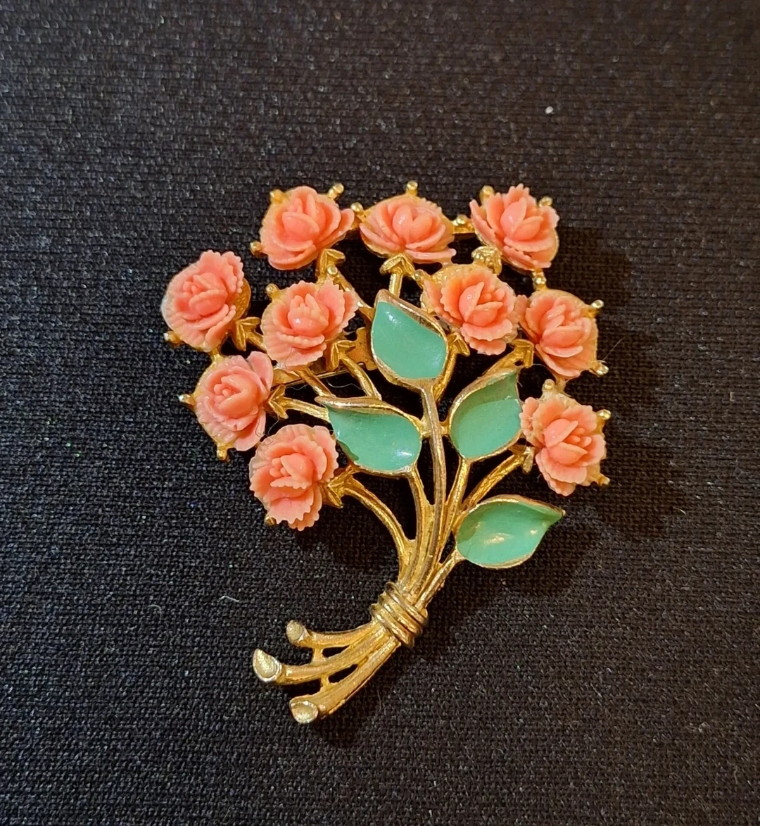A gold-tone metal brooch shaped like a bouquet of coral roses. It comes in a gift box.