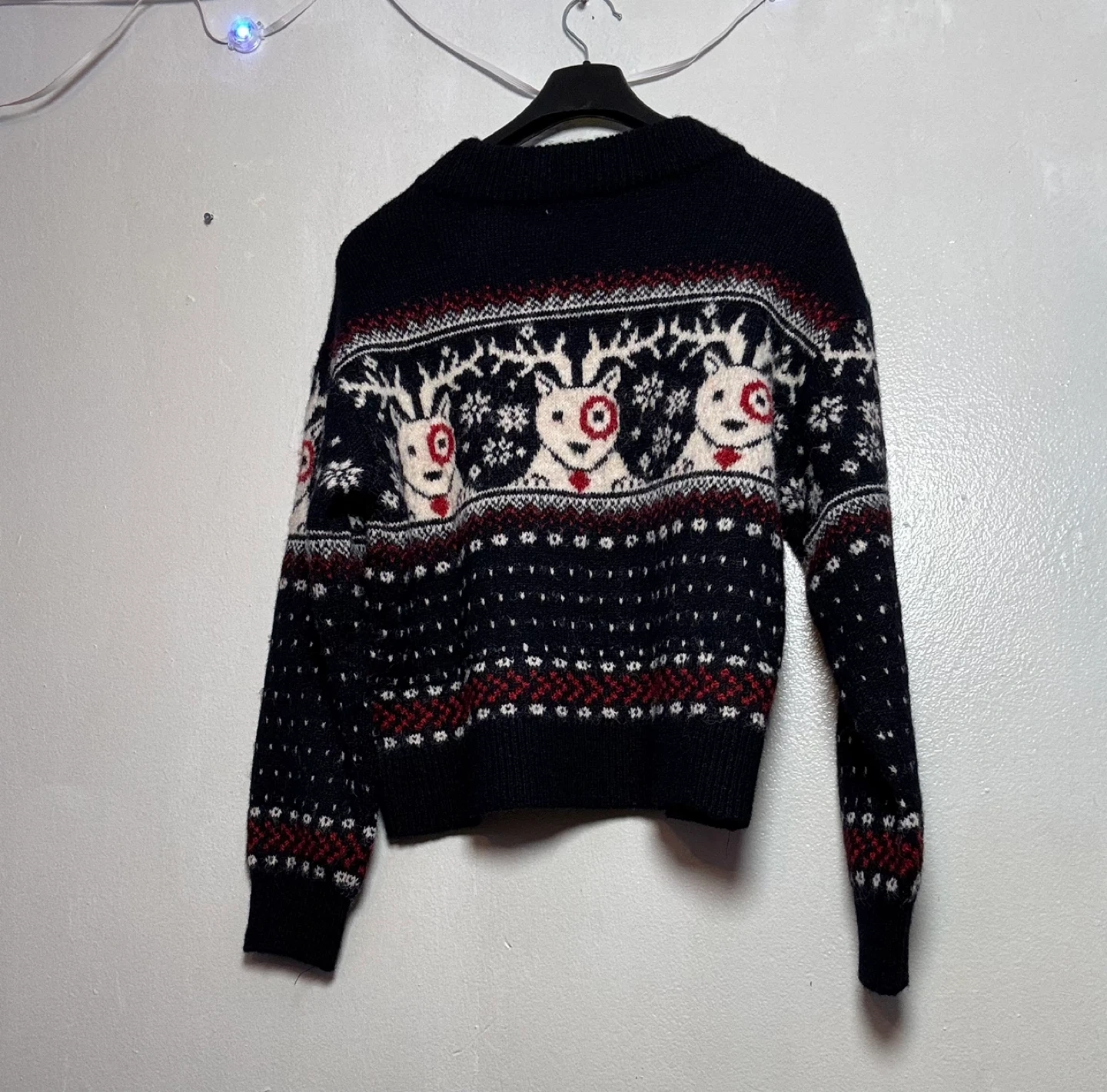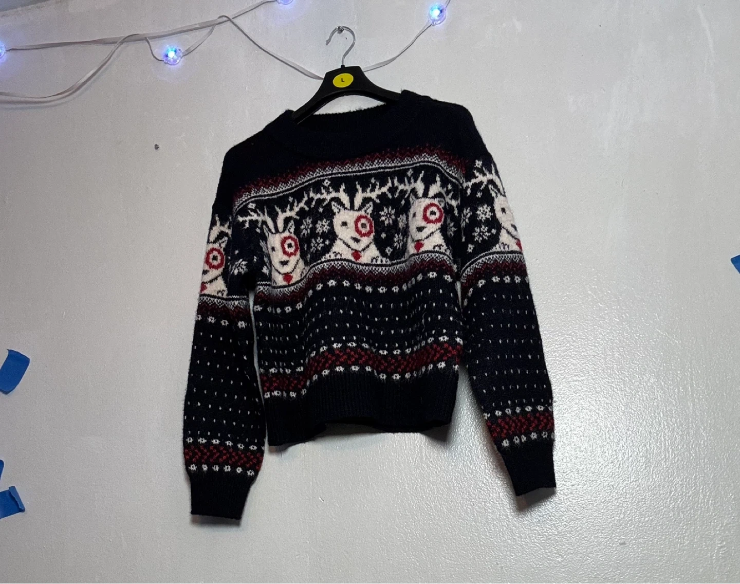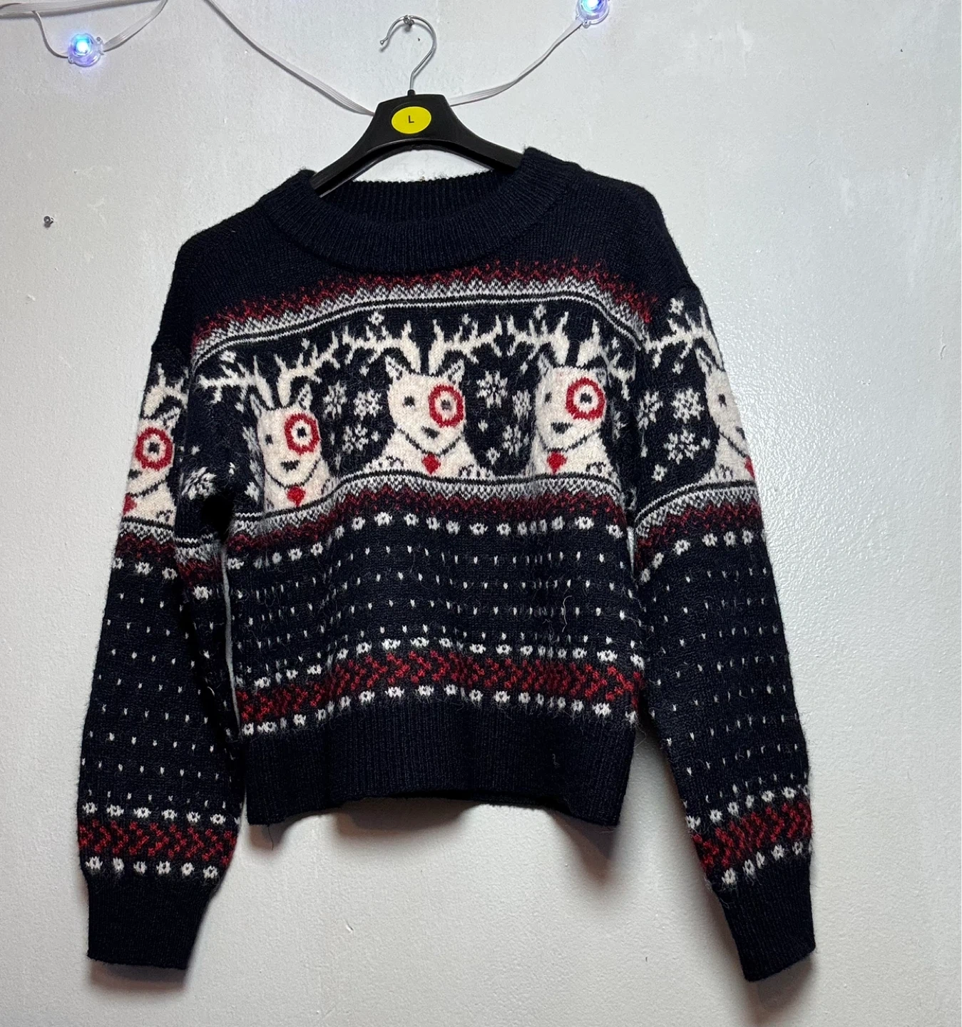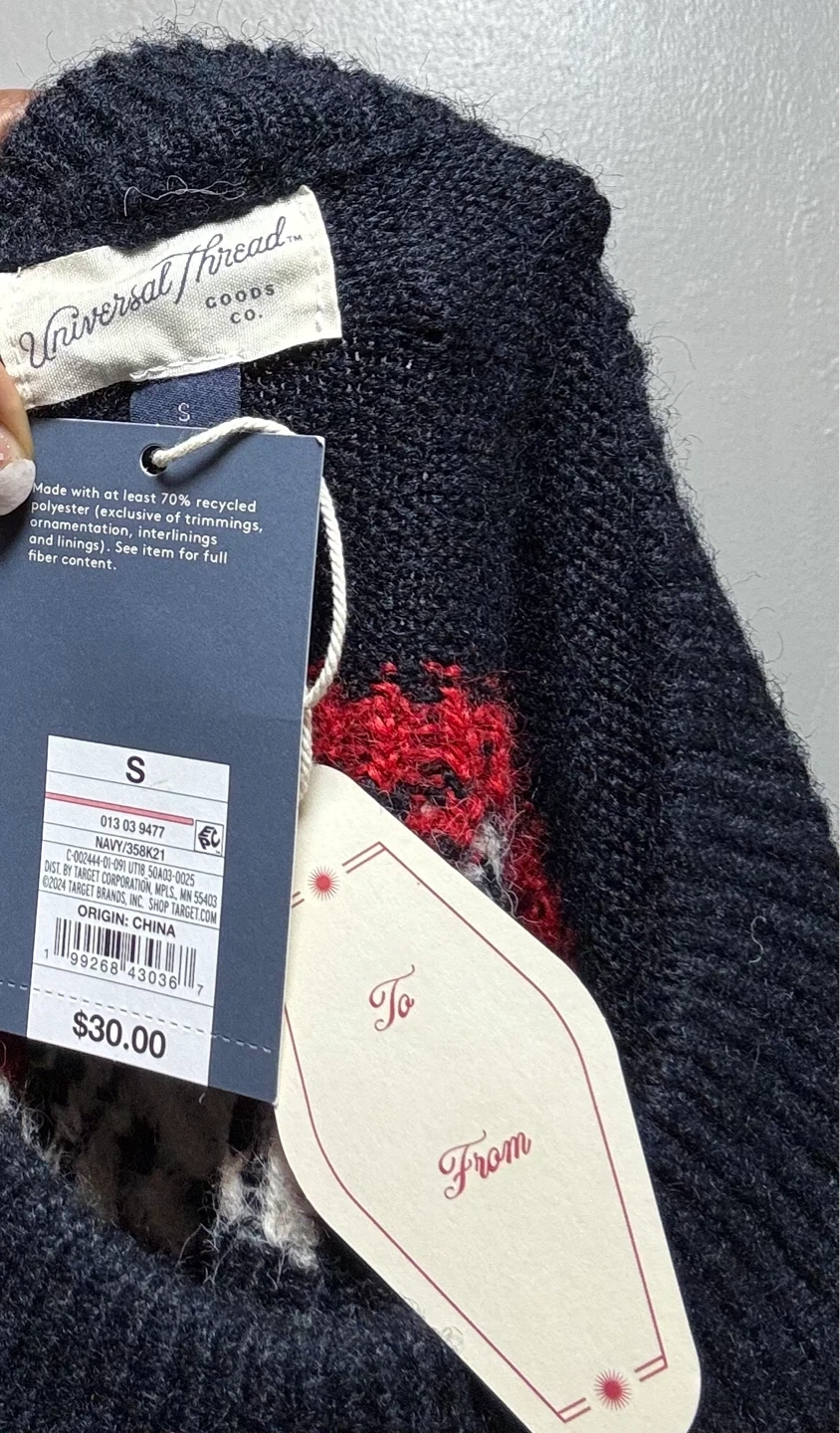 Cozy up in this festive Universal Thread navy Christmas sweater. It features a charming all-over reindeer and snowflake pattern with red and white accents. Made with at least 70% recycled polyester. Size S.