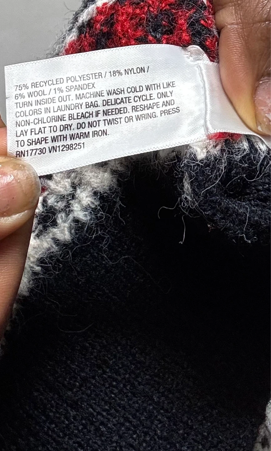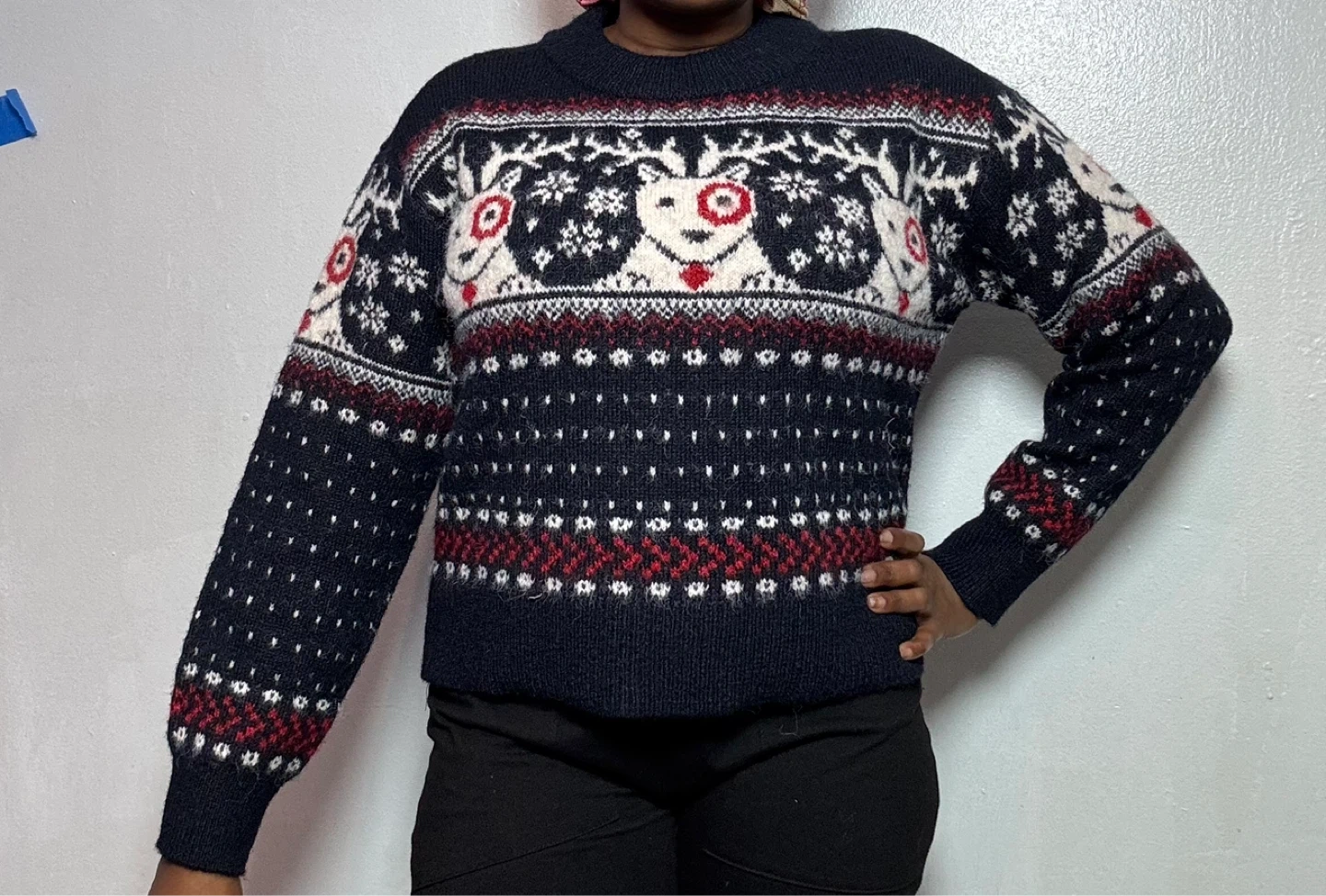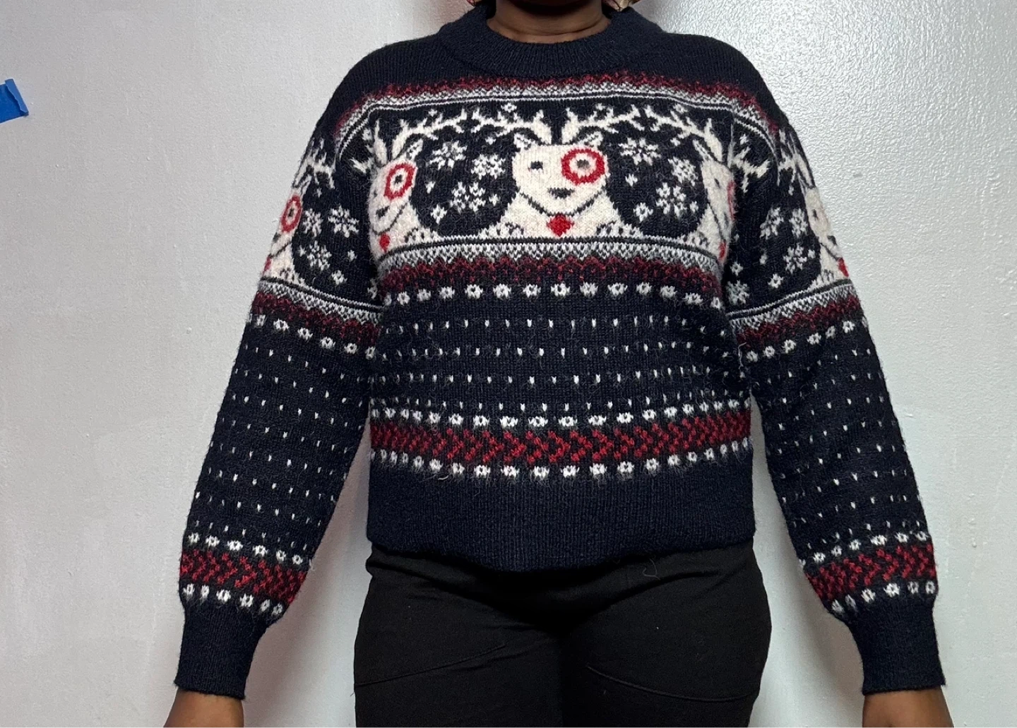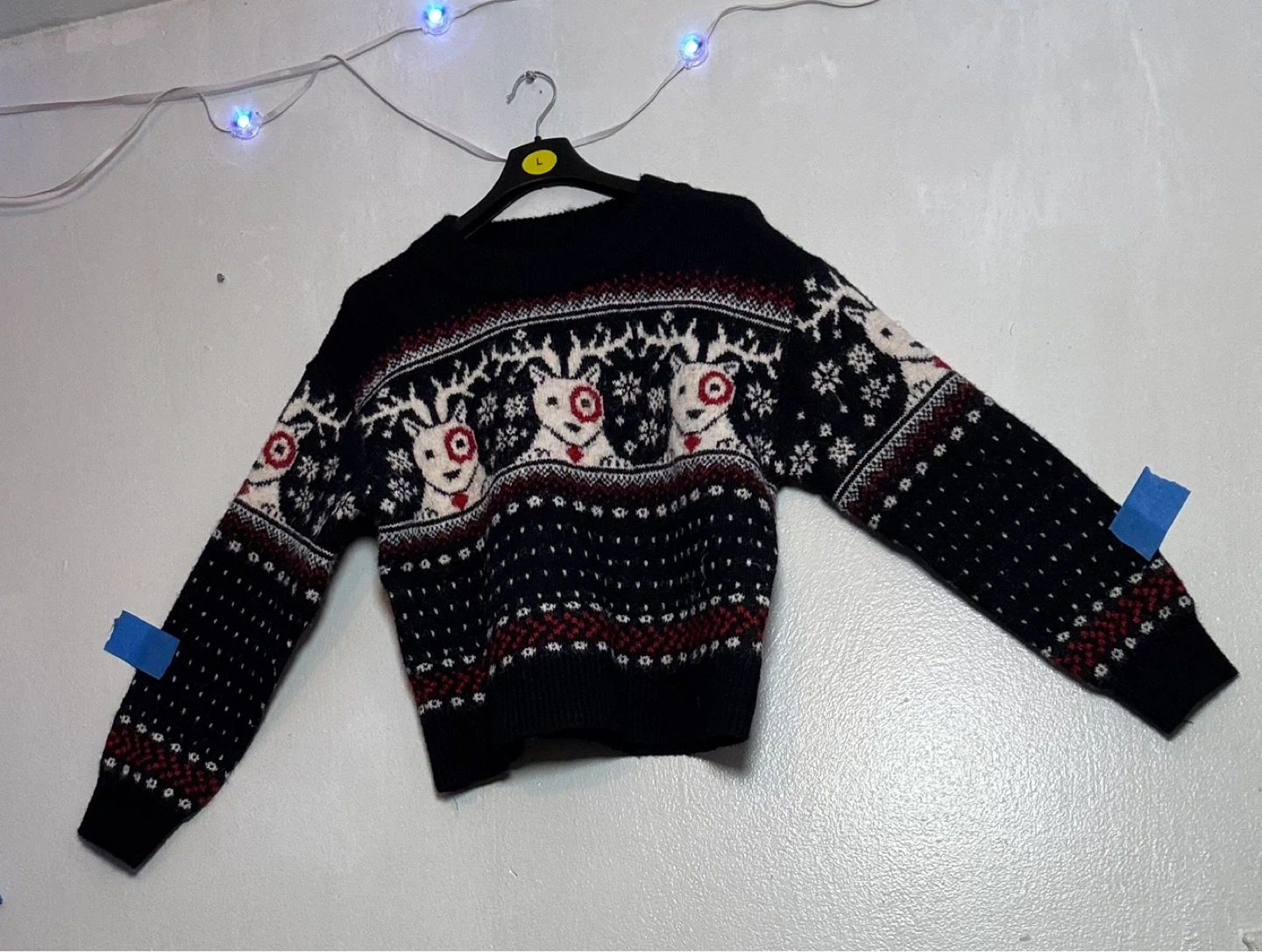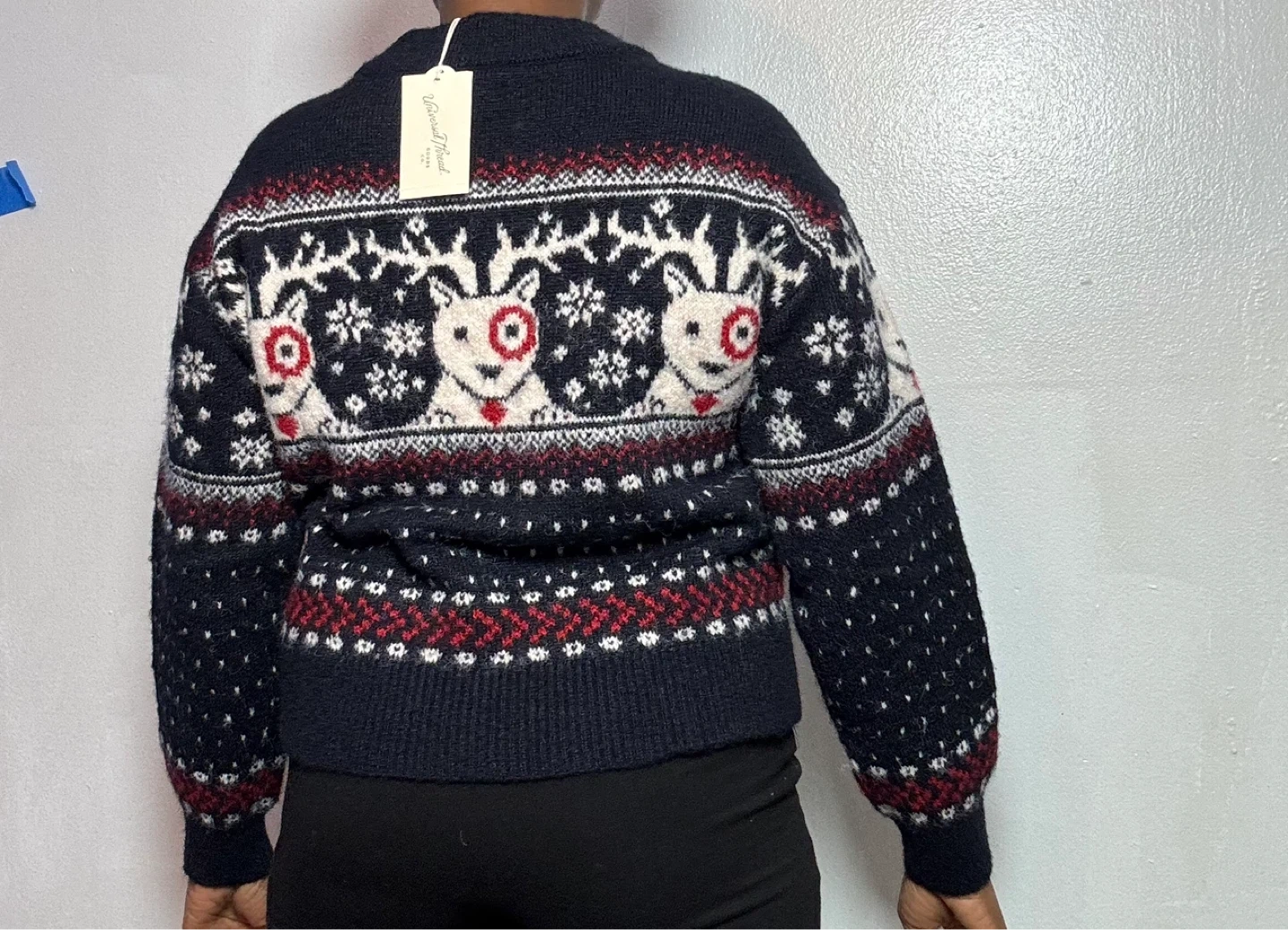 Cozy up in this festive Universal Thread navy Christmas sweater. It features a charming all-over reindeer and snowflake pattern with red and white accents. Made with at least 70% recycled polyester. Size S.