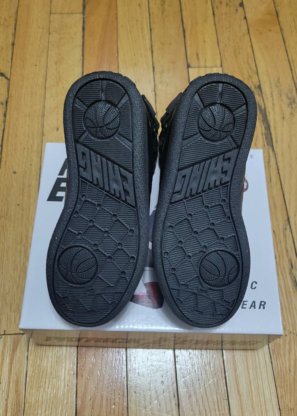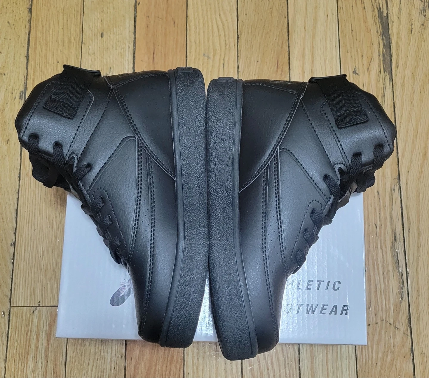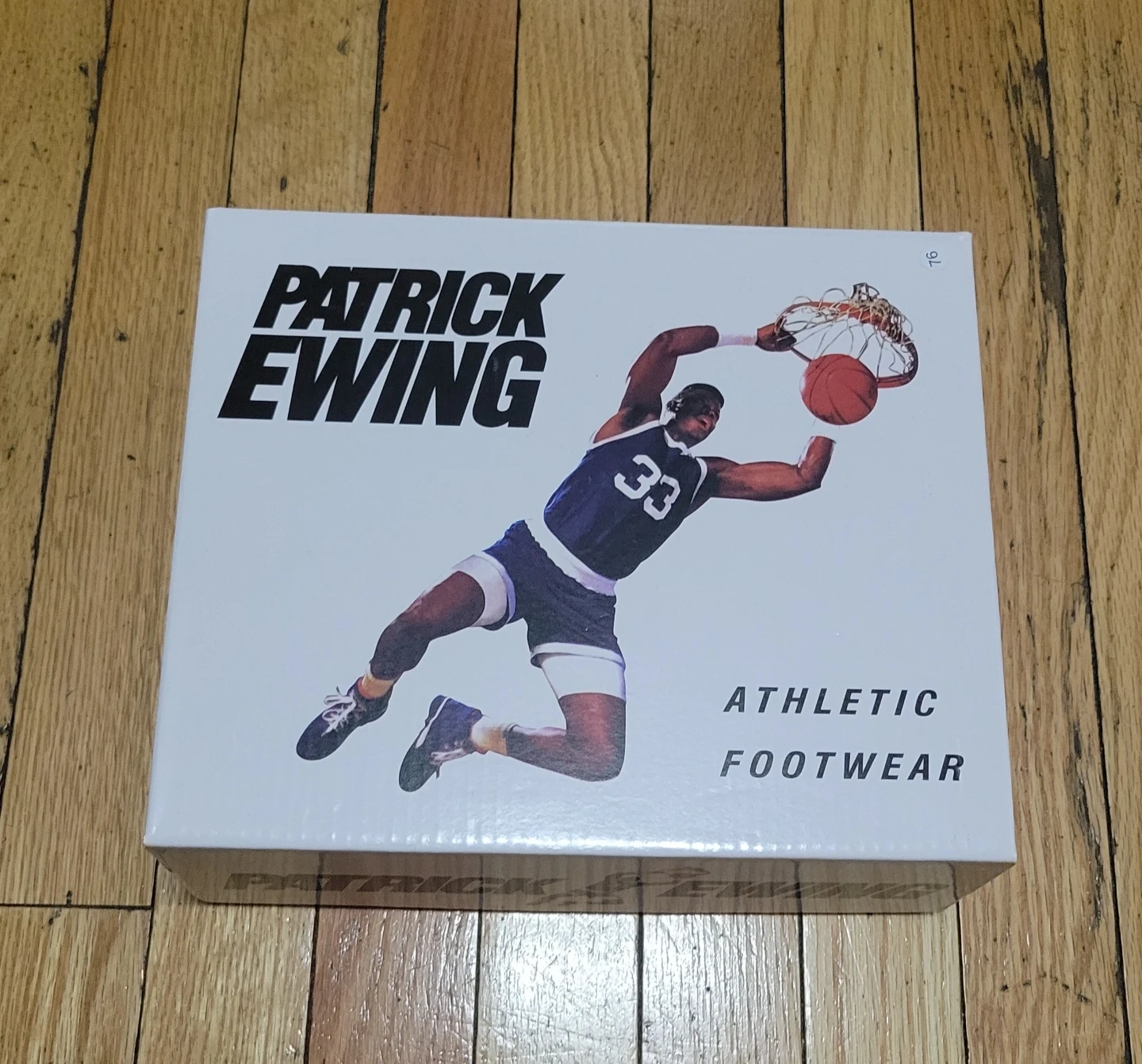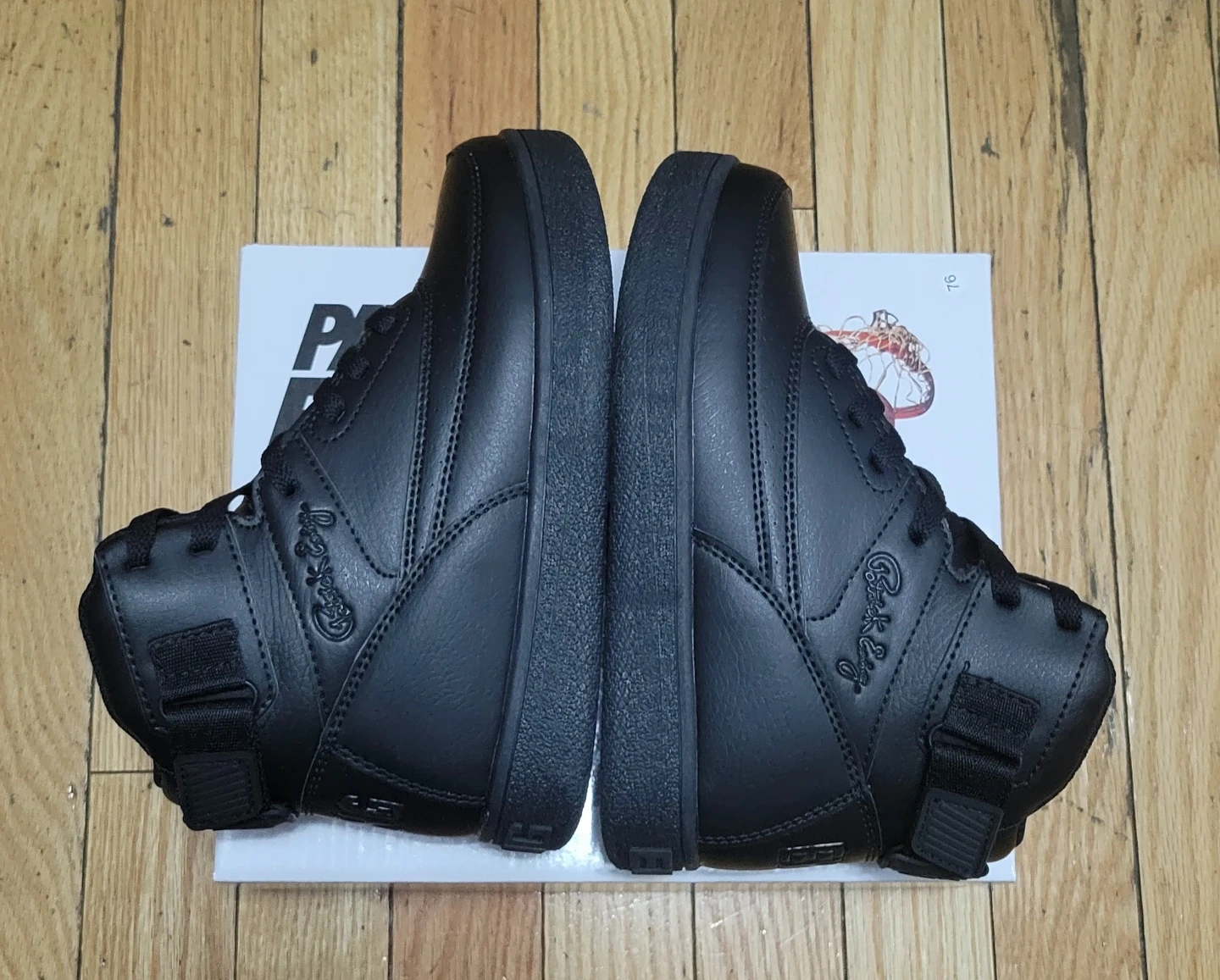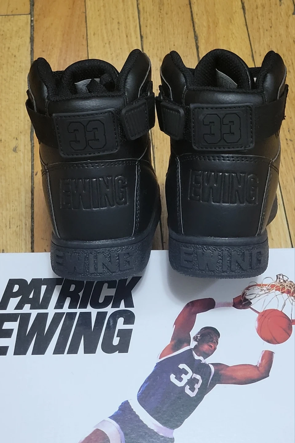 Patrick Ewing athletic footwear in black. Features a synthetic upper, lining, and sock textile with a TPR outsole. Includes original box.