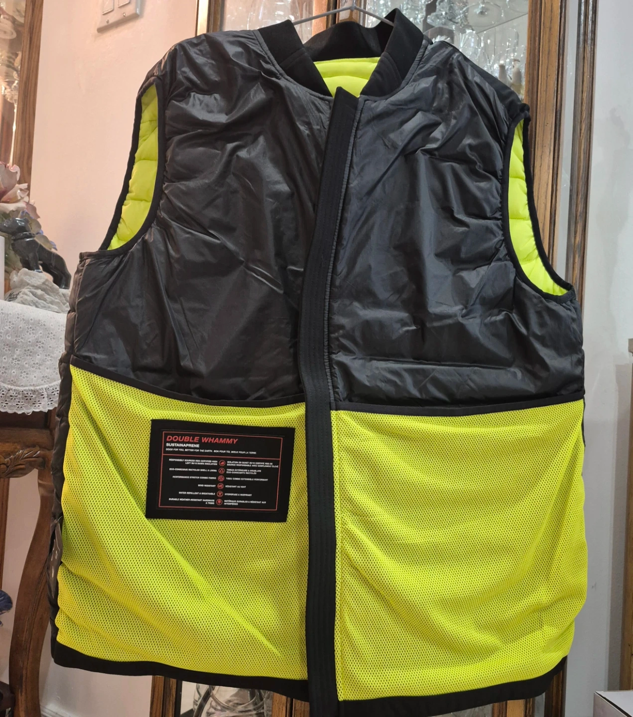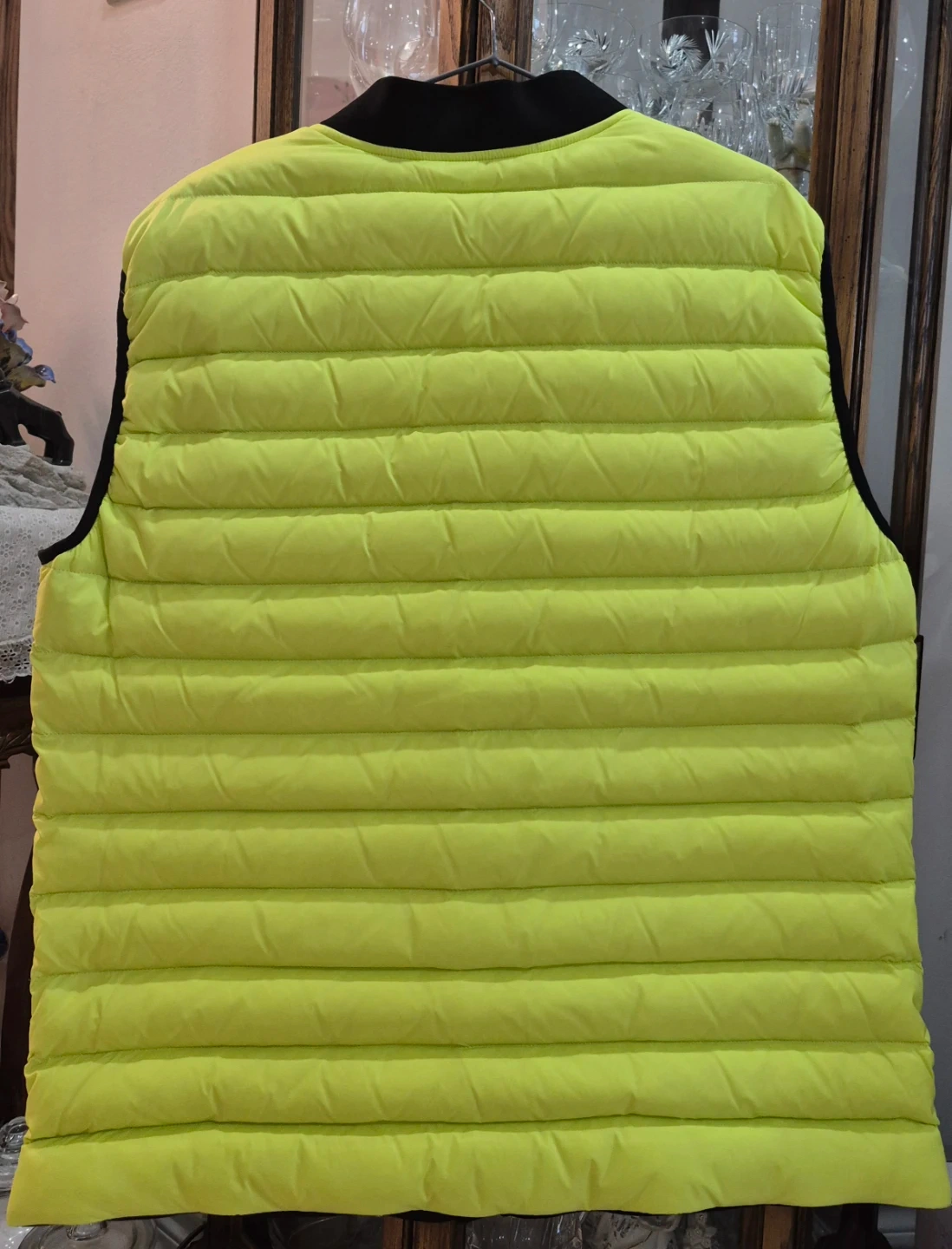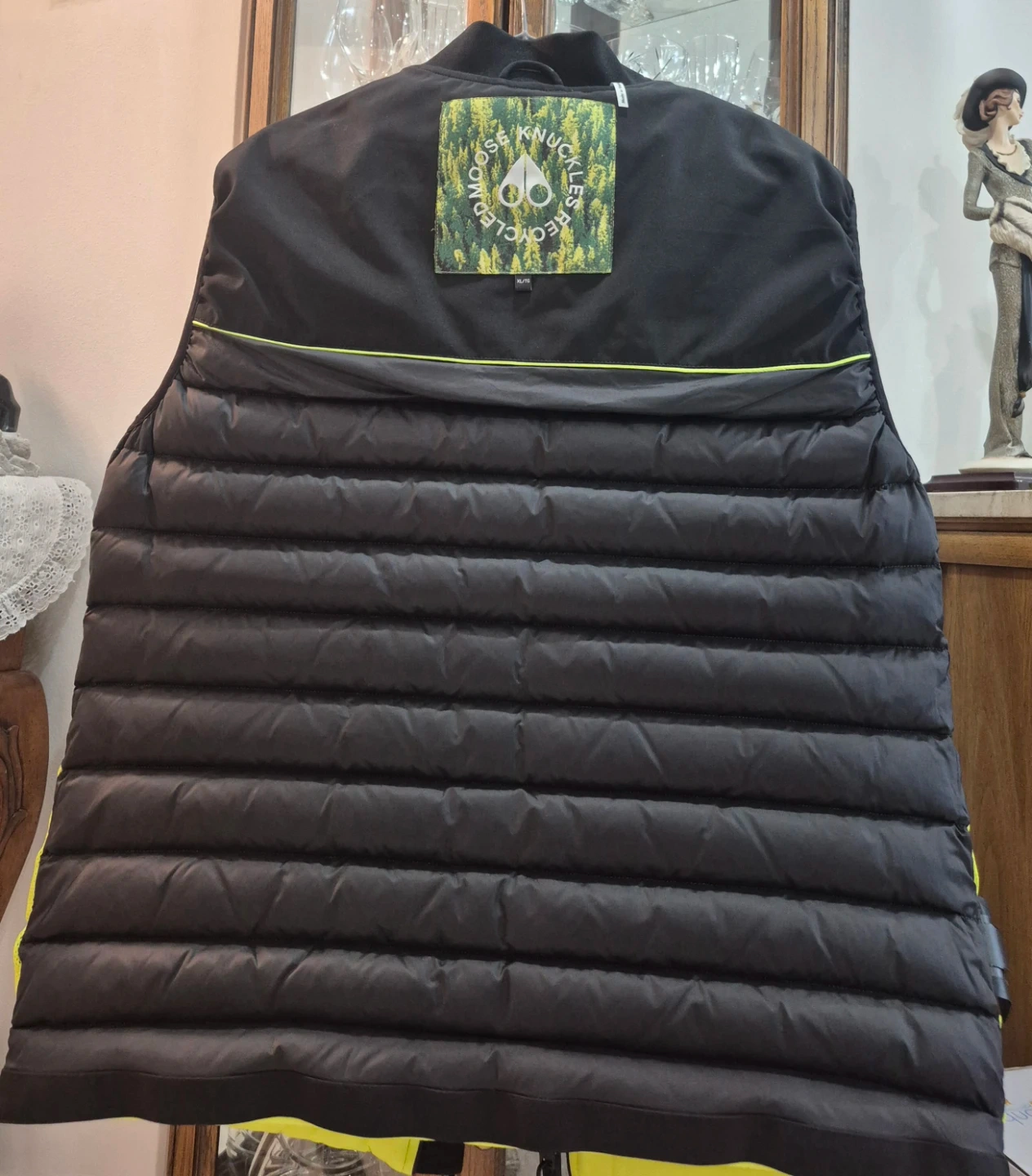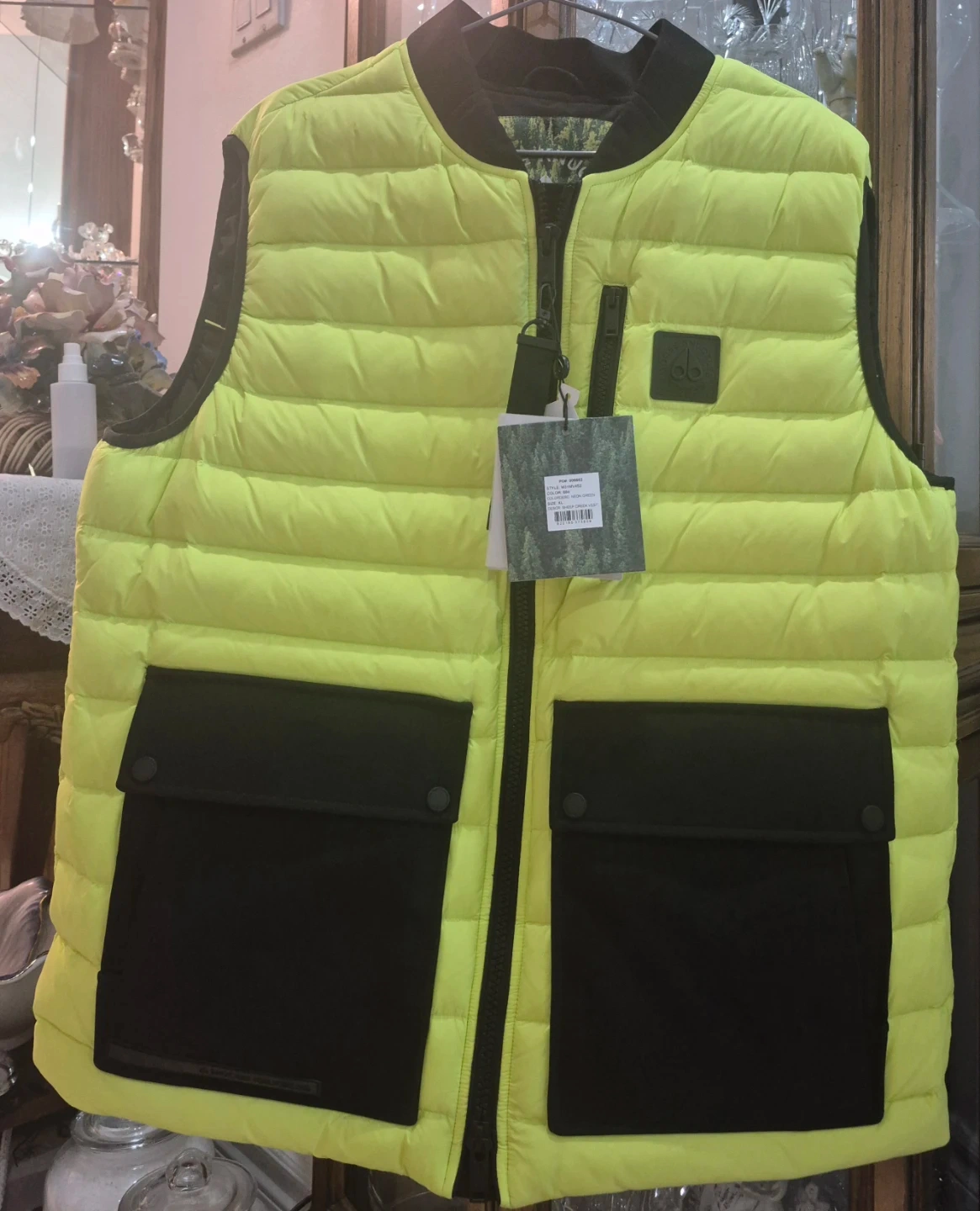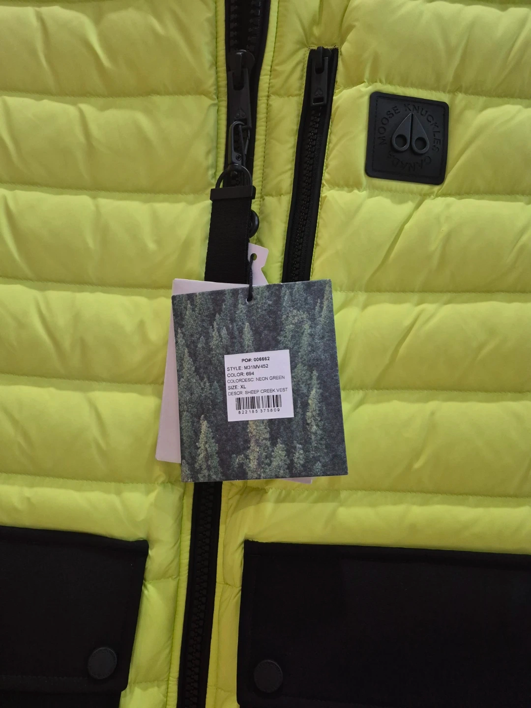 This is a Moose Knuckles Sheep Creek Vest in neon green. It's a size XL. Features two black button-snap pockets on the front and a full zip closure.