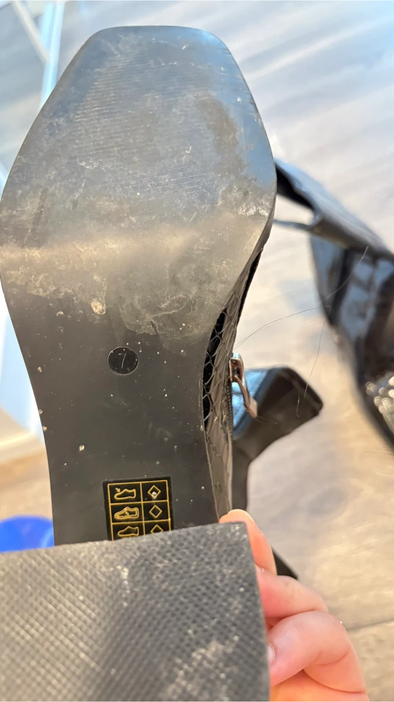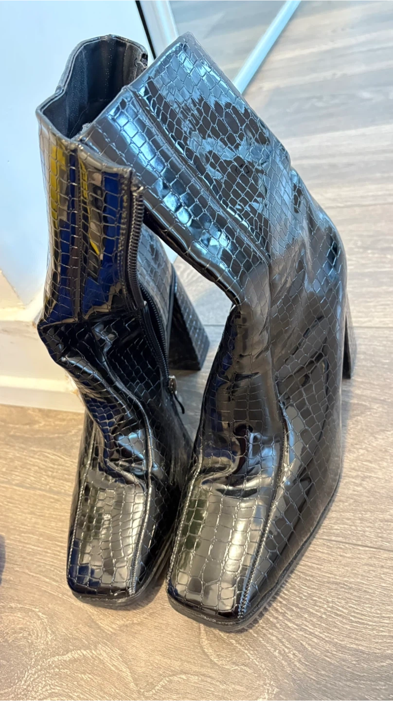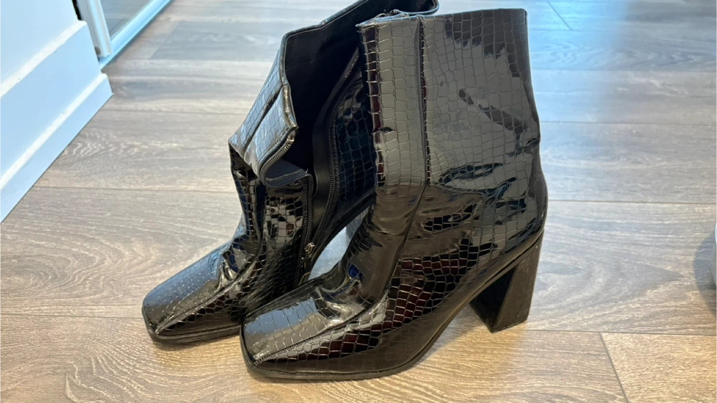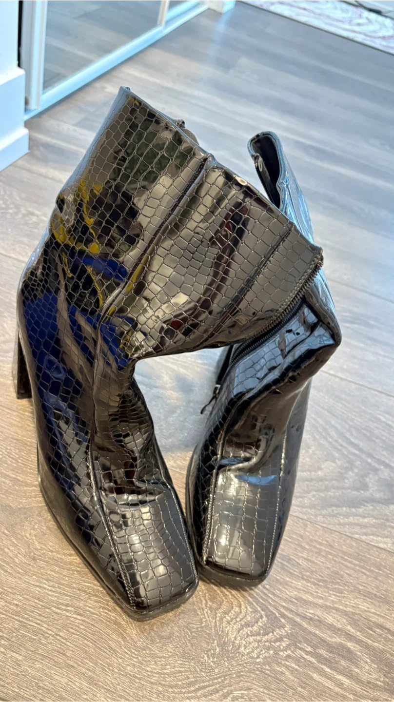 Stylish black ankle boots with a croc embossed finish and a block heel. Features a side zipper for easy wear. Size is 7.