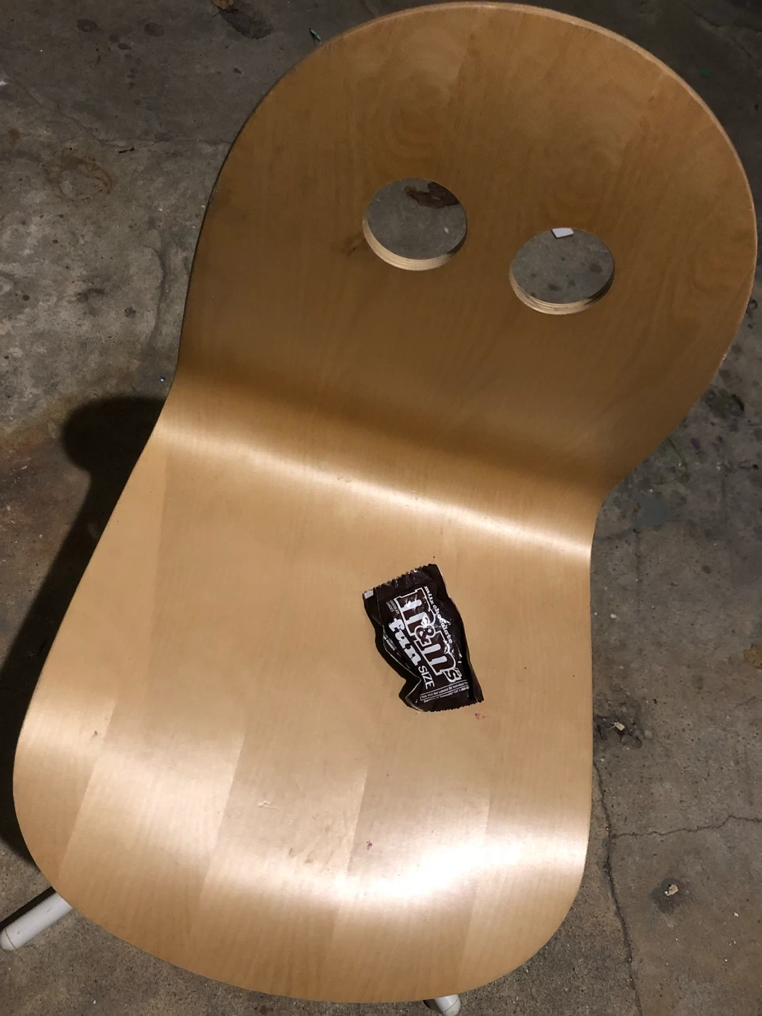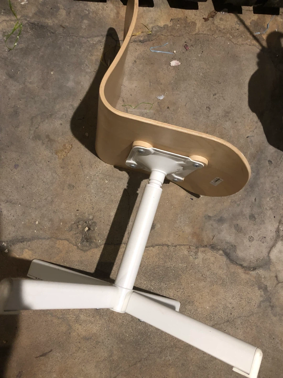 This modern desk chair features a molded wood seat with two circular cutouts. It's designed with a comfortable, curved backrest and a white adjustable swivel base with casters for easy mobility. Wood construction with a metal and plastic base.