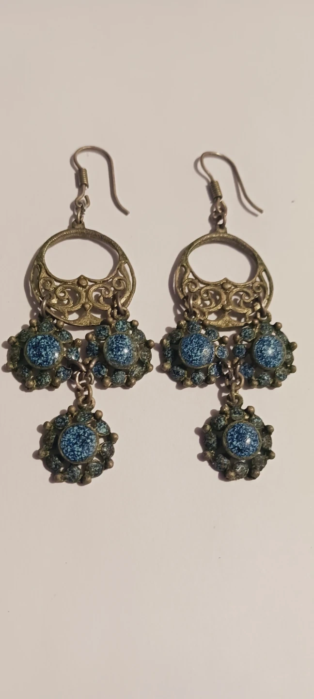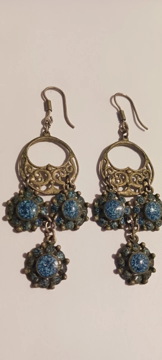 Gorgeous Vintage Bohemian dangle earrings featuring intricate metalwork with blue speckled accents. They're designed with a hook backing for easy wear. The detailed craftsmanship adds a unique touch!!! 2.5"×1". Excellent condition. ALL MY PRICES ARE NEGOTIABLE !!