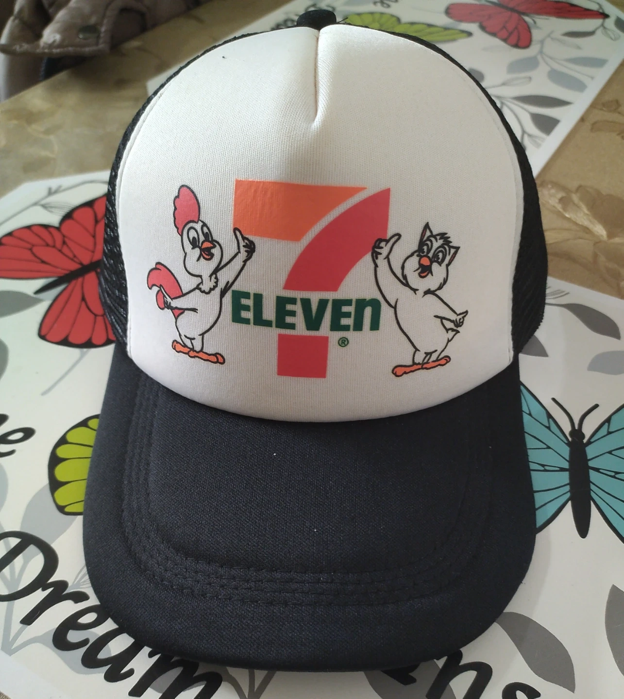 This is a 7-Eleven trucker hat. It's white with a black bill and black mesh back. The front panel features the 7-Eleven logo with two cartoon characters.